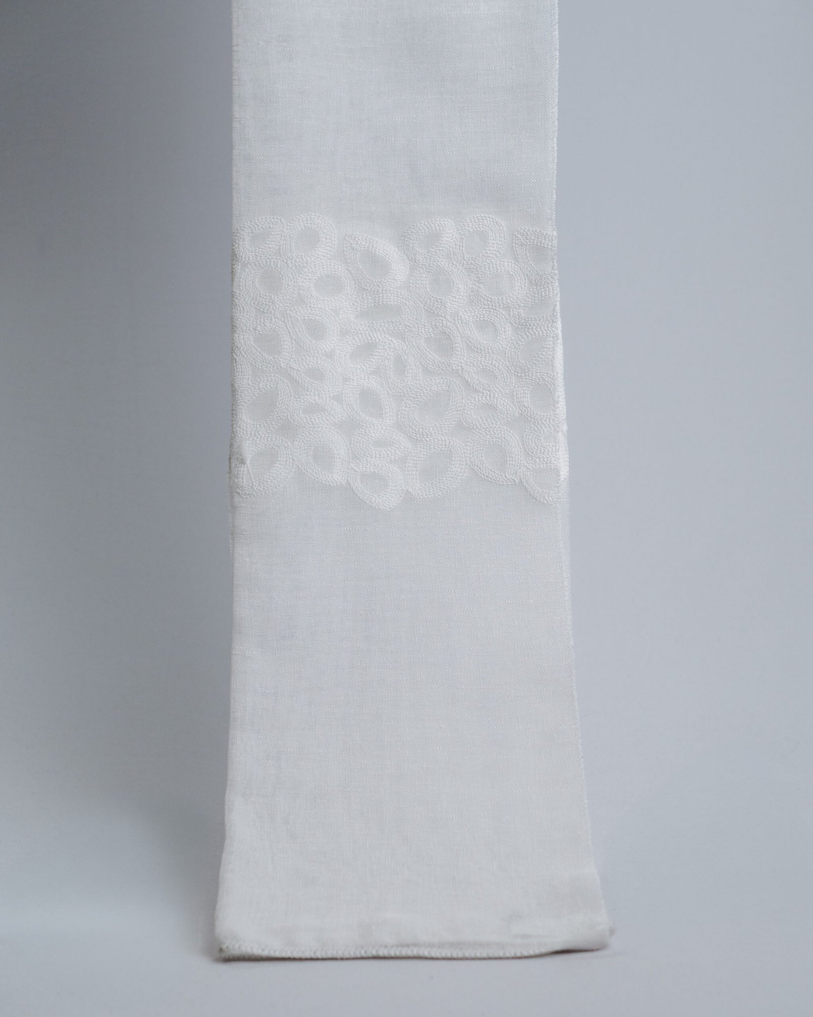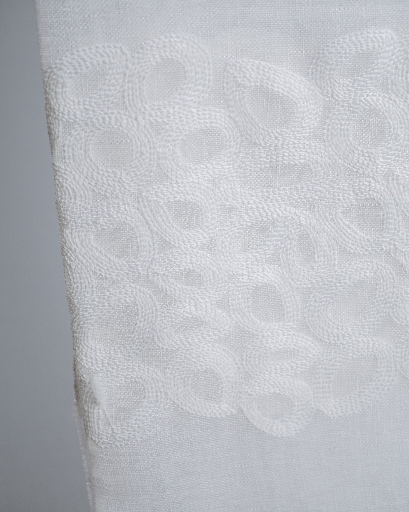 This premium sheer curtain is crafted with a refined, lightweight weave, enhanced by an elegant band of embroidered oval motifs that add subtle dimension. Its soft translucency gently filters natural light, creating a calm, luminous atmosphere. The understated detailing offers a perfect balance of texture and minimalism, elevating both modern and classic interiors.