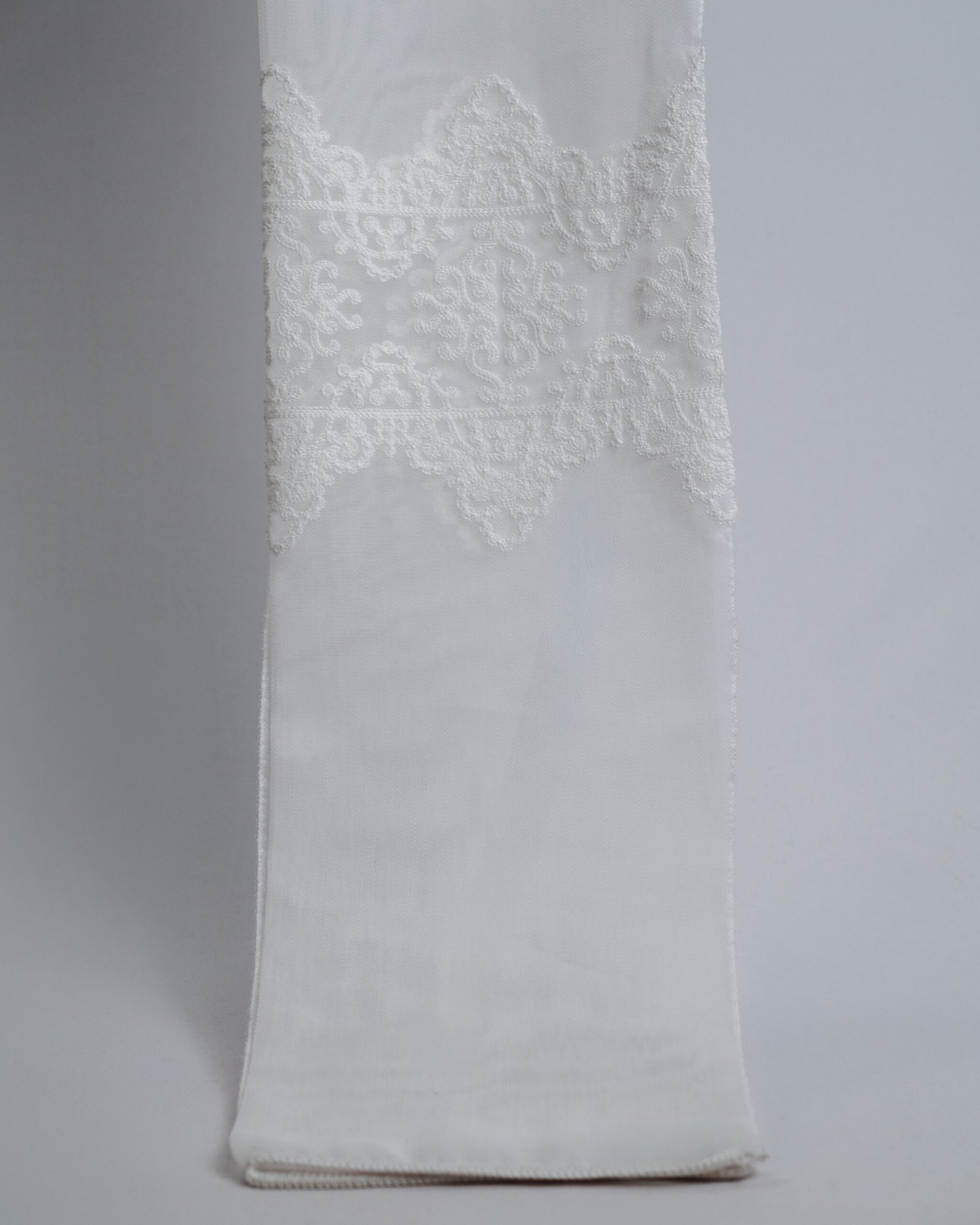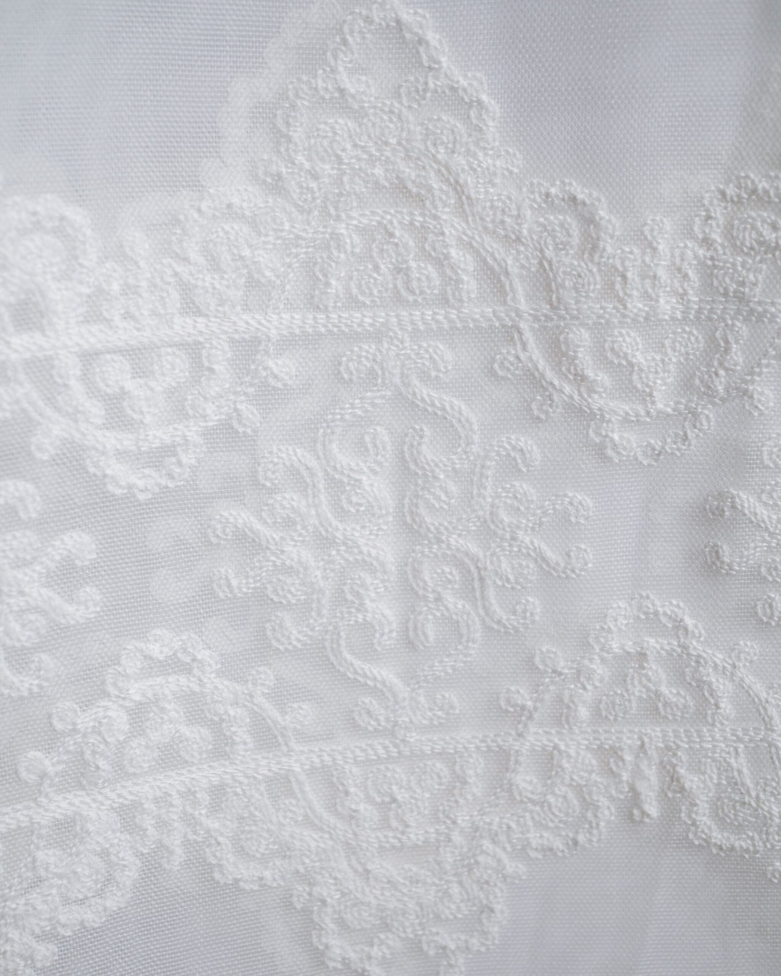 An exquisite sheer curtain adorned with an ornate embroidered band, showcasing intricate detailing and timeless elegance. Its delicate translucency softly diffuses light, bringing a refined, luxurious ambiance to any space.