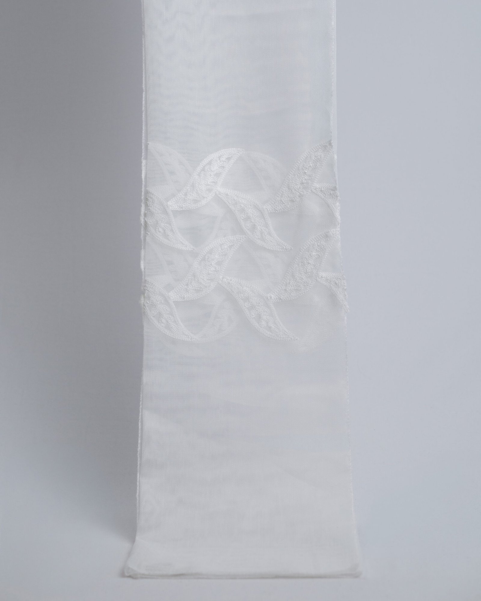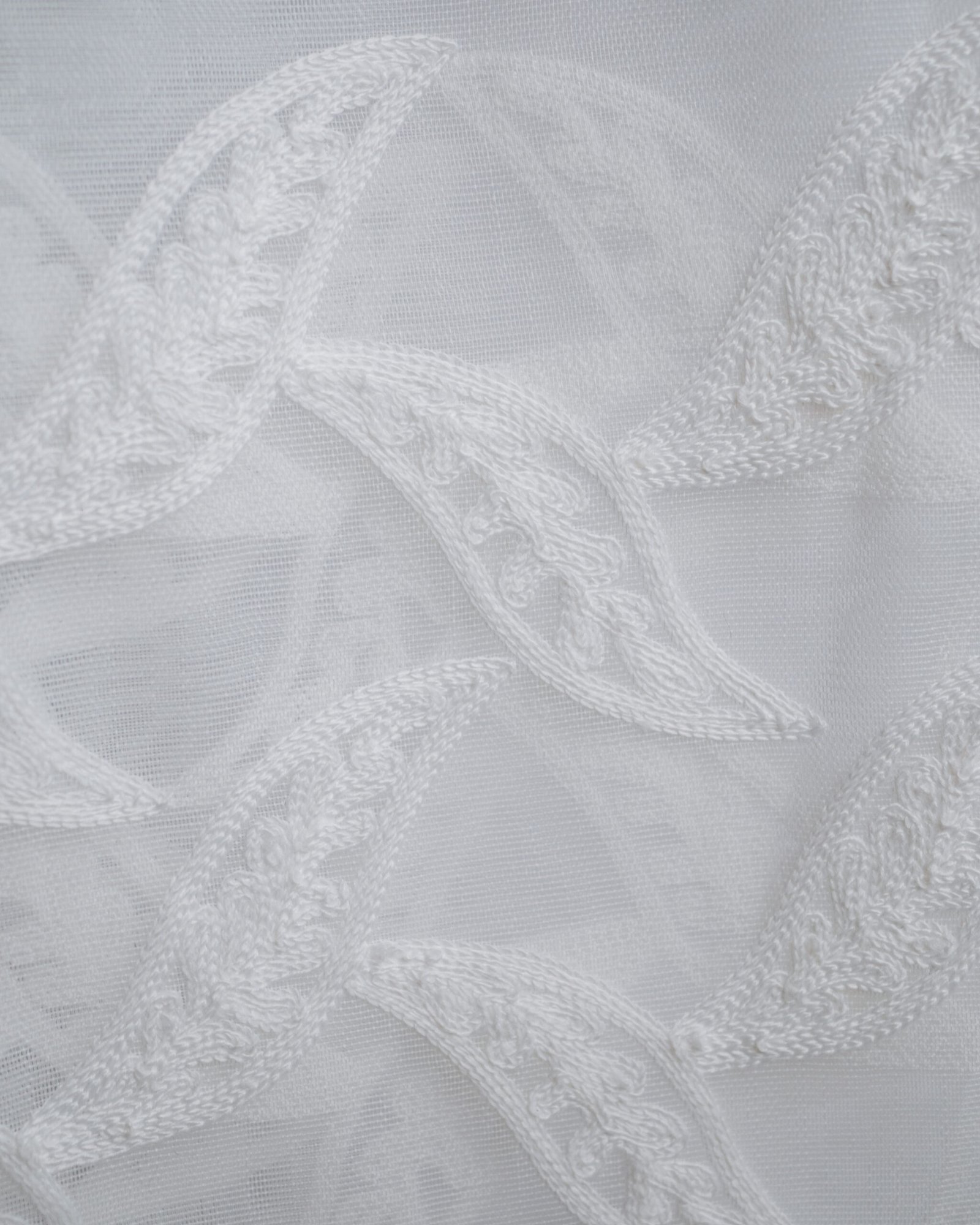 This elegant sheer curtain is distinguished by a delicately embroidered band featuring interwoven motifs, adding depth and a refined decorative touch. The lightweight, translucent fabric allows light to filter through beautifully, creating a soft, luminous ambiance. Its graceful drape and intricate detailing evoke a sense of understated luxury, perfect for sophisticated interiors.