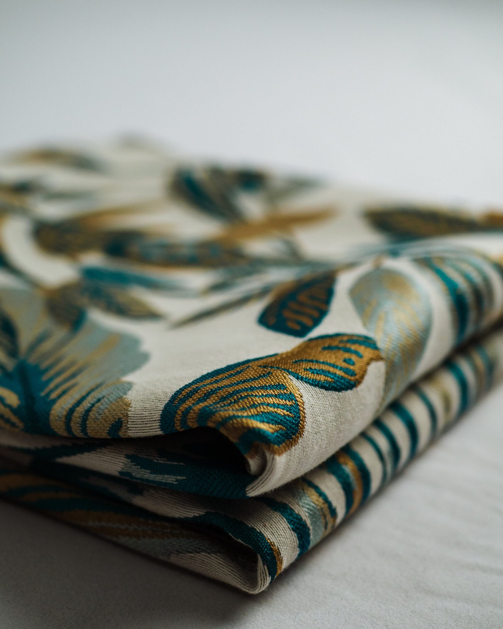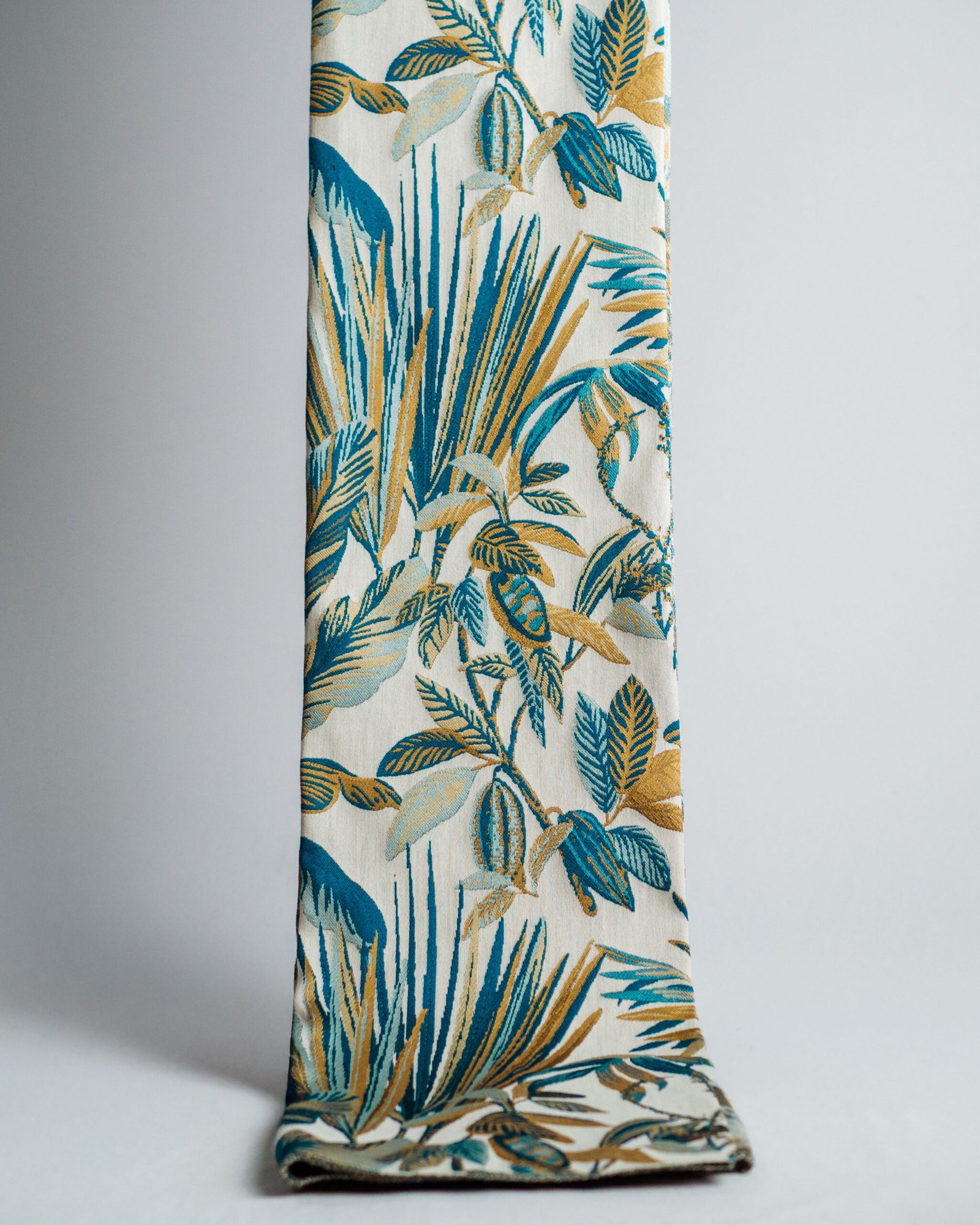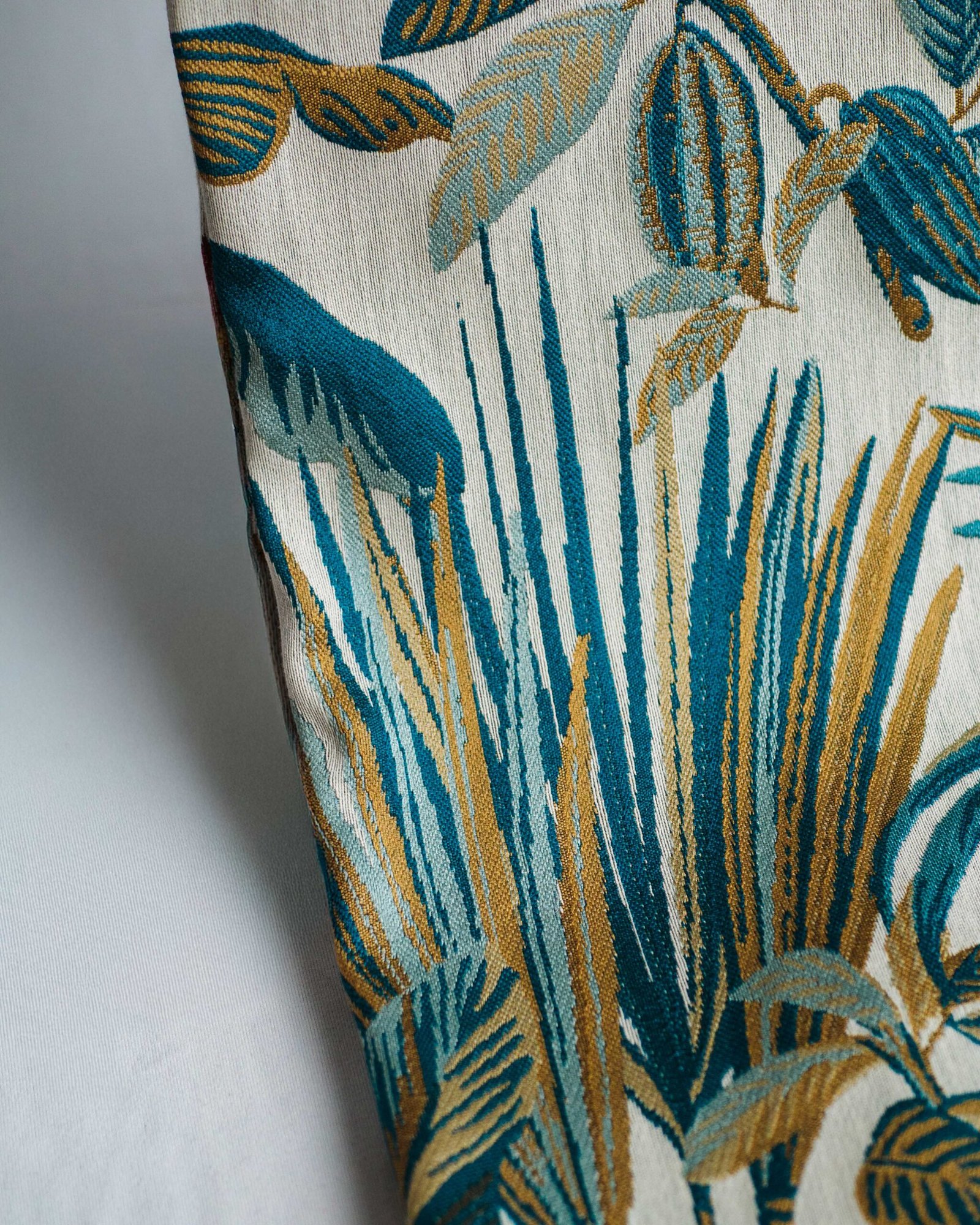 This curtain features an elegant botanical design woven in layered teal and warm golden tones on a soft, light base. The rich texture and painterly detailing create a sense of depth and movement, bringing a sophisticated, resort-inspired elegance to refined living spaces.