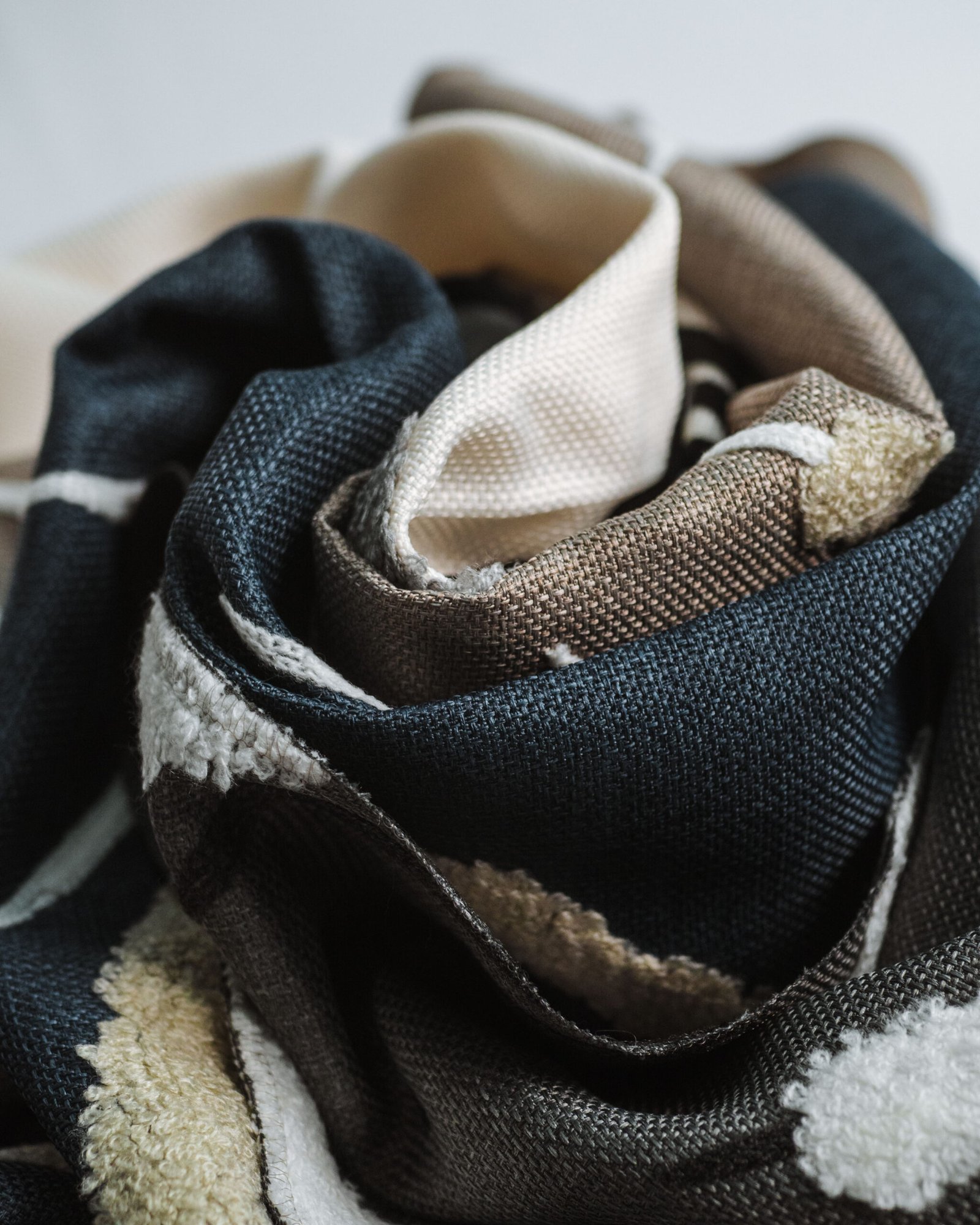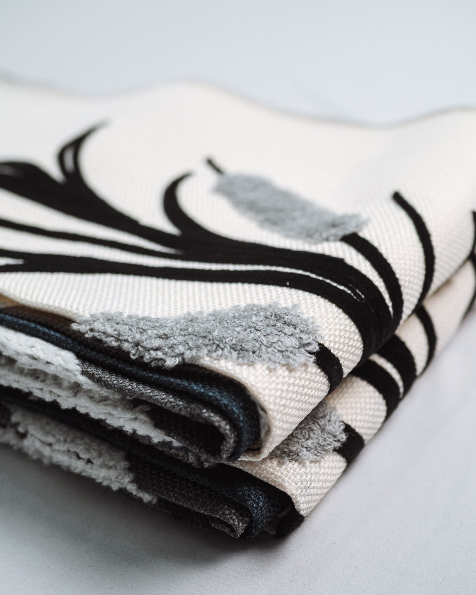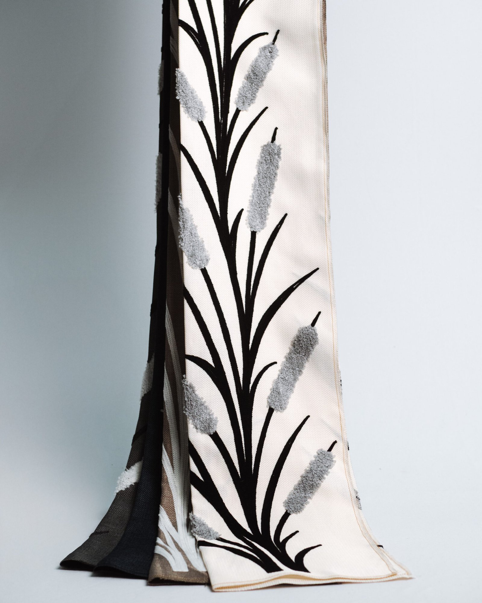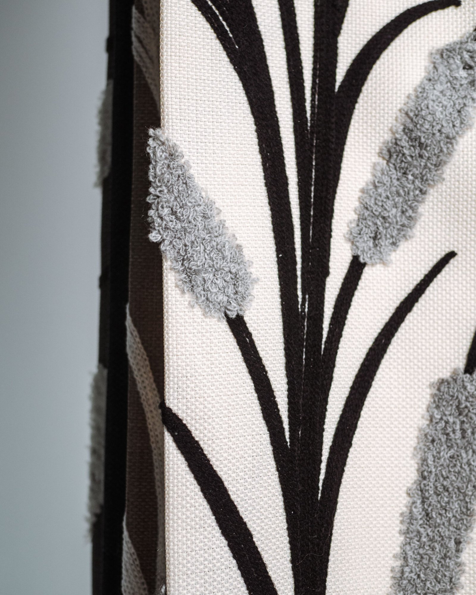 This elegant curtain features a soft ivory base accented with sculptural black reeds and plush silver chenille florals, creating a refined contrast of matte and velvet-like textures. The dimensional pattern adds depth and movement, delivering a boutique-hotel finish that feels both artistic and luxuriously modern.