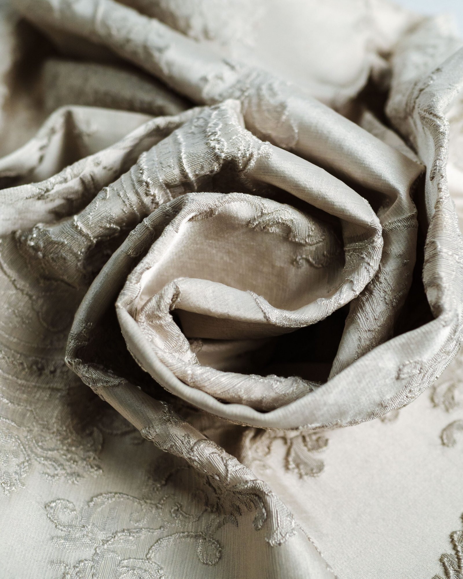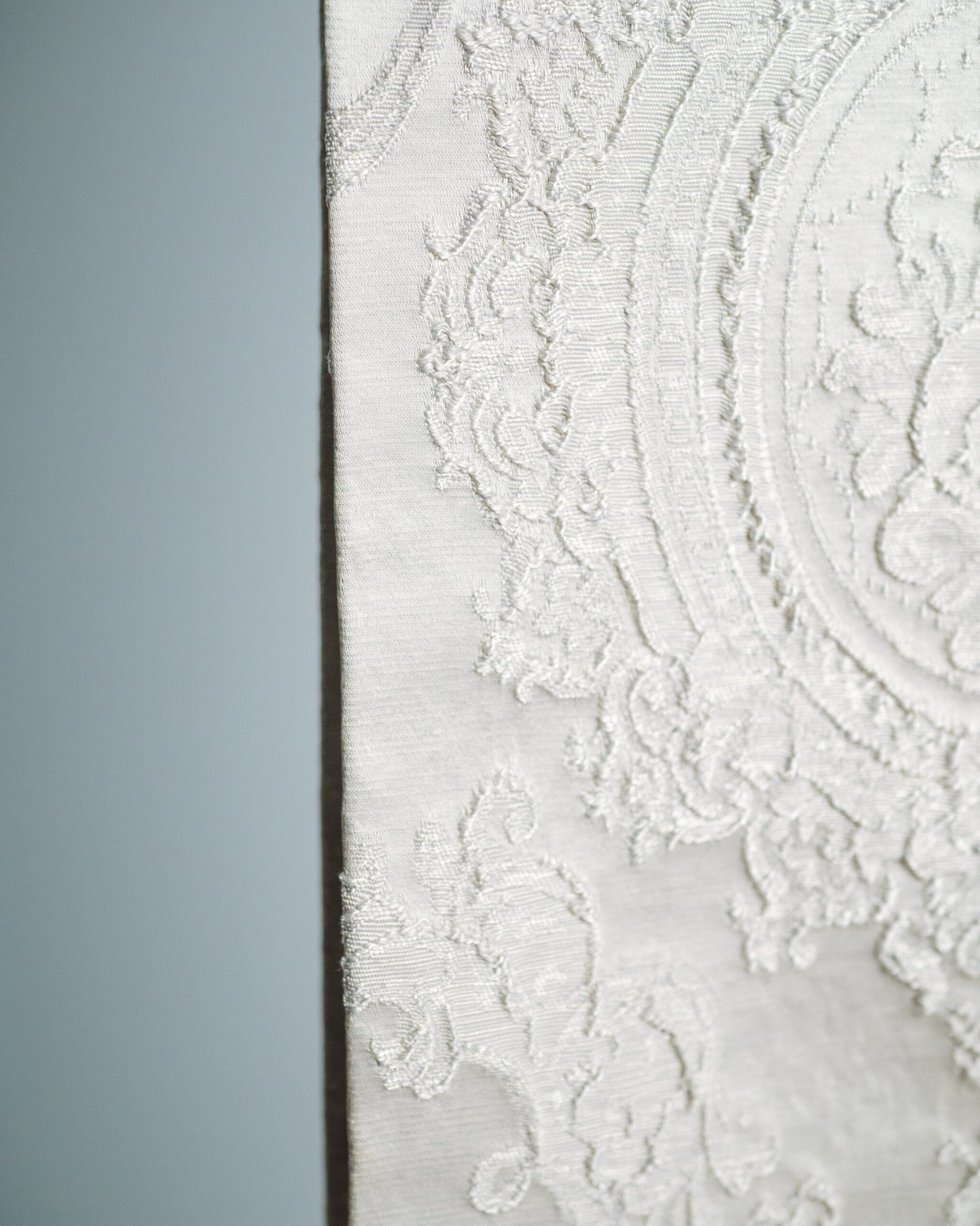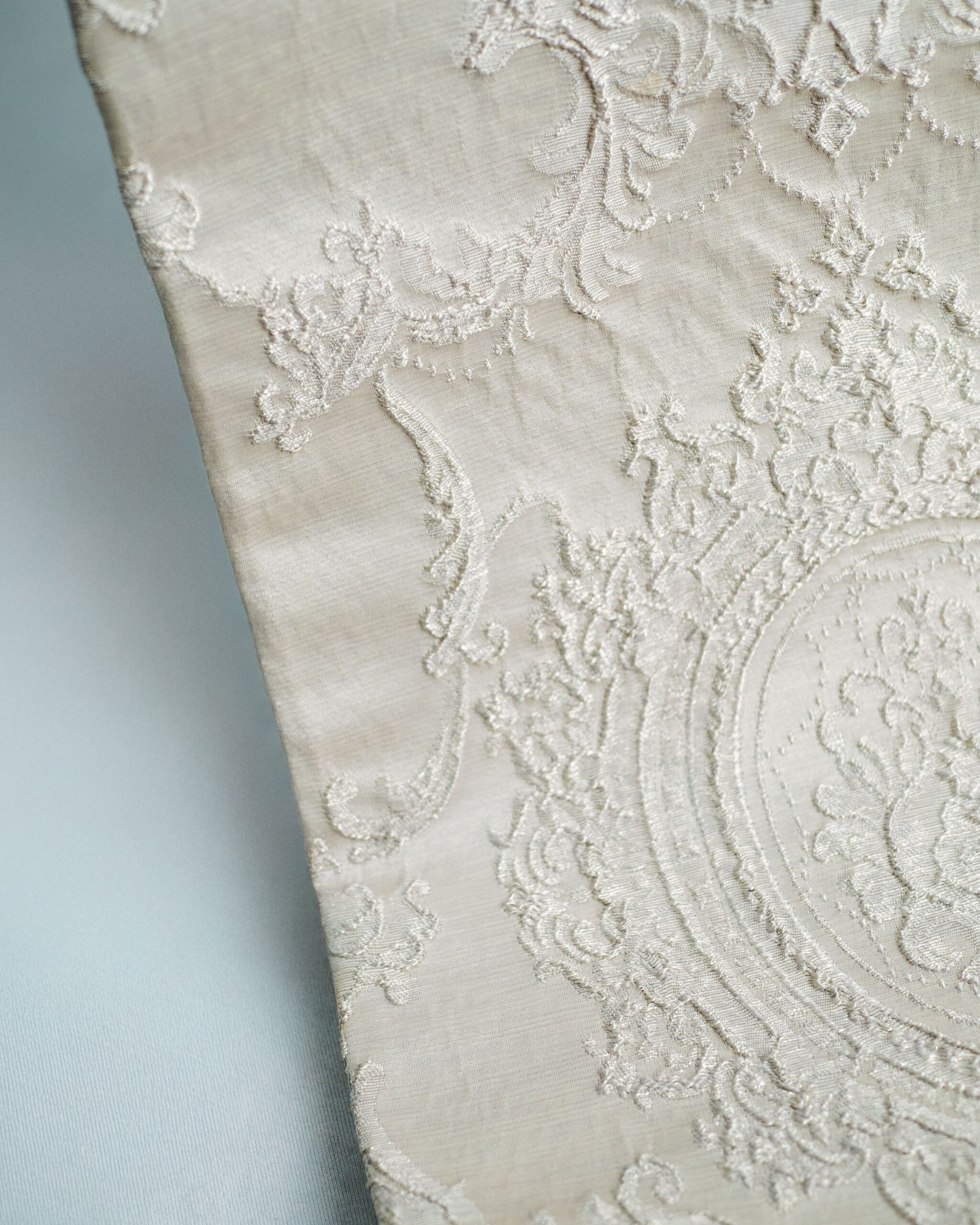This curtain features an ornate, embossed pattern with refined classical motifs delicately raised on a soft, light-toned fabric. The subtle relief and harmonious symmetry create a sense of timeless sophistication, making it an ideal choice for elegant interiors, boutique hotels, or formal living spaces where understated luxury is essential.