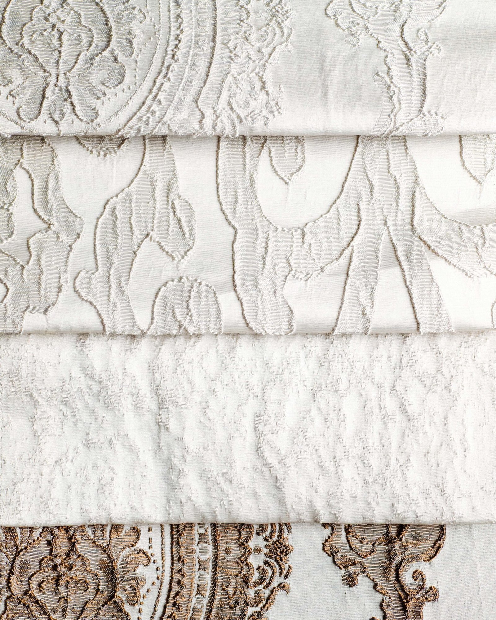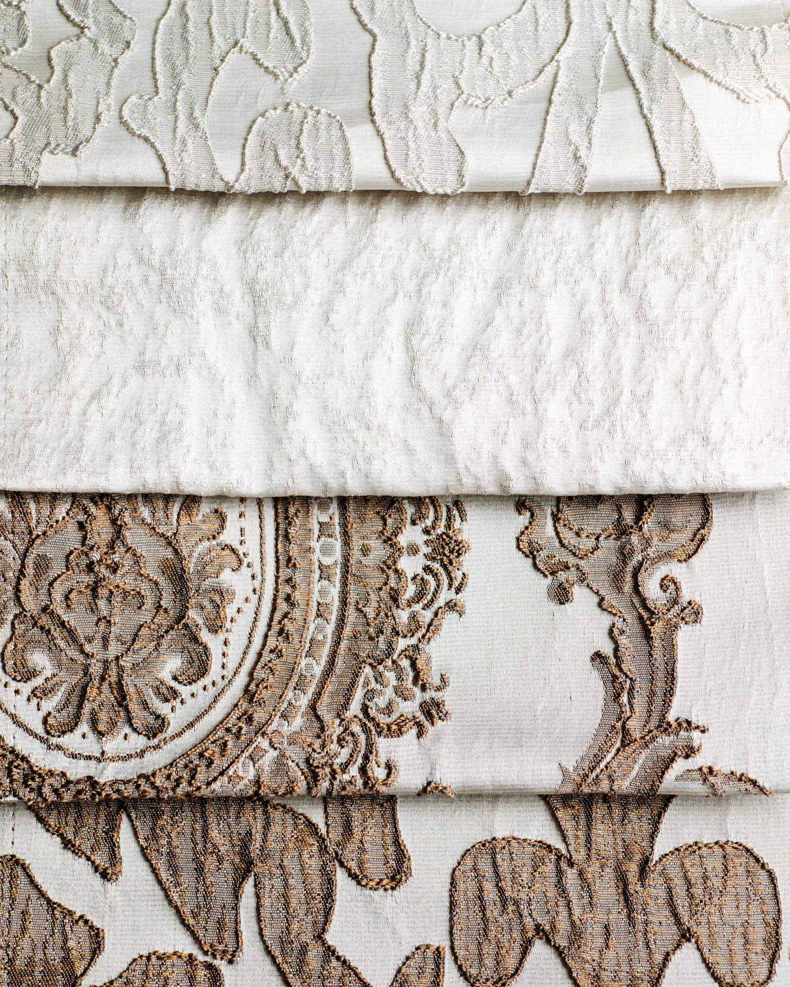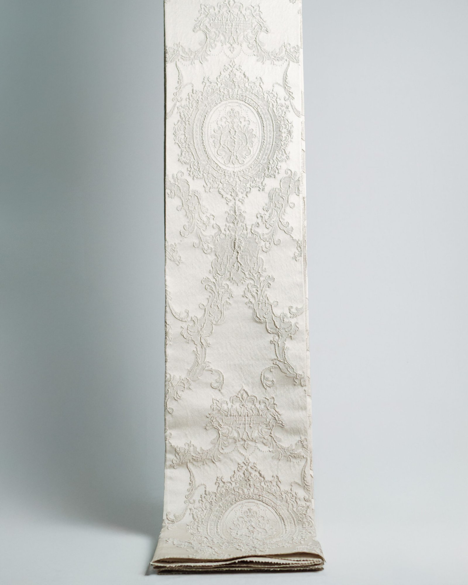 This curtain features an ornate, embossed pattern with refined classical motifs delicately raised on a soft, light-toned fabric. The subtle relief and harmonious symmetry create a sense of timeless sophistication, making it an ideal choice for elegant interiors, boutique hotels, or formal living spaces where understated luxury is essential.