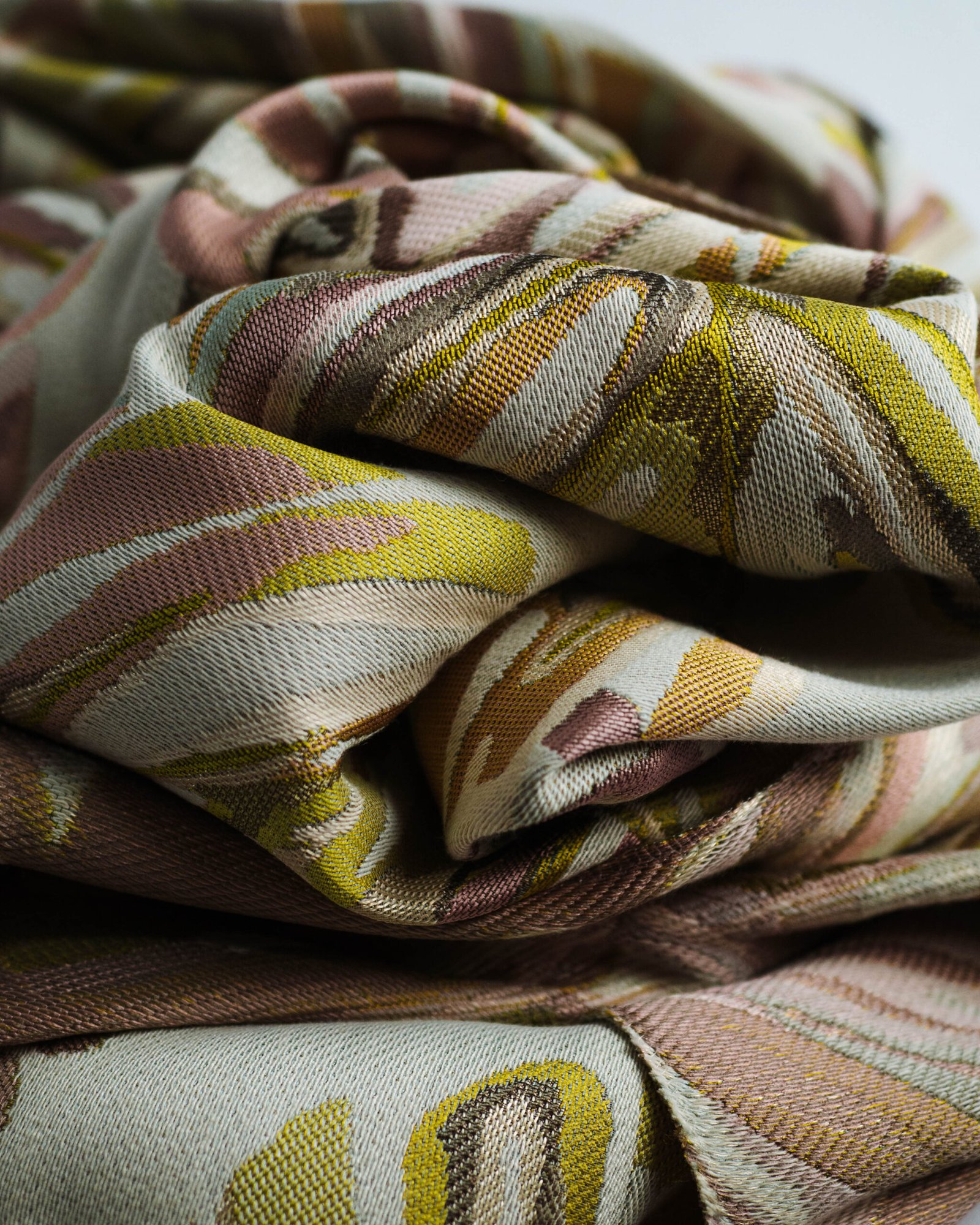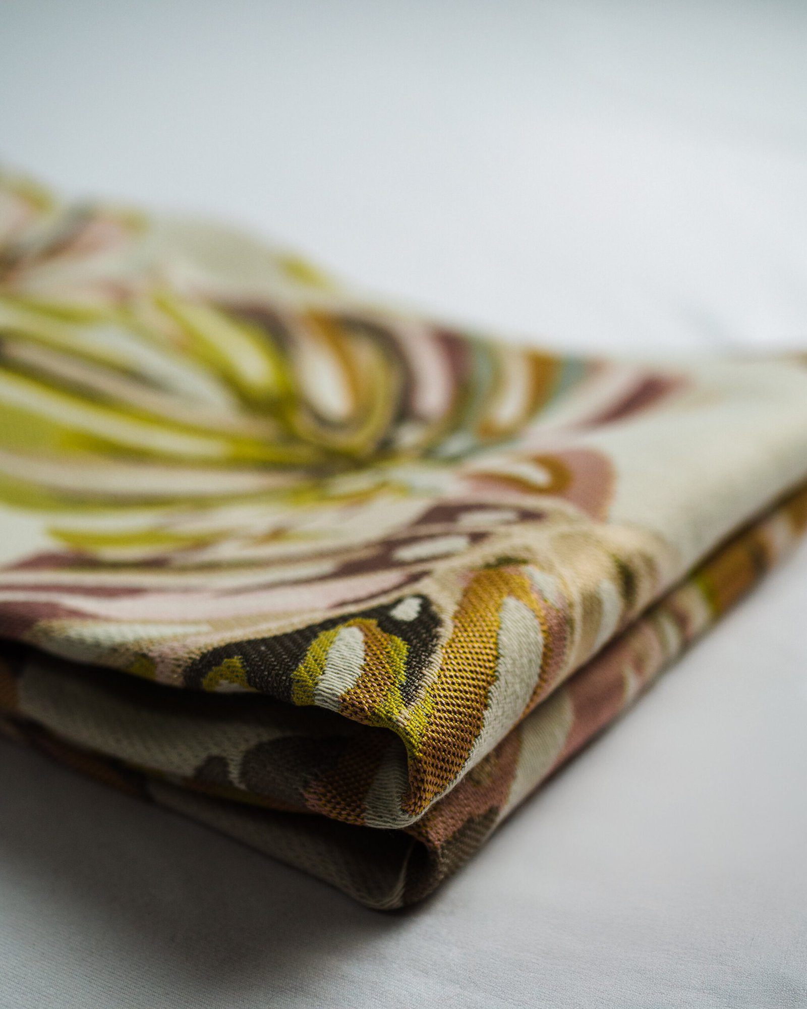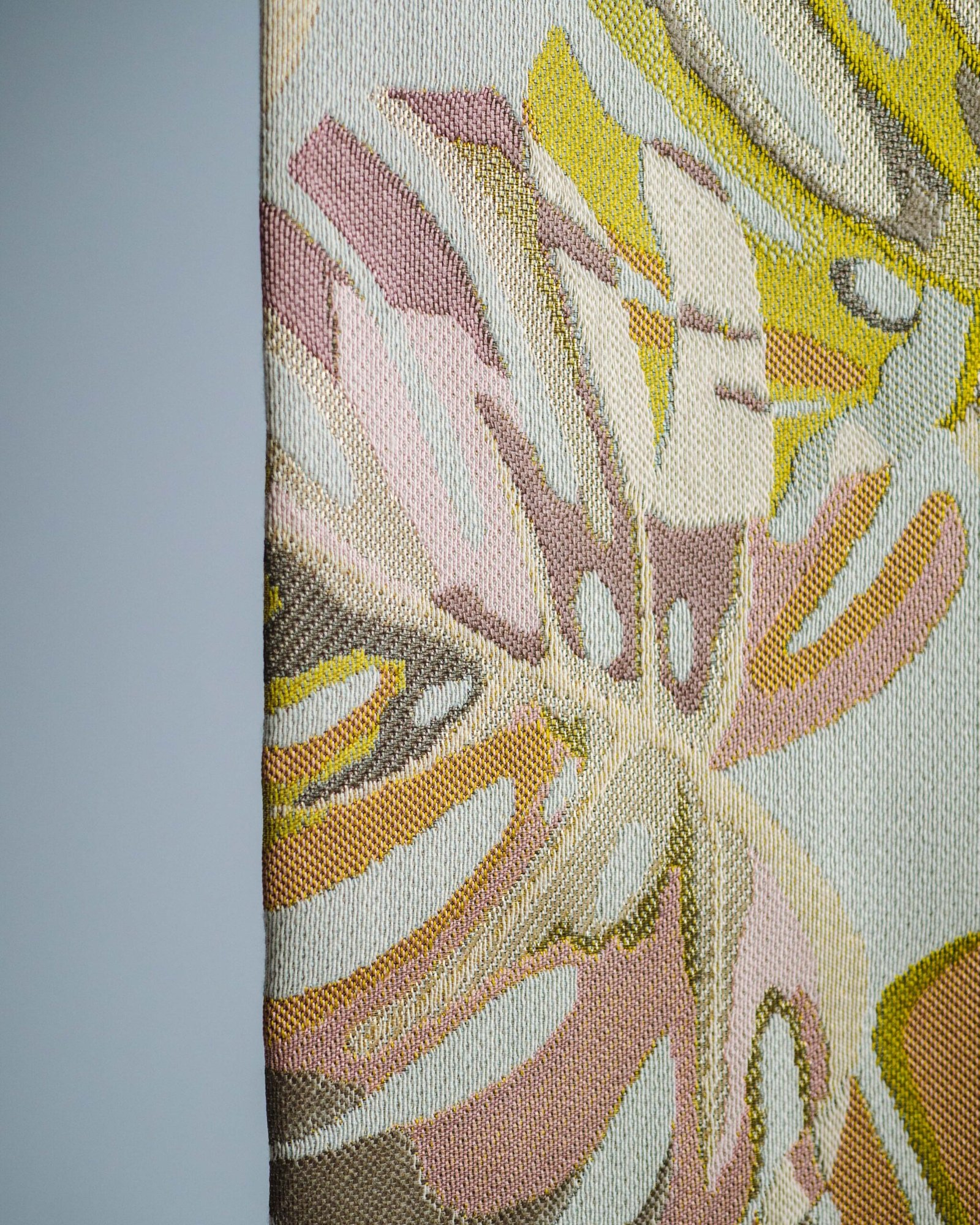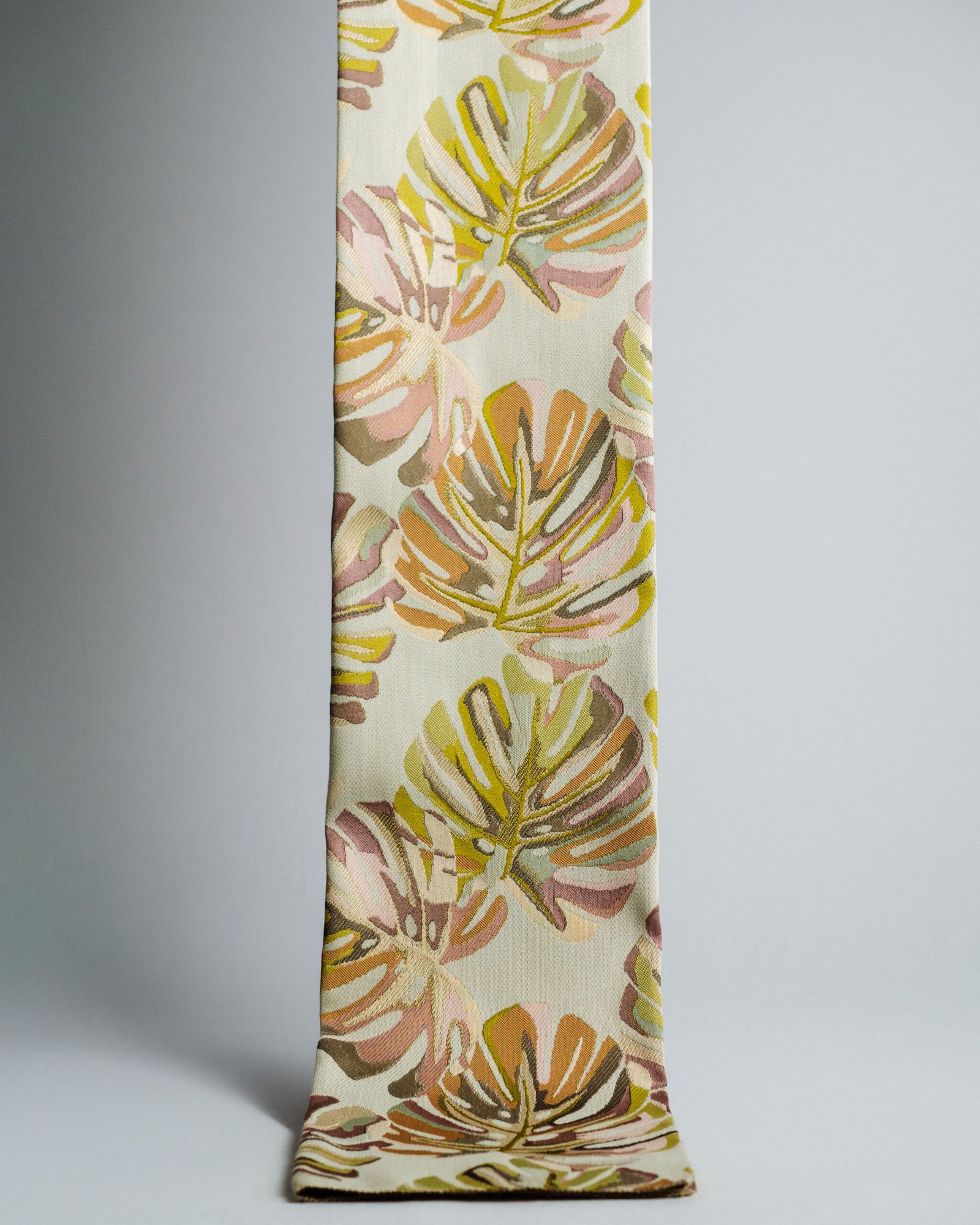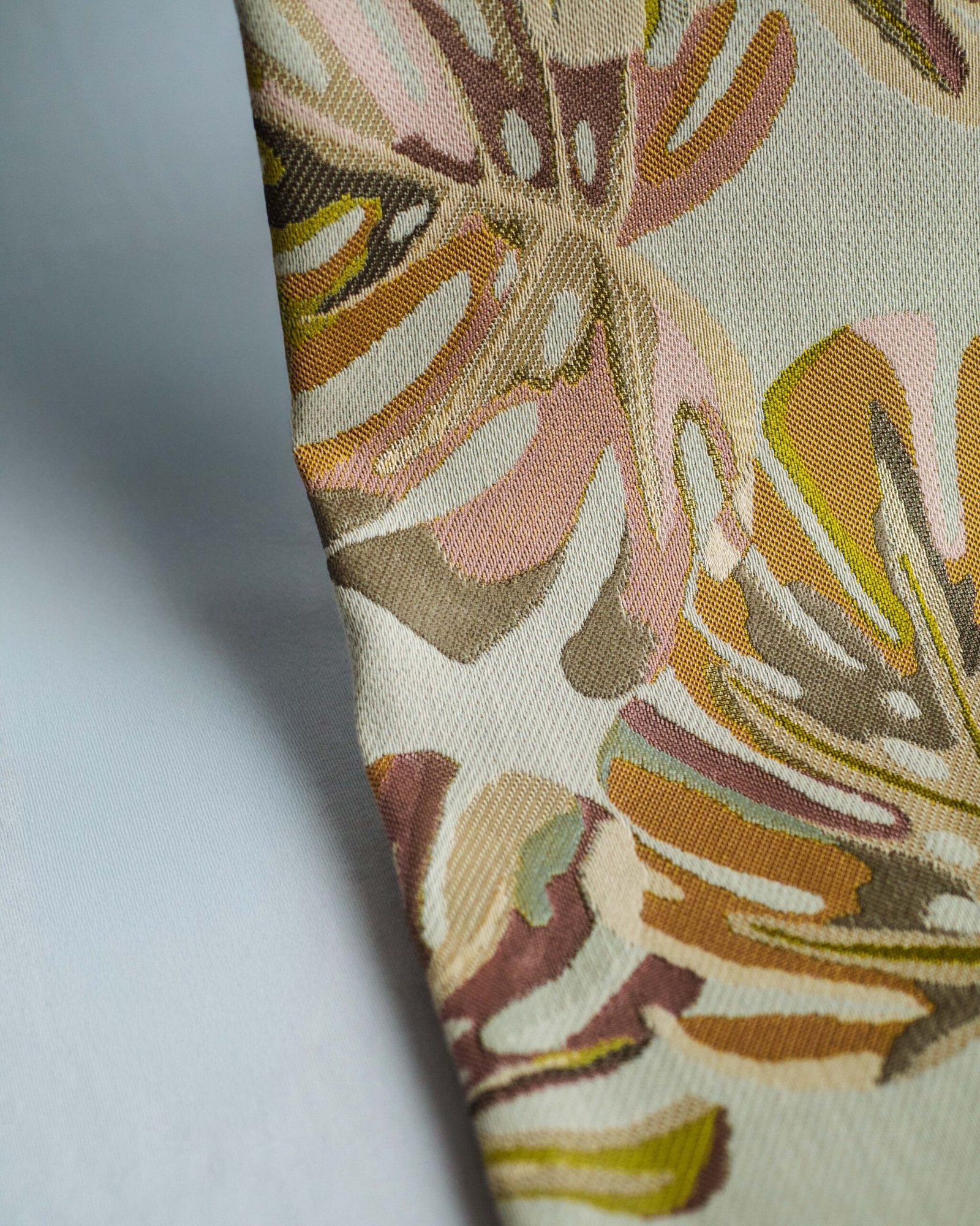 This curtain features an artful botanical pattern with softly layered leaves in warm, muted tones, set against a refined neutral base. The subtle texture and balanced color palette create an atmosphere of understated luxury, making it an elegant choice for curated living spaces, bedrooms, or designer interiors.