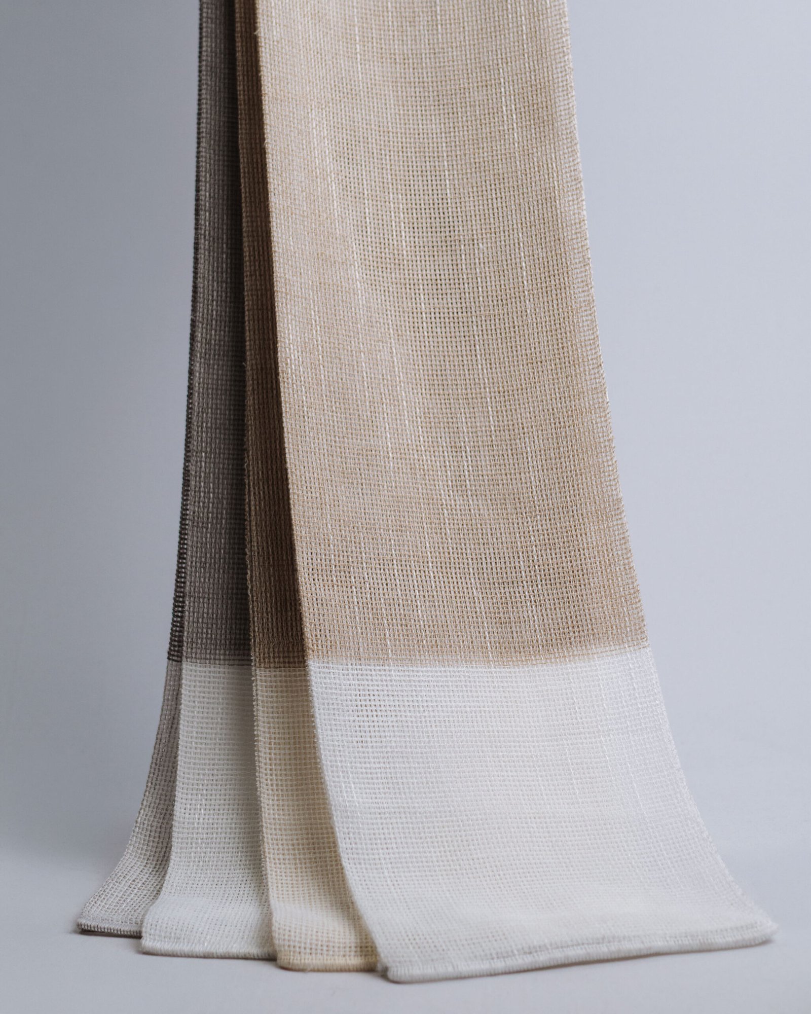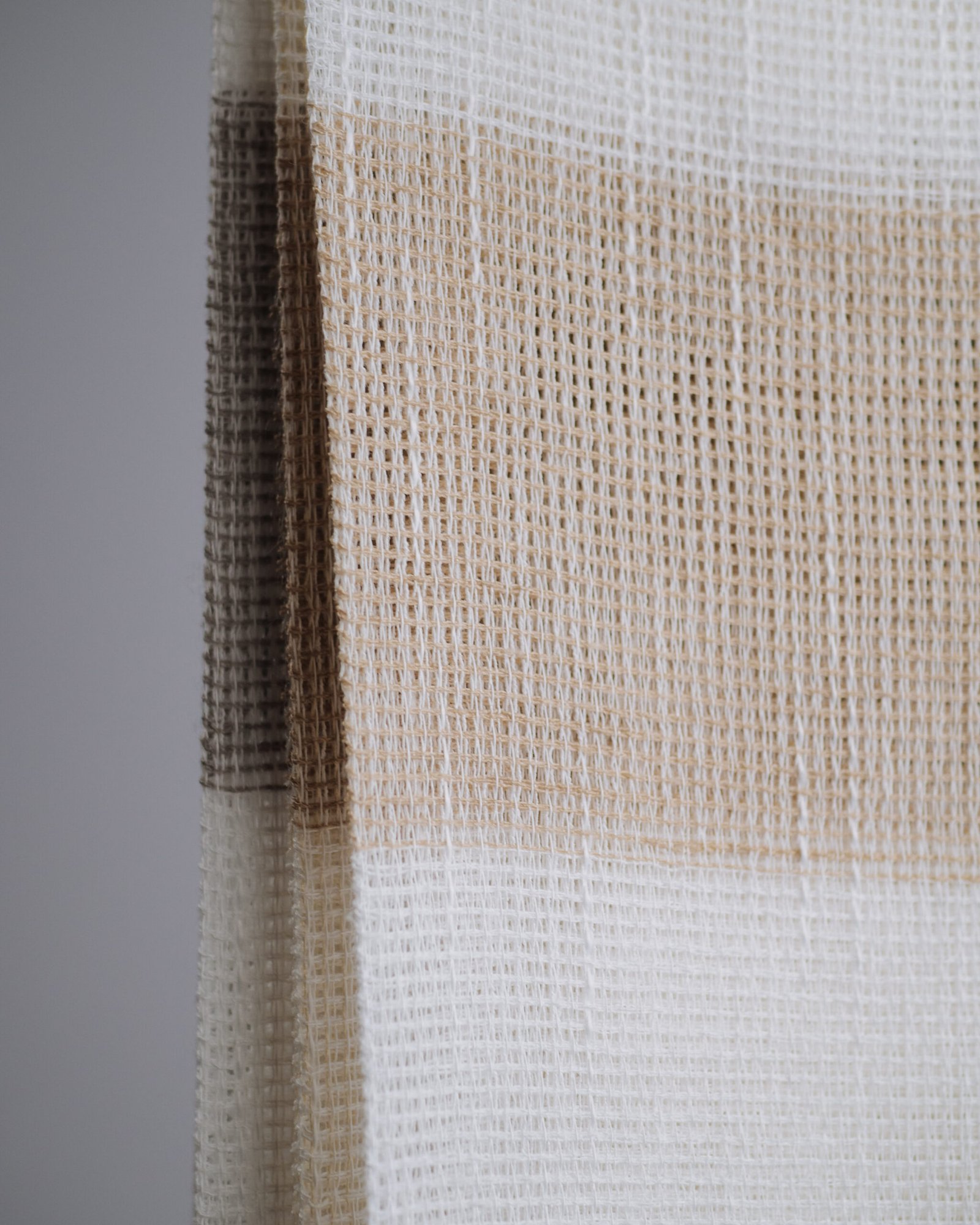 This premium sheer curtain features an open, textured weave that brings a natural, artisanal character to the fabric. The refined colorblock design in warm, earthy neutrals adds depth and a contemporary architectural touch. Its breathable, light-filtering structure softly diffuses sunlight while maintaining an airy, relaxed ambiance—perfect for modern, organic-inspired interiors.
