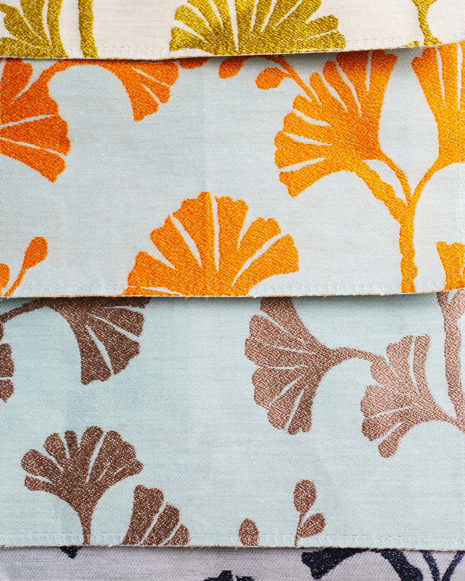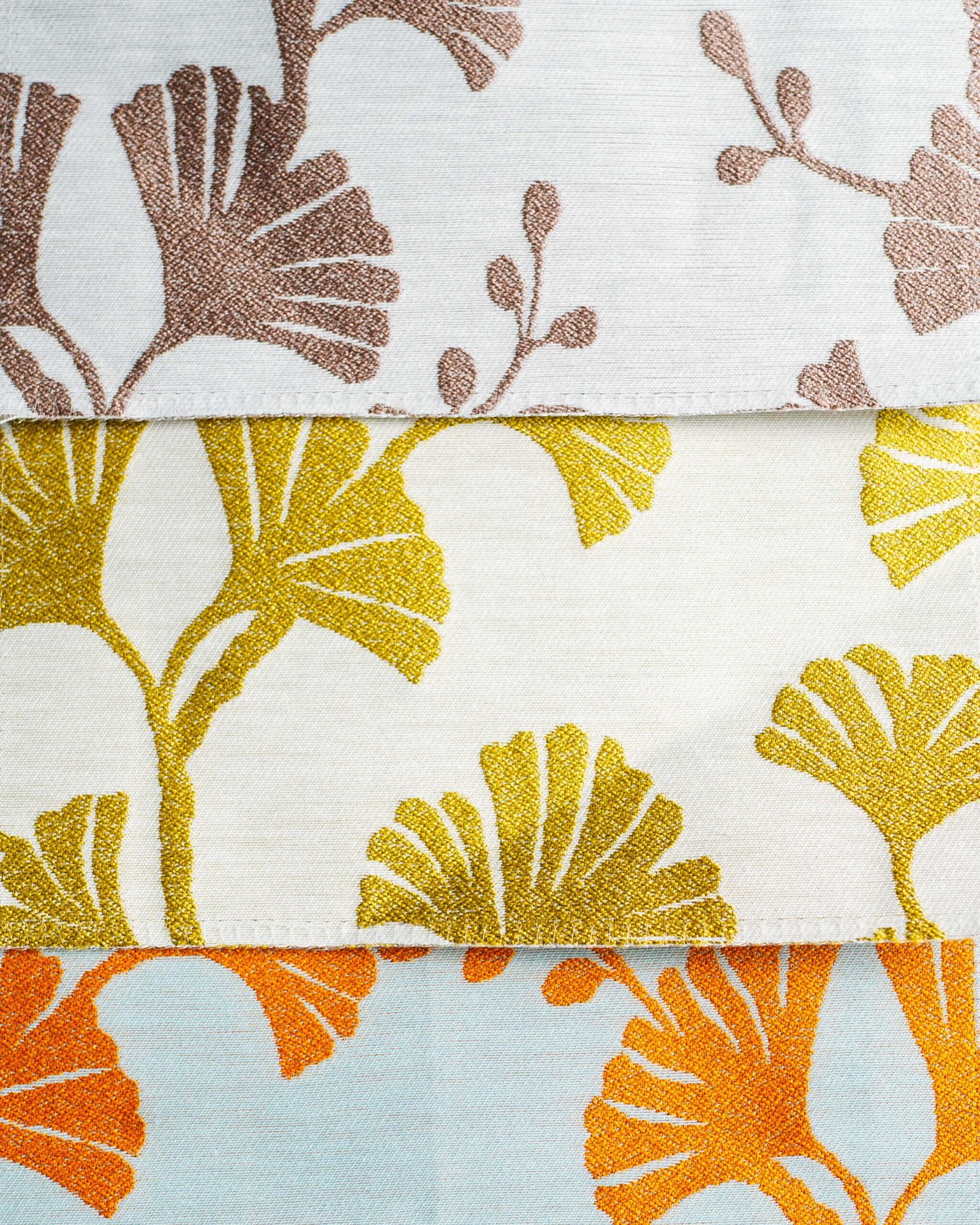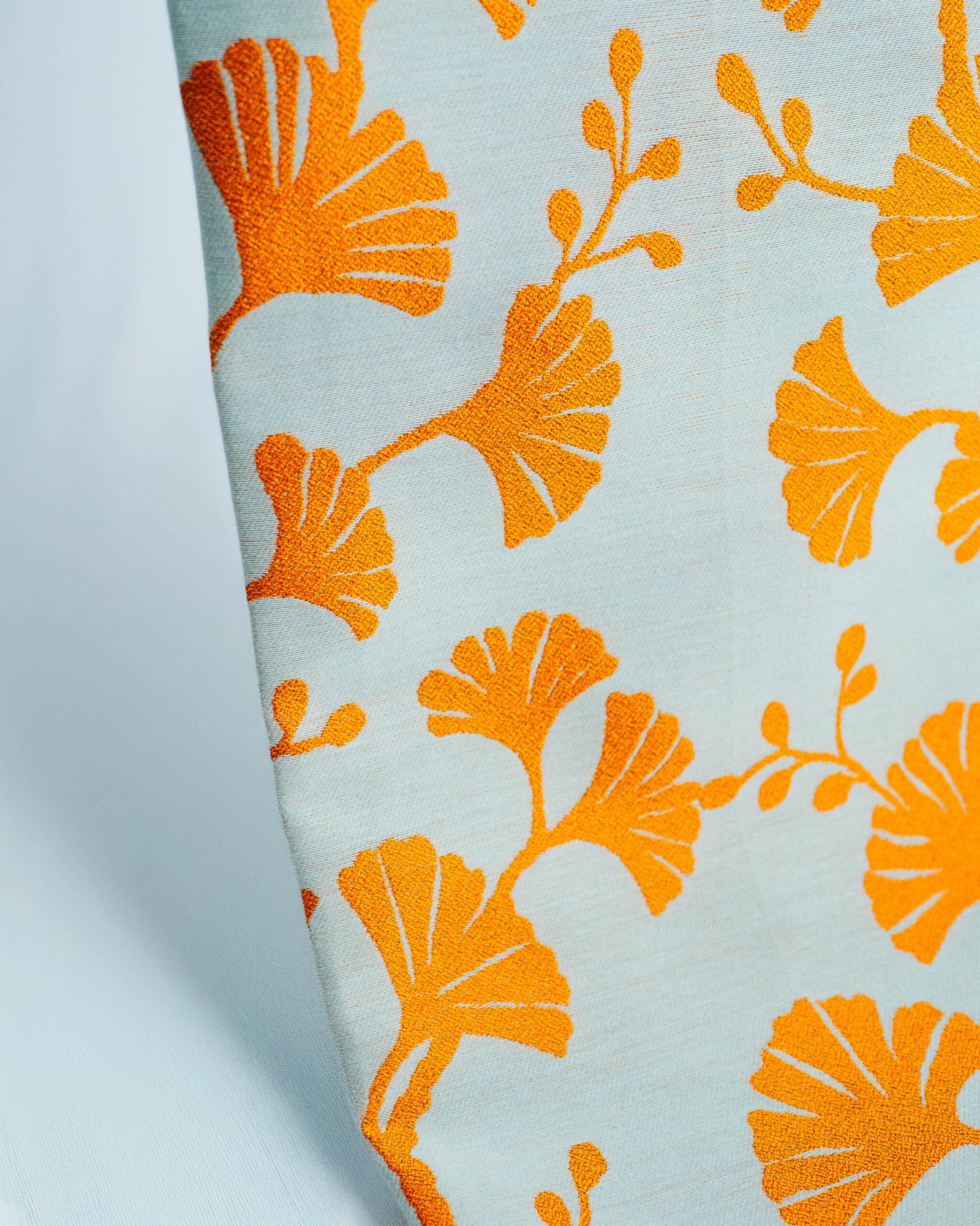 This curtain features a striking botanical motif inspired by stylized leaves, rendered in vibrant, sun-washed tones against a soft, airy base. The refined texture and confident pattern create a sophisticated statement that feels both modern and timeless. Expressive yet elegant, it brings warmth, artistic character, and a curated designer presence to contemporary interiors and light-filled living spaces.