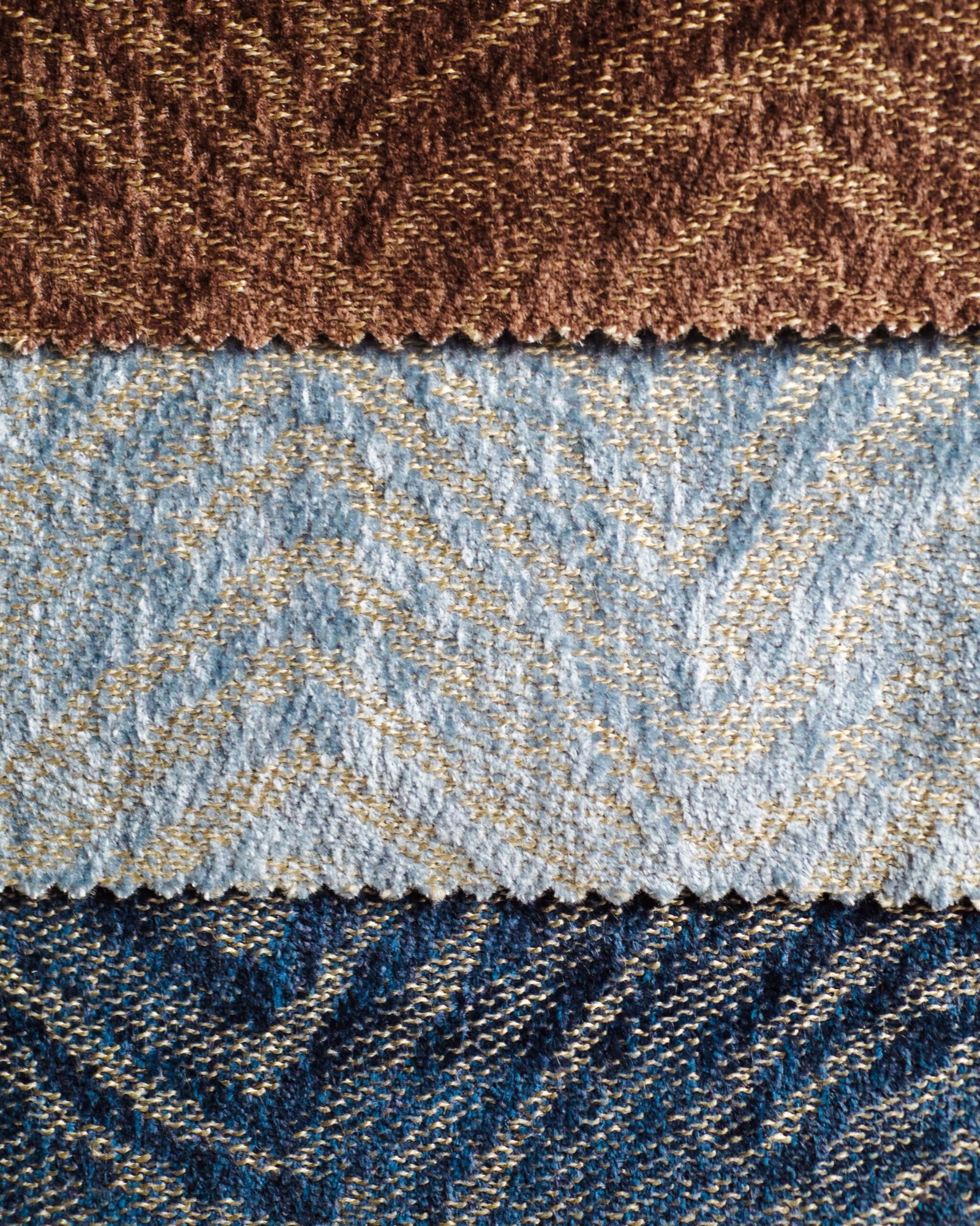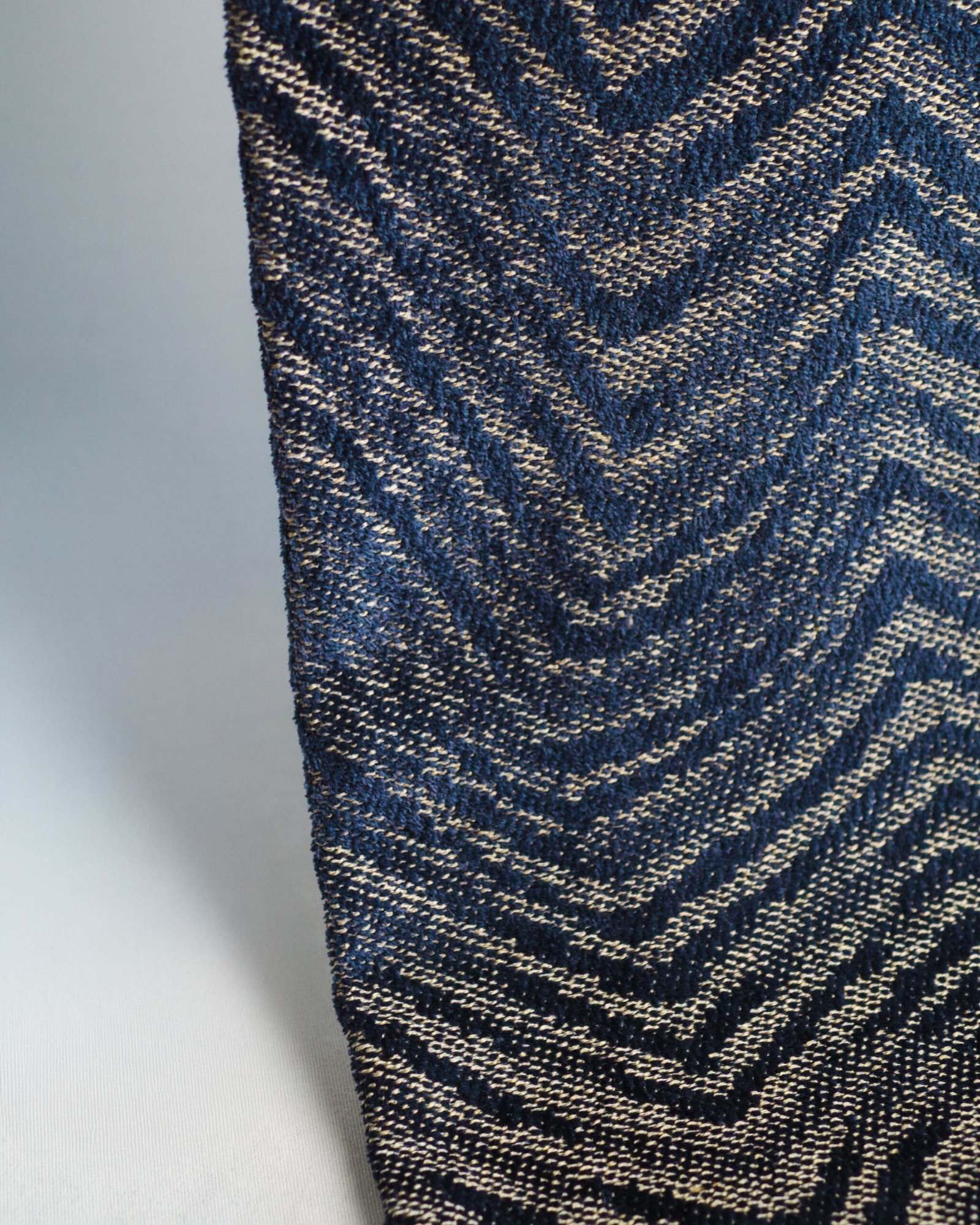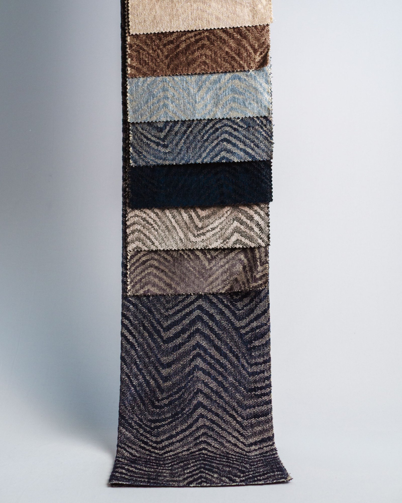 A sophisticated curtain defined by a refined chevron texture, layered in a harmonious palette of warm neutrals, soft blues, and deep charcoal tones. Its tactile weave and understated pattern create depth and movement, offering a quietly luxurious finish perfect for contemporary and elegant interiors.