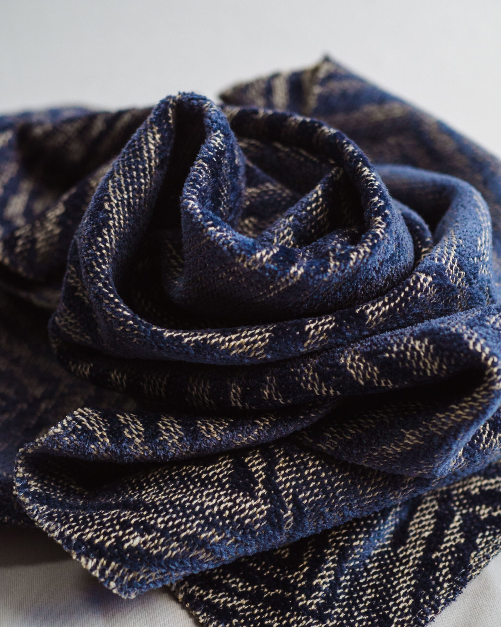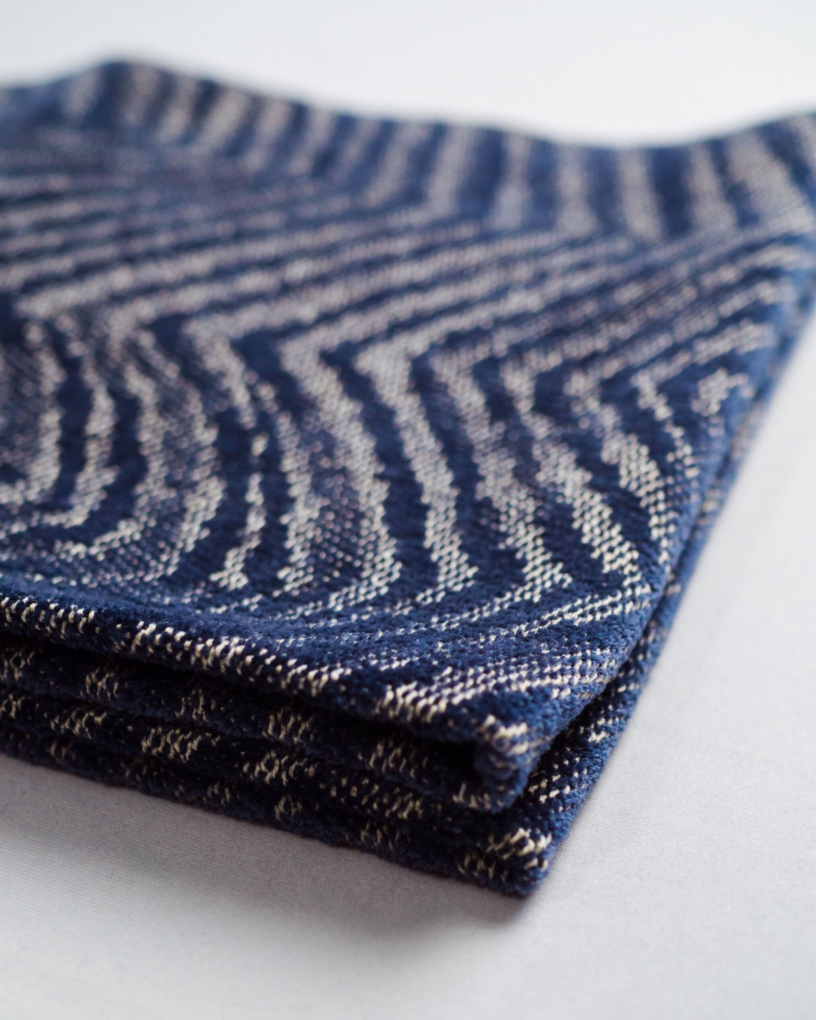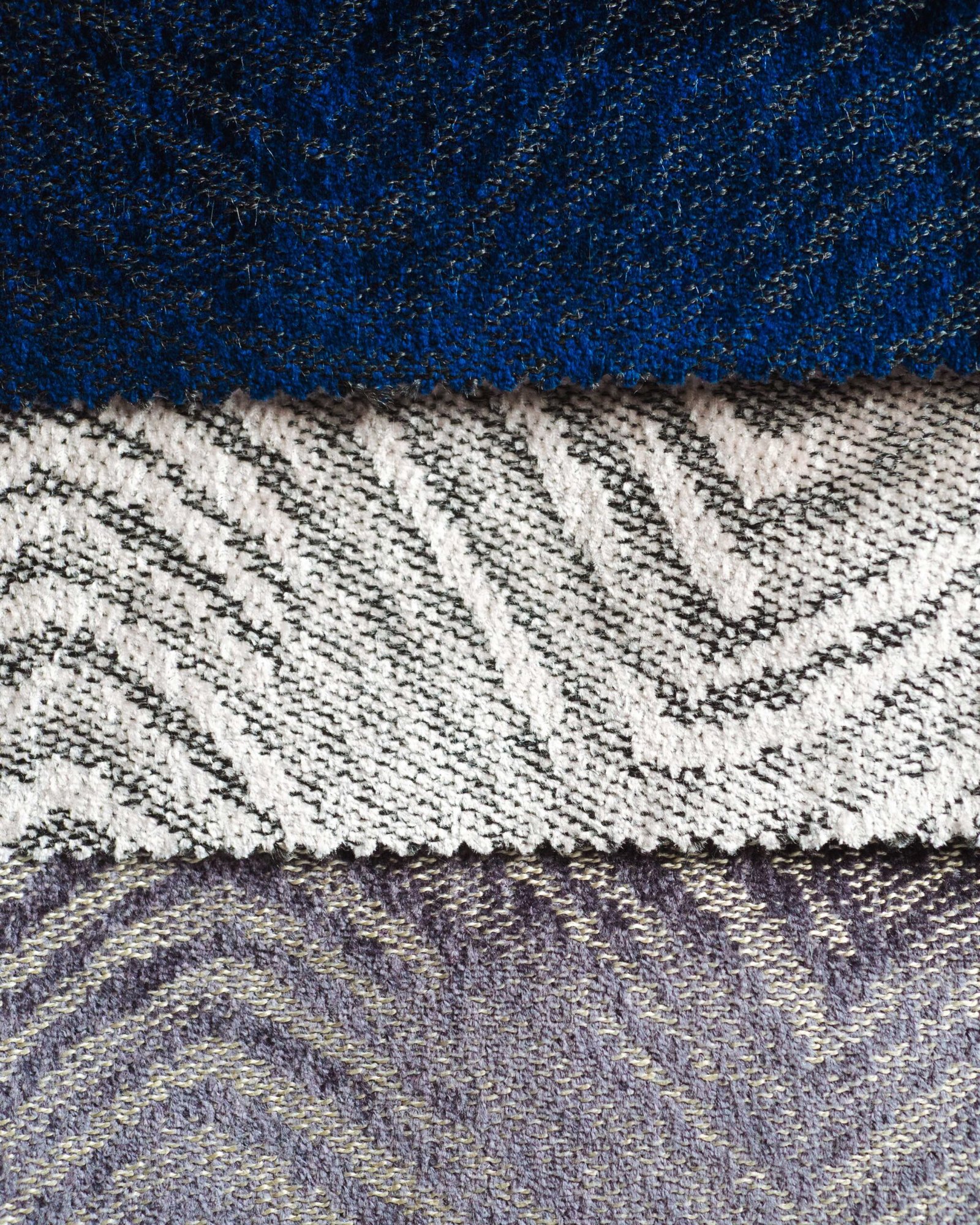 A sophisticated curtain defined by a refined chevron texture, layered in a harmonious palette of warm neutrals, soft blues, and deep charcoal tones. Its tactile weave and understated pattern create depth and movement, offering a quietly luxurious finish perfect for contemporary and elegant interiors.