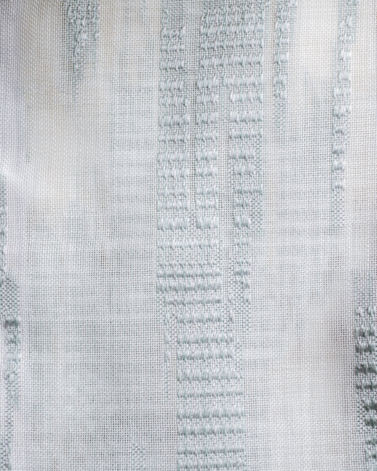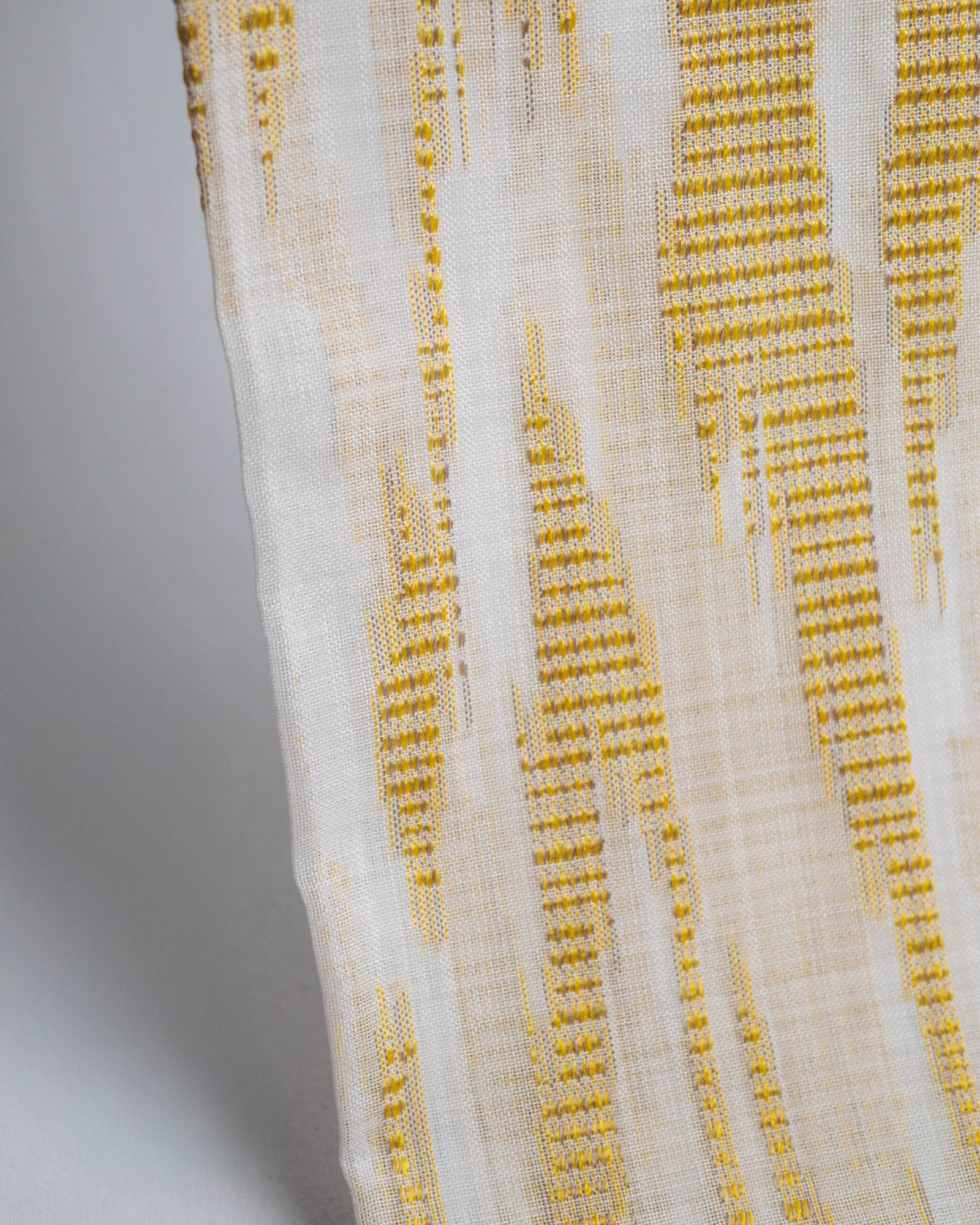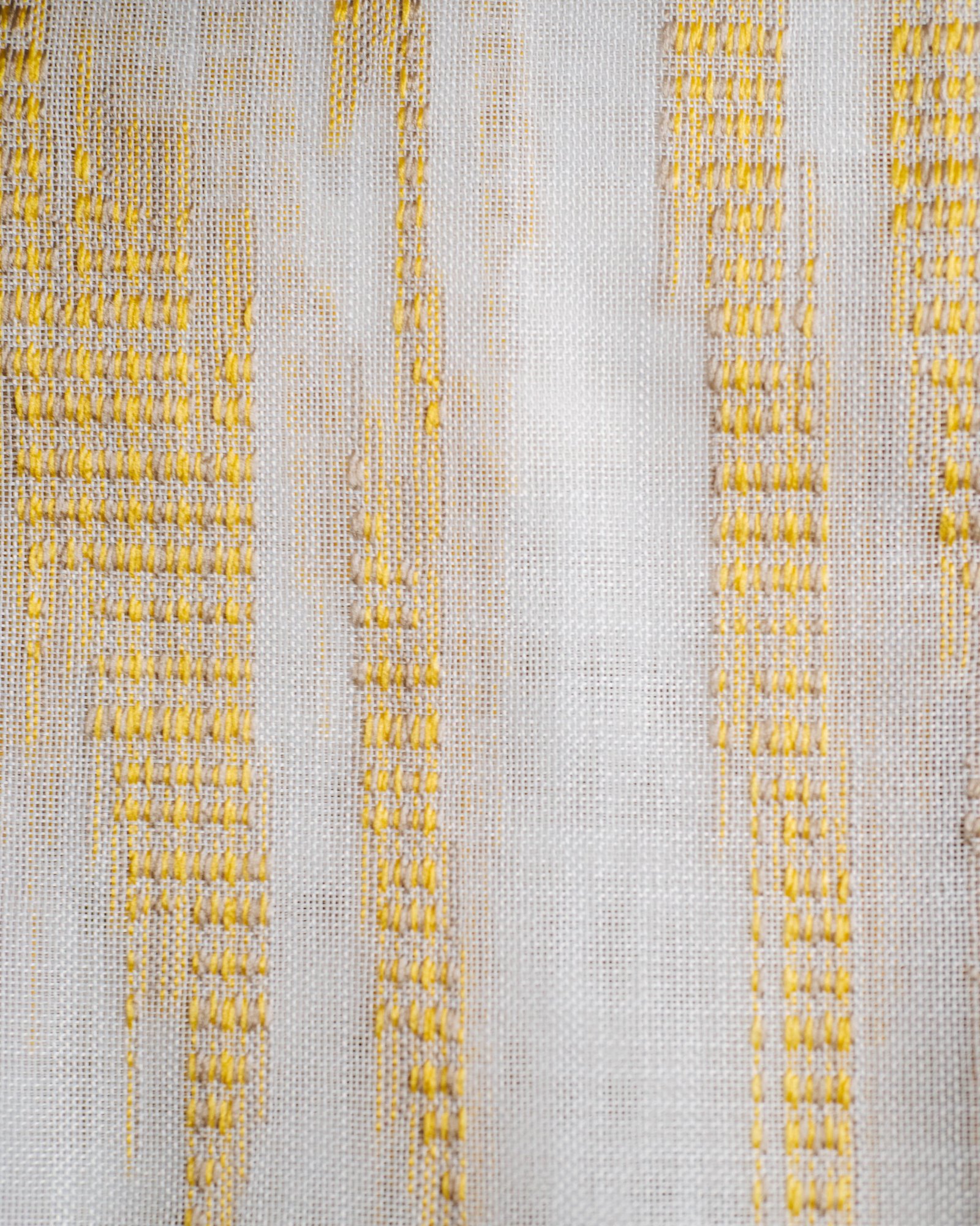 This refined sheer features delicate vertical textures woven with soft golden accents, creating a subtle play of light and movement across the fabric. Its airy translucence and elegant patterning bring a luminous, boutique-hotel sophistication to any space.