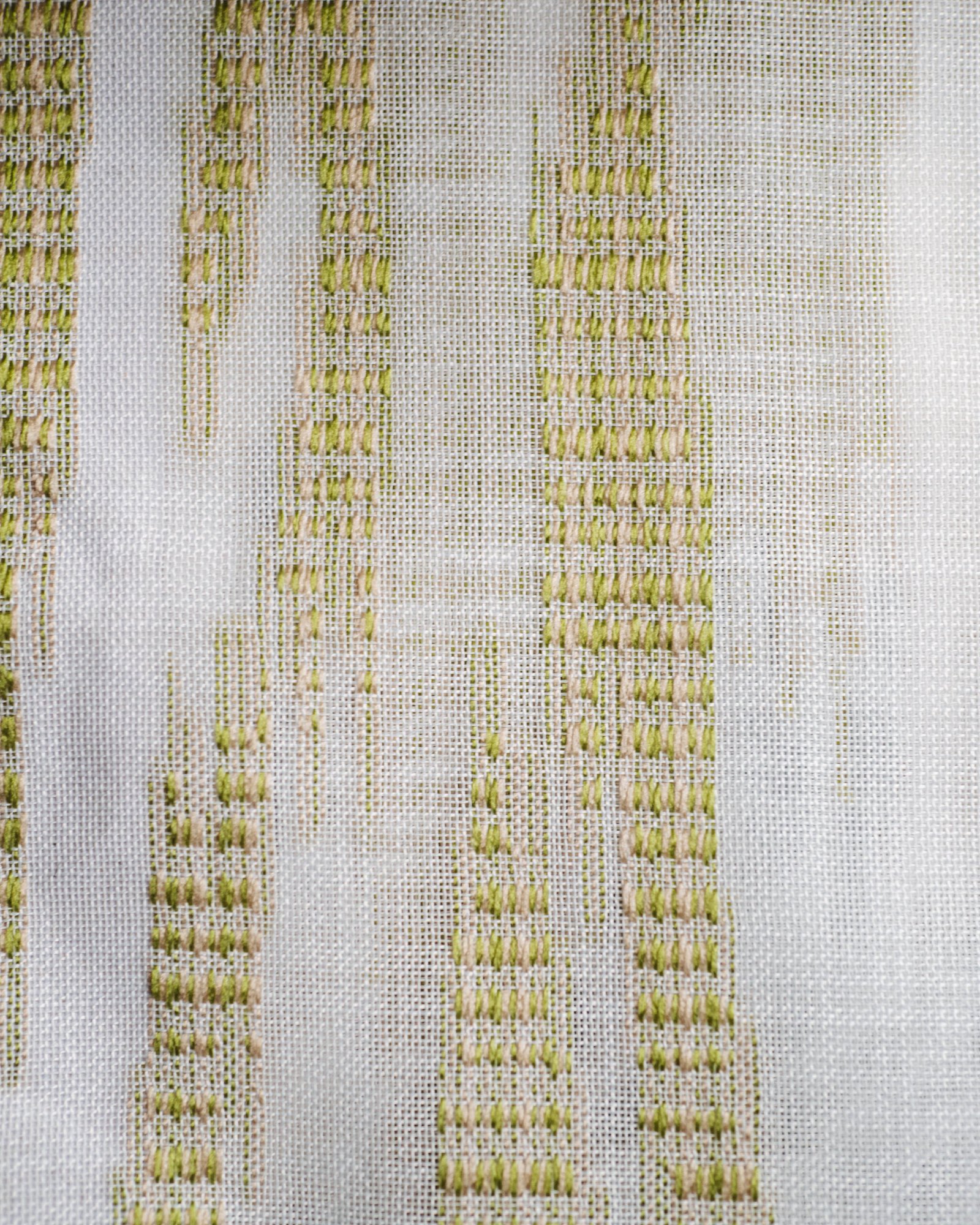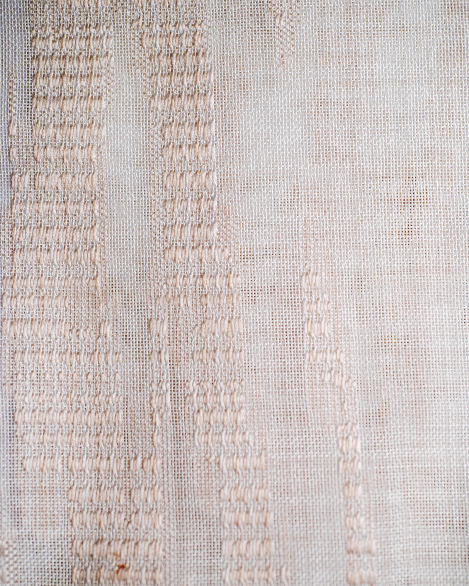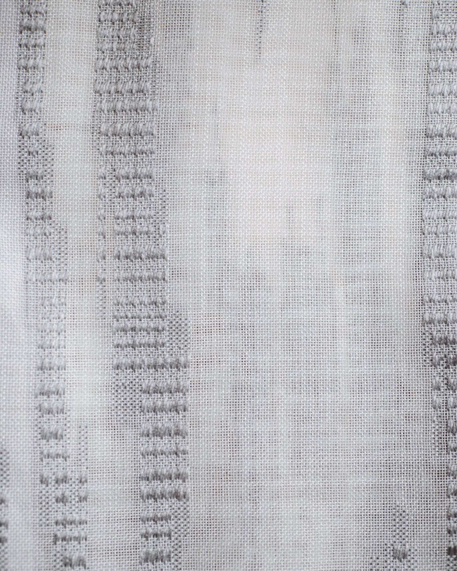 This refined sheer features delicate vertical textures woven with soft golden accents, creating a subtle play of light and movement across the fabric. Its airy translucence and elegant patterning bring a luminous, boutique-hotel sophistication to any space.
