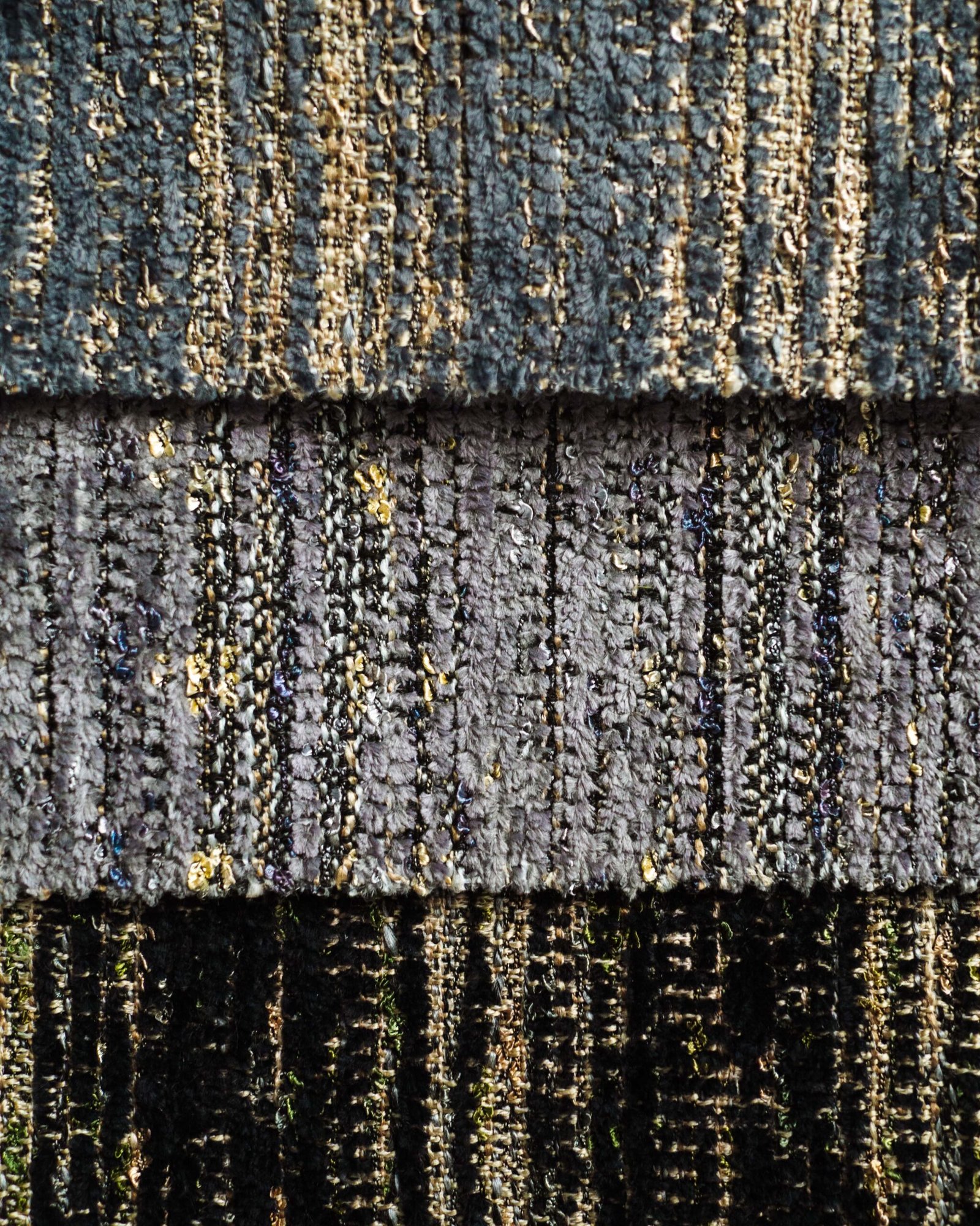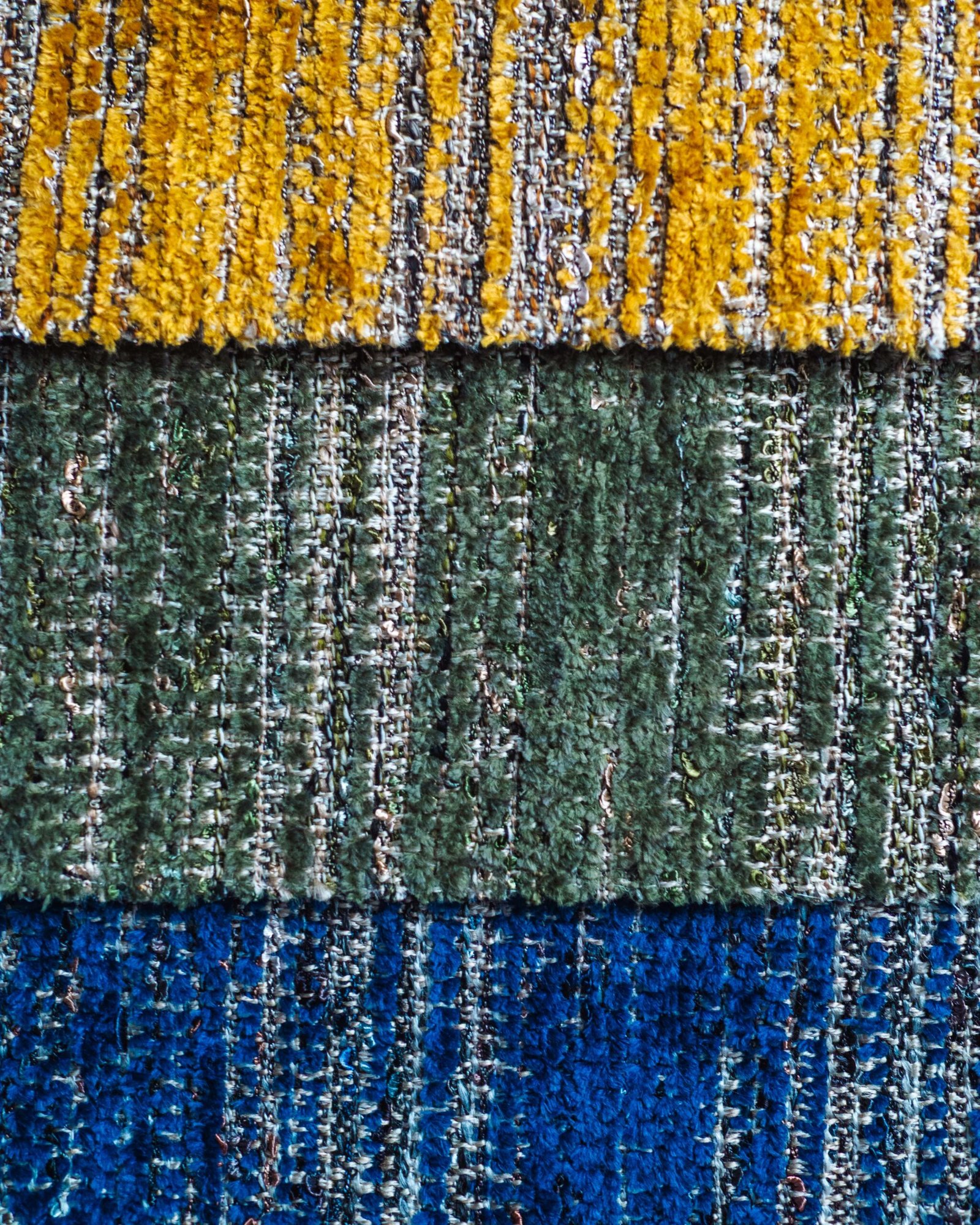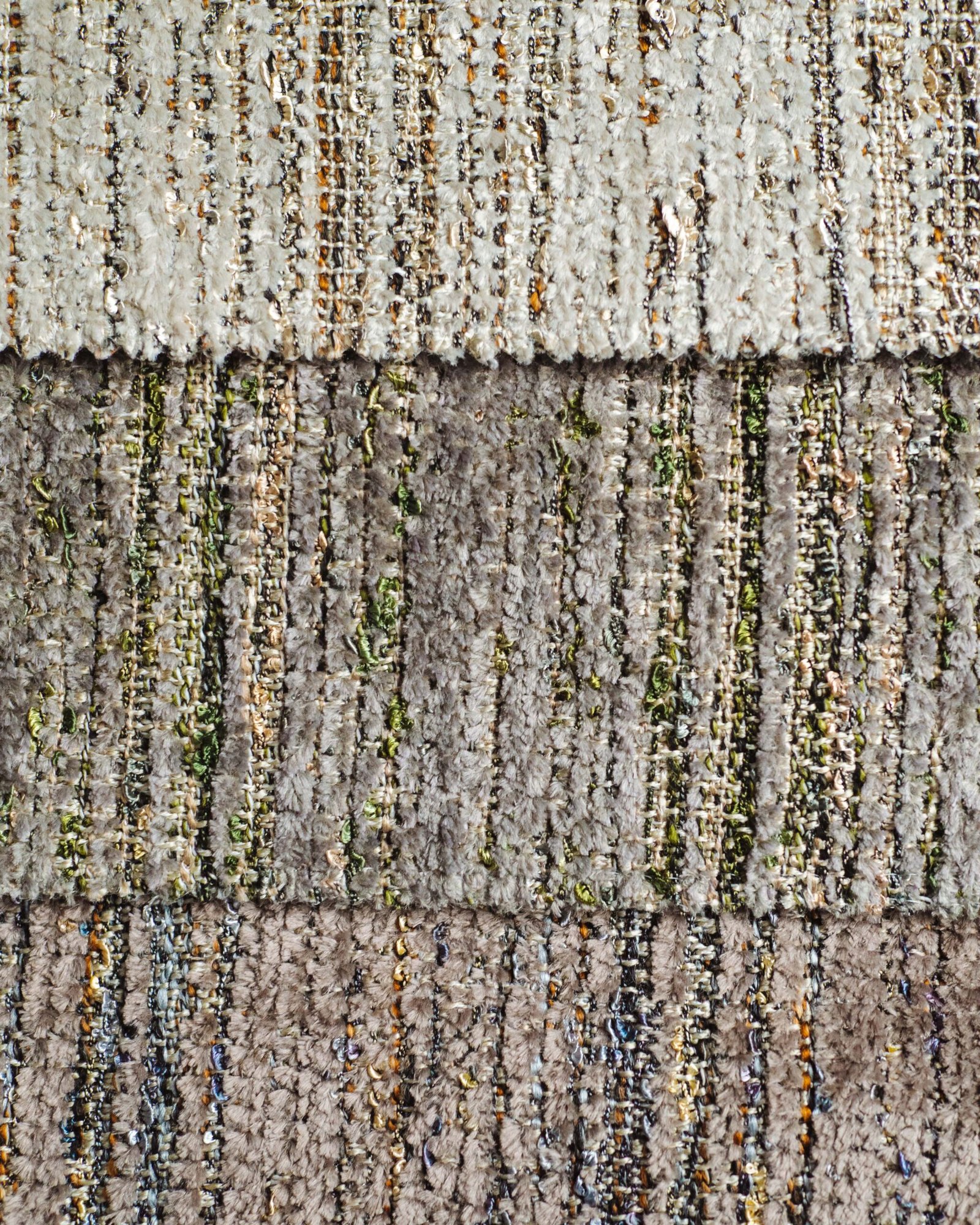 A richly textured fabric arrangement defined by vertical striations and a layered, tonal palette. Warm neutrals form the foundation, accented by bands of mustard yellow, mossy green, deep navy, and charcoal. Subtle metallic flecks woven through the surface catch the light, enhancing depth and movement. The ribbed texture gives the composition a rhythmic, almost architectural quality, balancing organic warmth with contemporary structure. Well suited for sophisticated upholstery, accent pieces, or interior applications that favor texture, durability, and understated luxury.