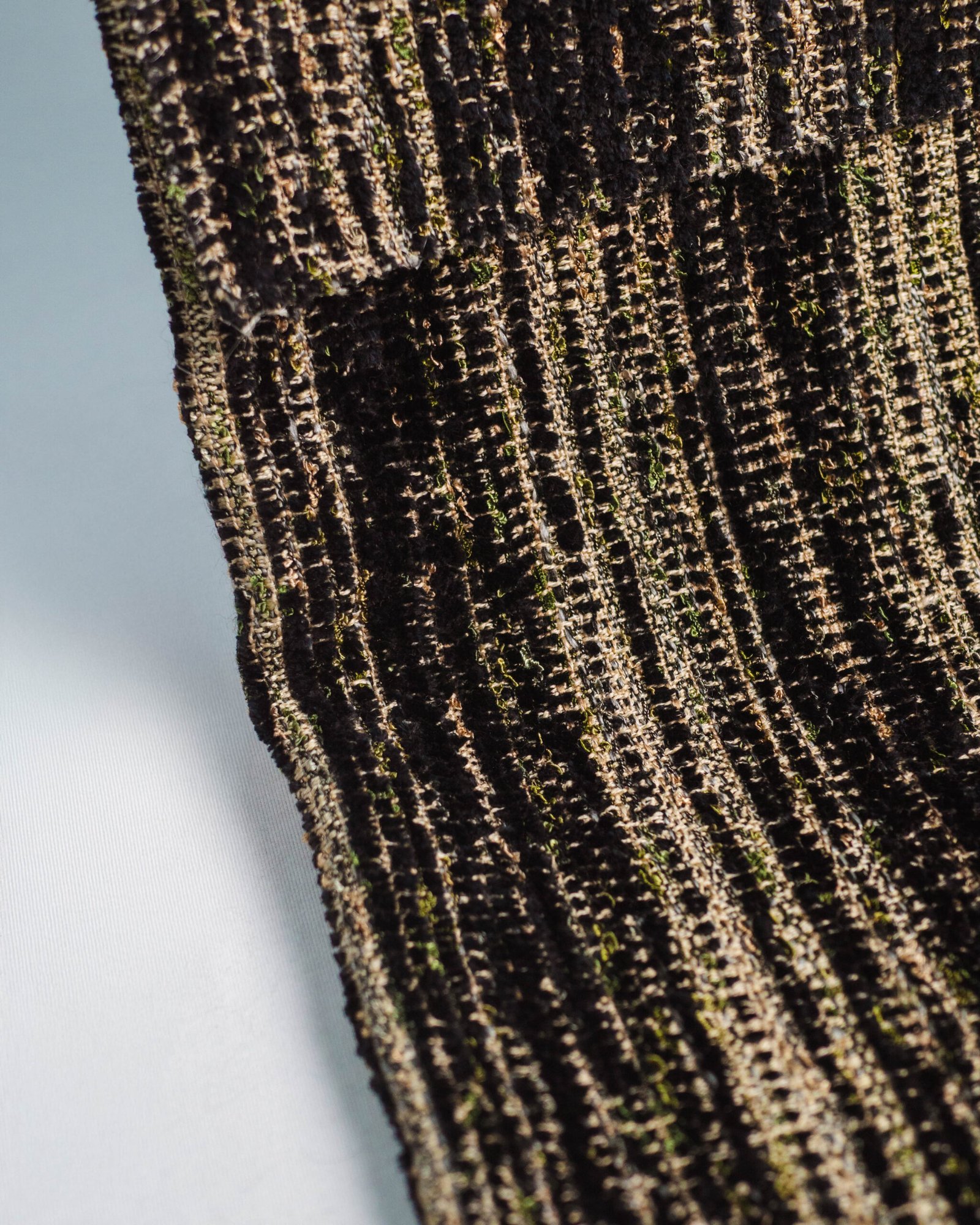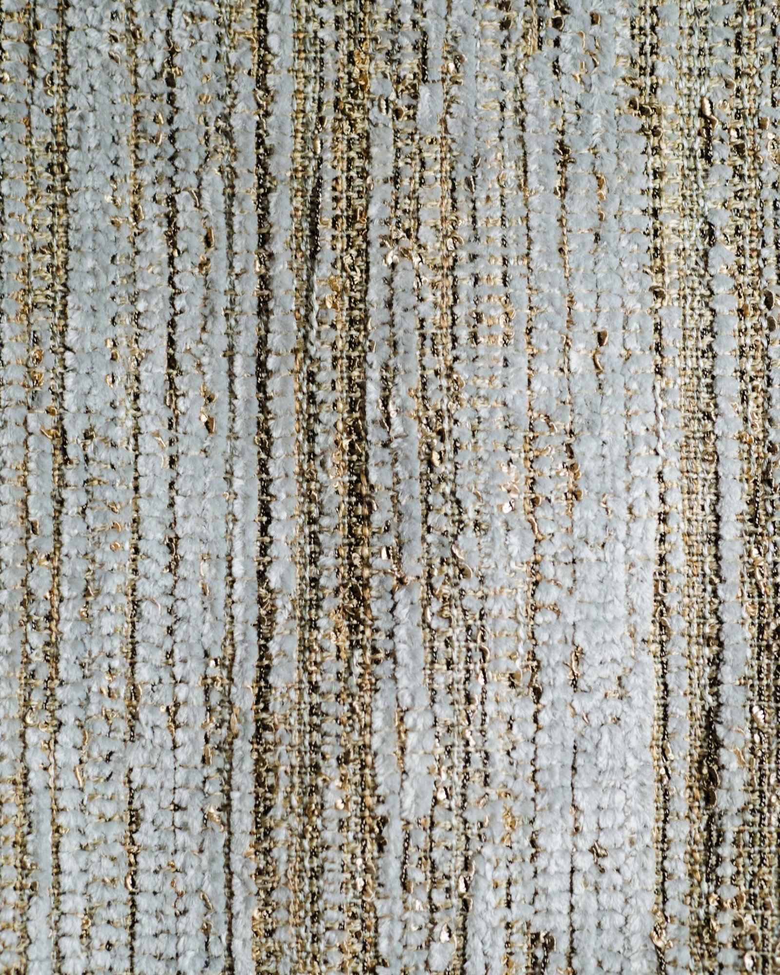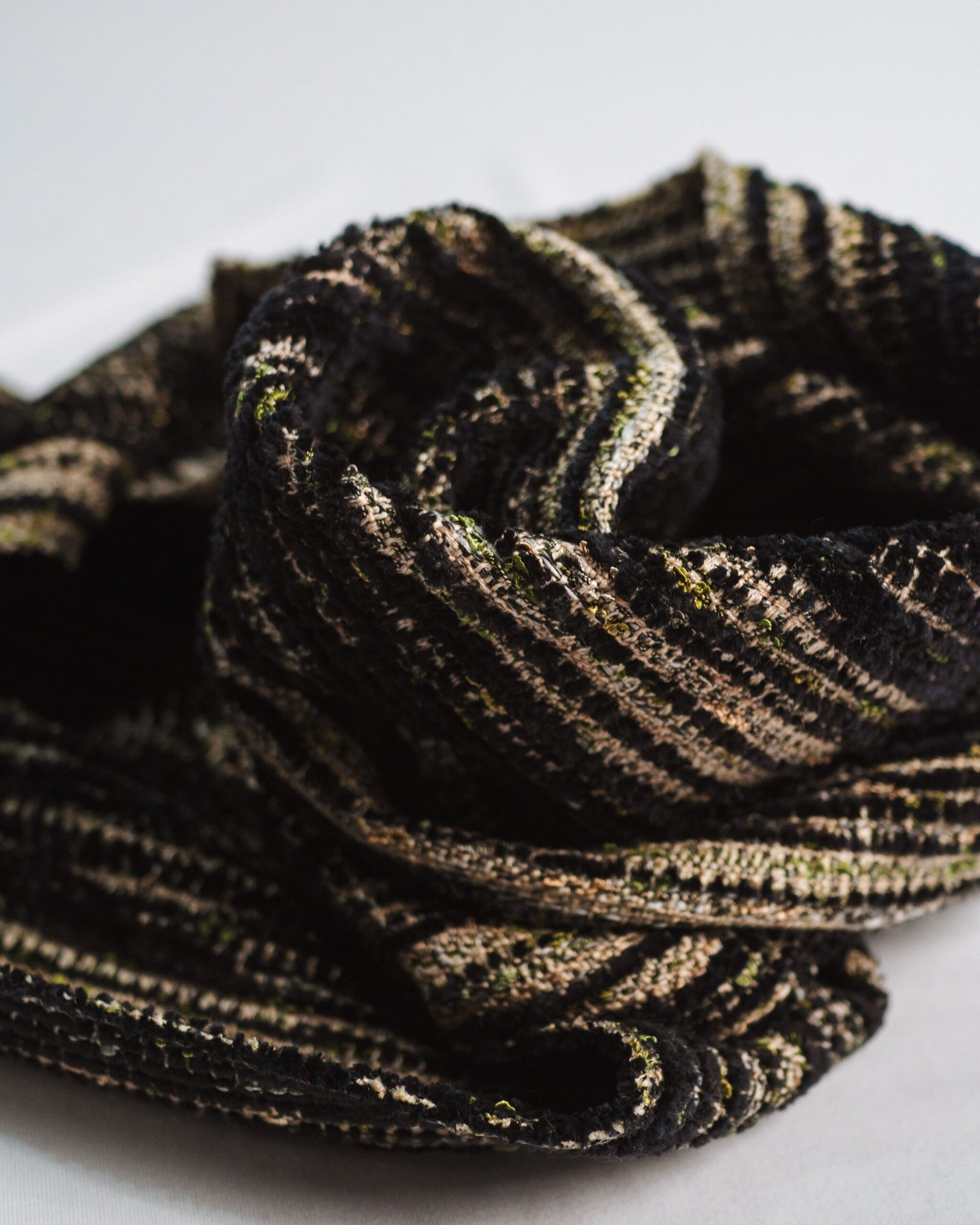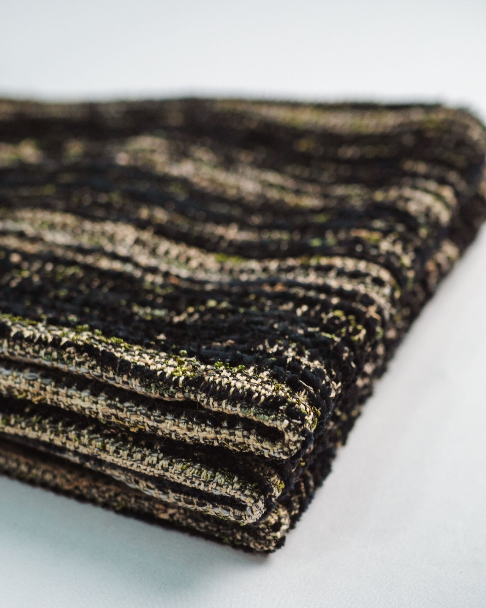 A richly textured fabric arrangement defined by vertical striations and a layered, tonal palette. Warm neutrals form the foundation, accented by bands of mustard yellow, mossy green, deep navy, and charcoal. Subtle metallic flecks woven through the surface catch the light, enhancing depth and movement. The ribbed texture gives the composition a rhythmic, almost architectural quality, balancing organic warmth with contemporary structure. Well suited for sophisticated upholstery, accent pieces, or interior applications that favor texture, durability, and understated luxury.