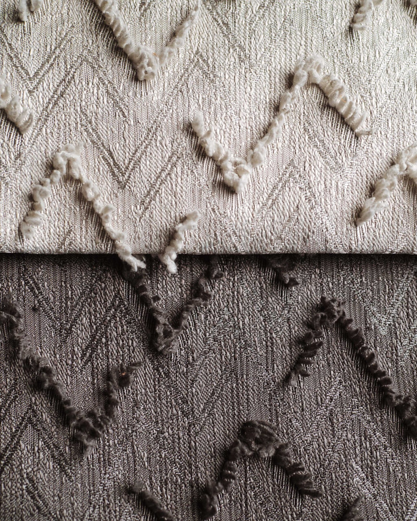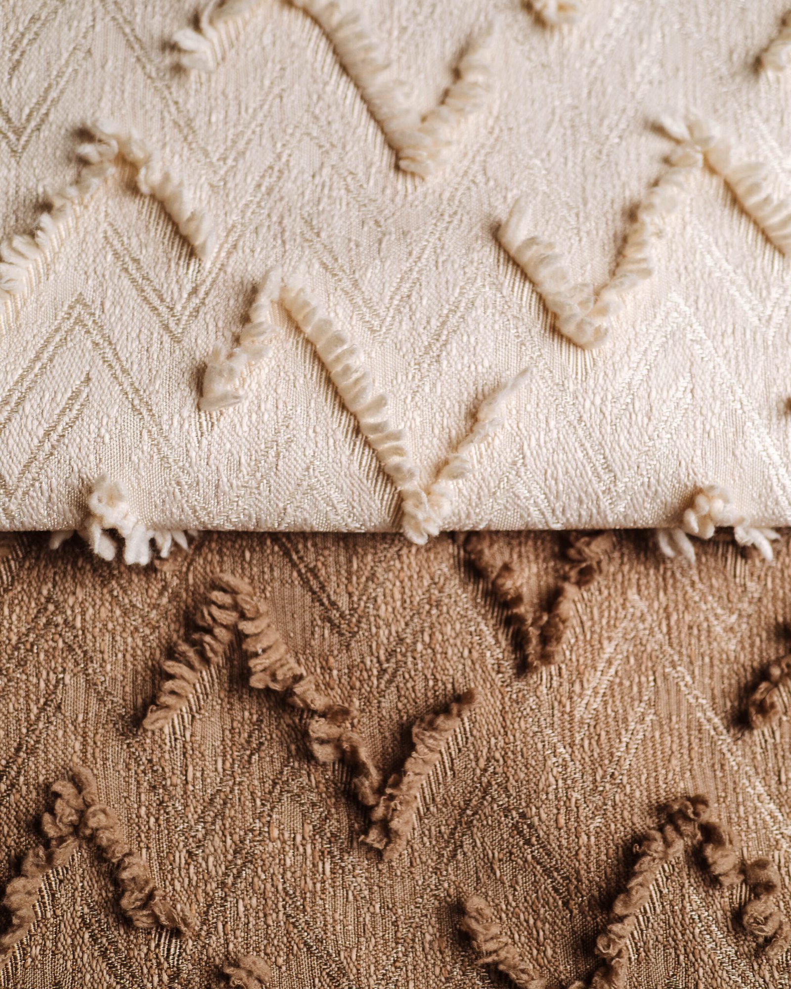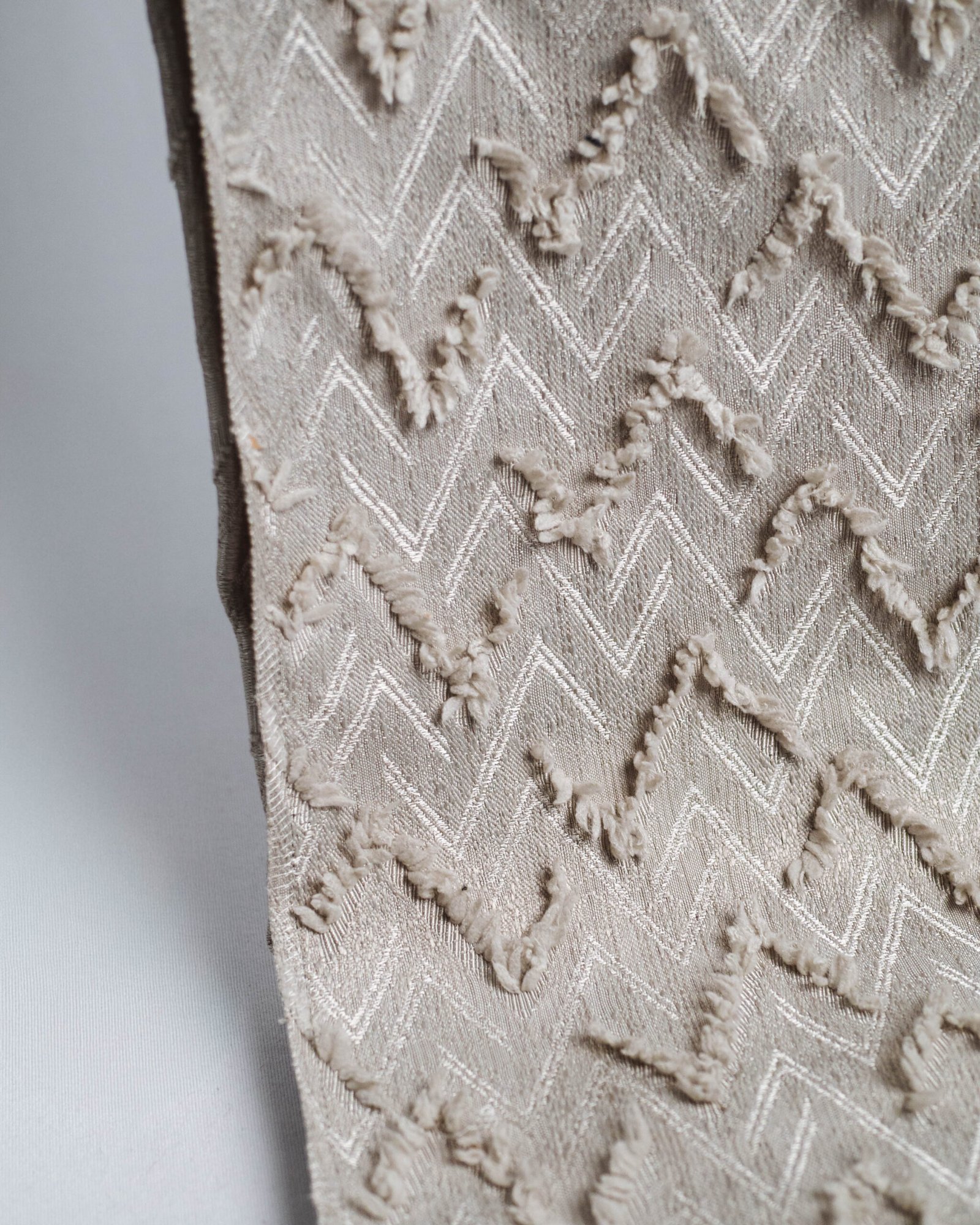 This statement fabric features an intricate raised chevron pattern that adds sculptural depth and couture-level texture to the surface. The refined neutral tones combined with its tactile, hand-finished look make it an exceptional choice for luxury drapery and high-end interior styling.