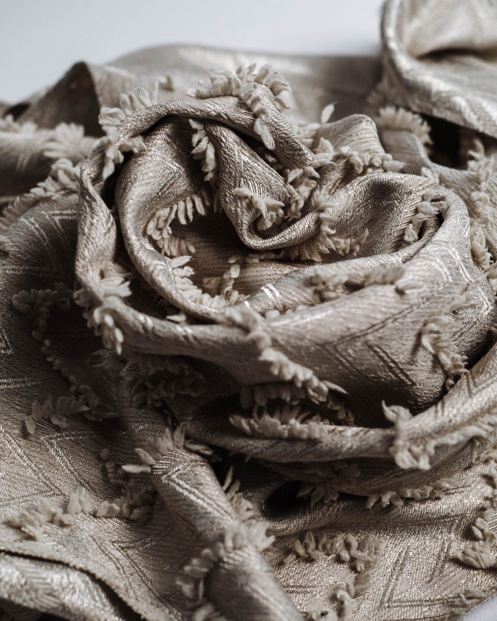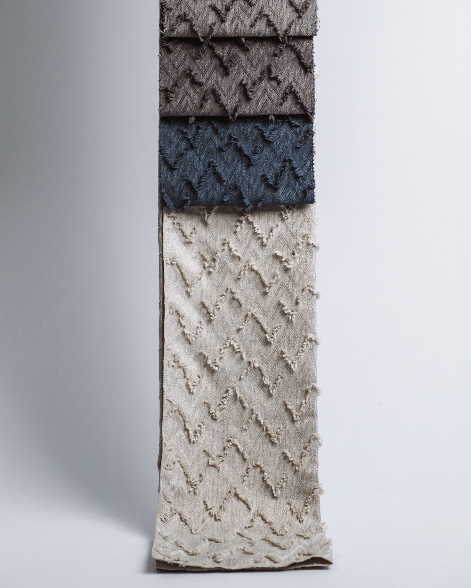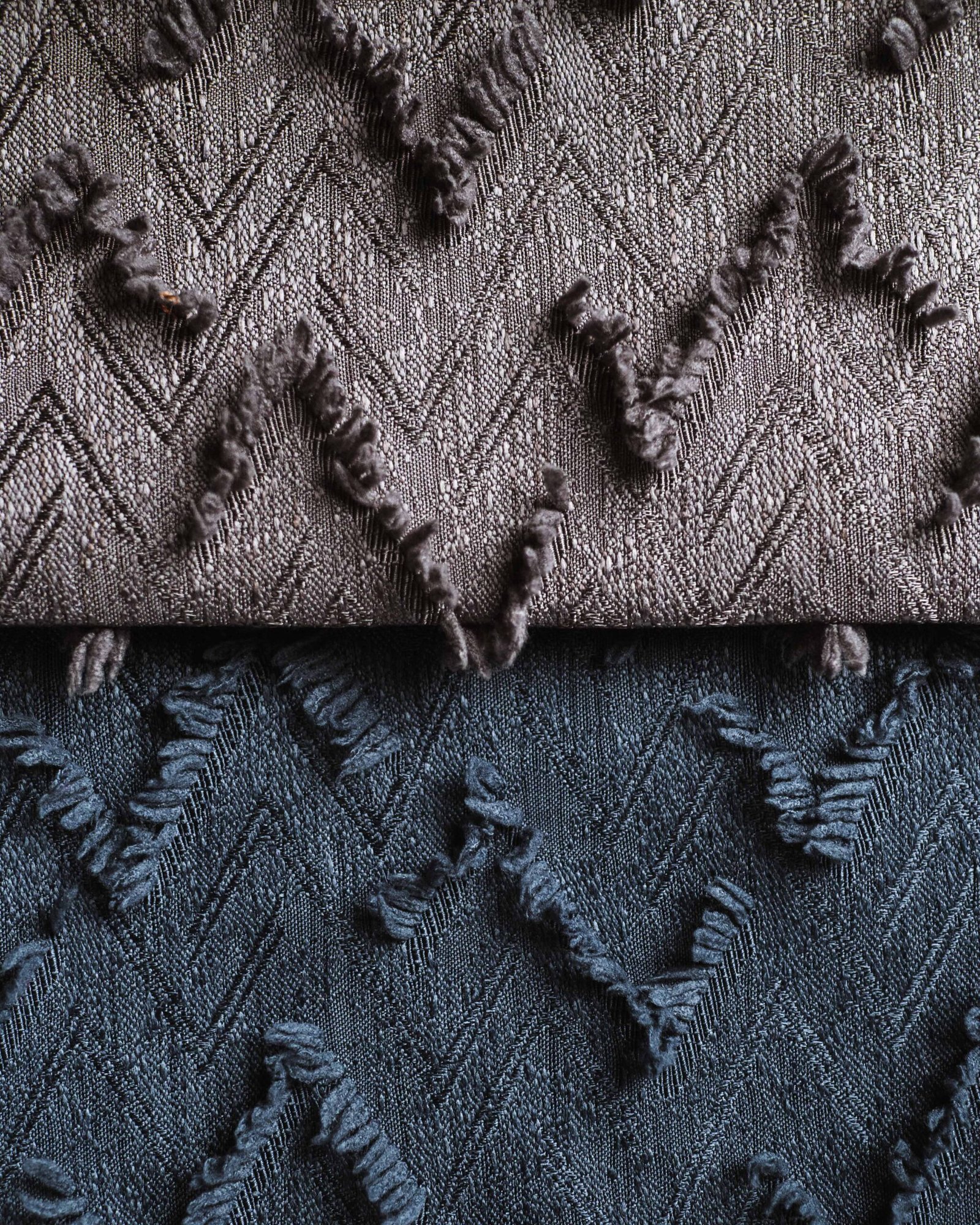 This statement fabric features an intricate raised chevron pattern that adds sculptural depth and couture-level texture to the surface. The refined neutral tones combined with its tactile, hand-finished look make it an exceptional choice for luxury drapery and high-end interior styling.