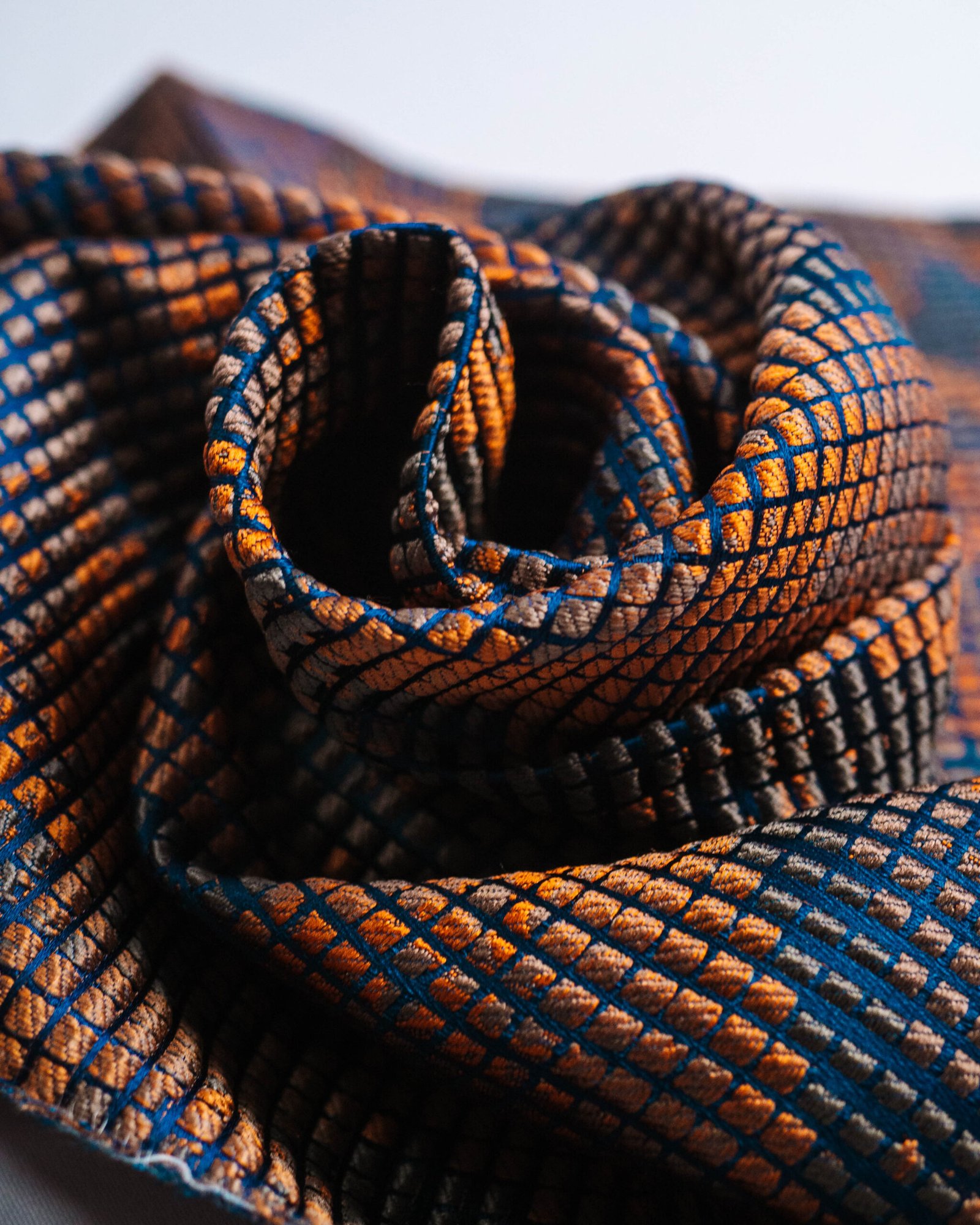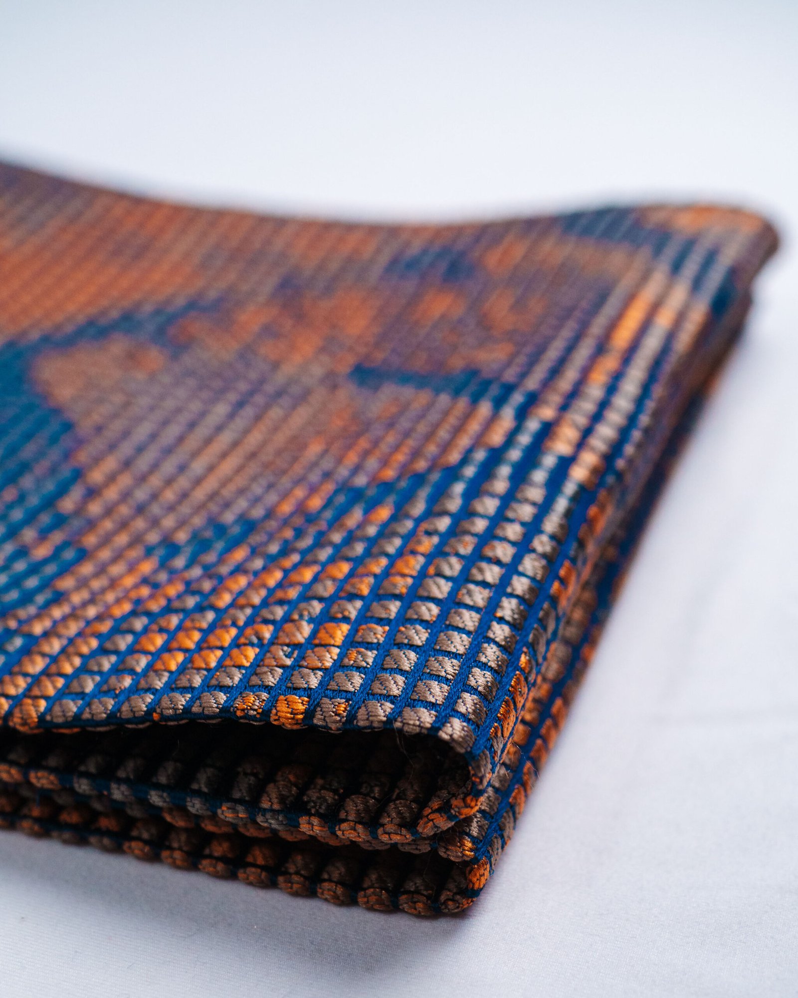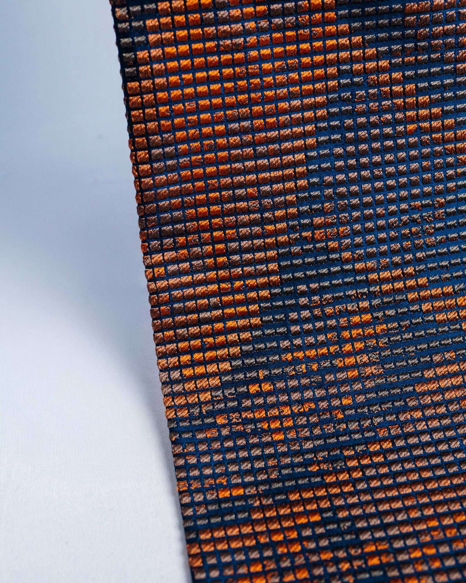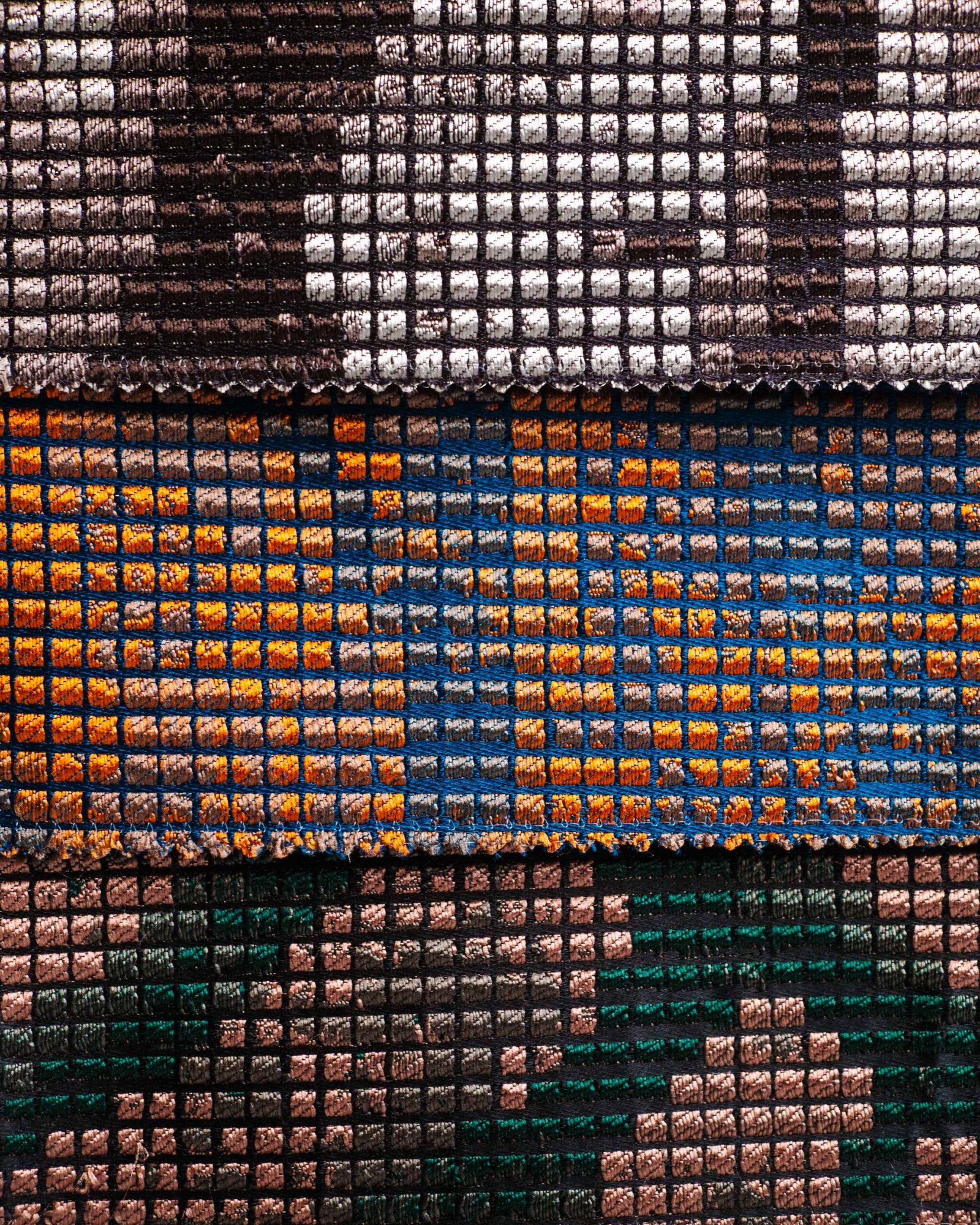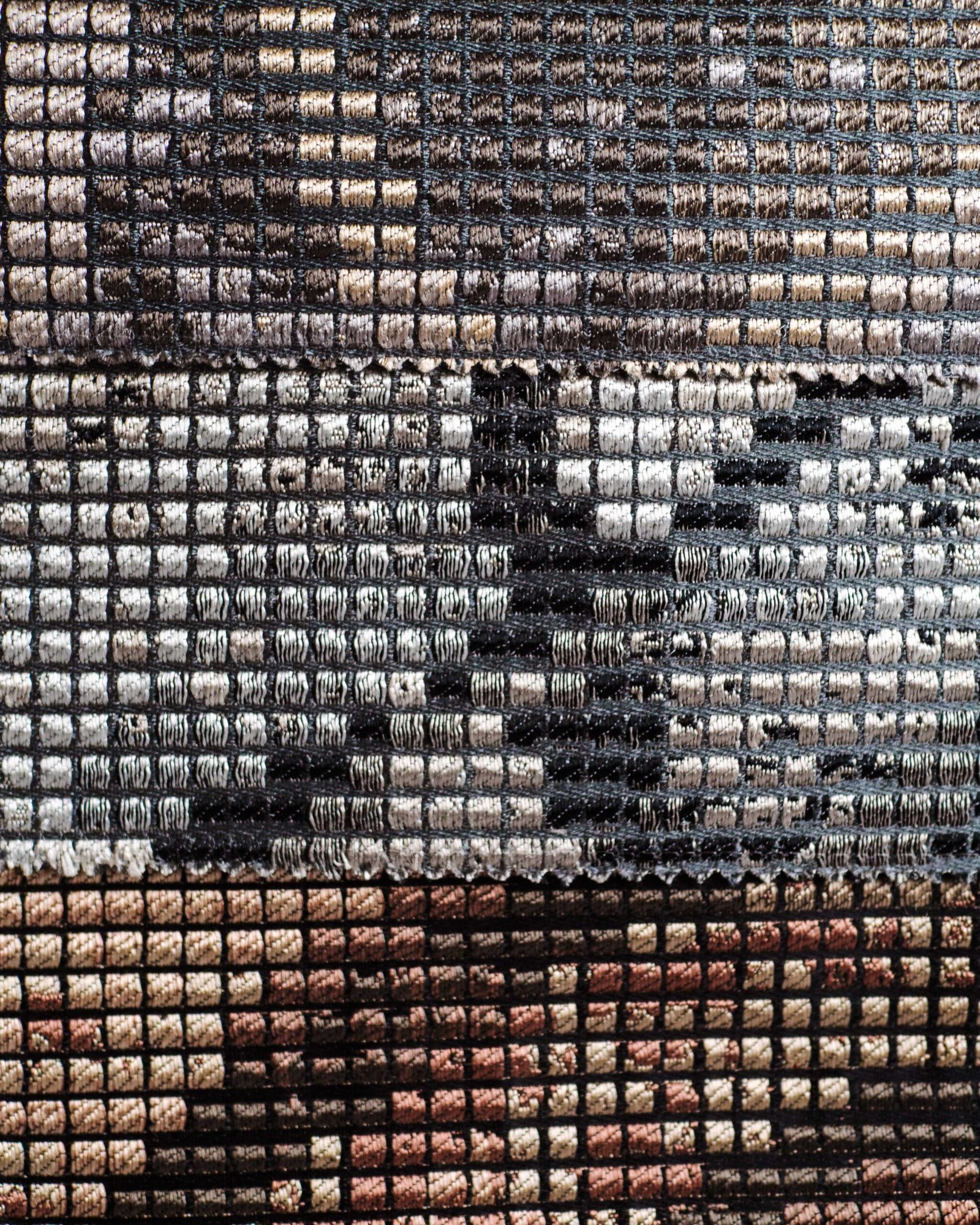 A striking, grid-structured textile composed of tightly woven square cells that create a pixel-like surface. The palette transitions from light stone and ash tones at the top into layered charcoal, taupe, and muted blush, gradually deepening into rich rust, burnt orange, and inky navy toward the base. Subtle abstract motifs emerge within the grid, giving the fabric a graphic, almost digital character while retaining a tactile, woven depth. The overall effect balances precision and warmth, making it well suited for contemporary upholstery, statement panels, or interiors that embrace texture, contrast, and modern artistry.