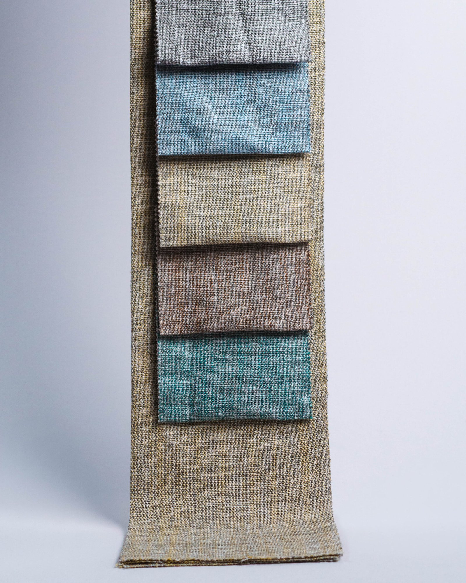 A premium curtain in a refined woven texture, enriched with elegant accents of muted turquoise, warm taupe, and soft grey. Its sophisticated palette and natural tactile finish bring depth, serenity, and contemporary luxury to the interior.