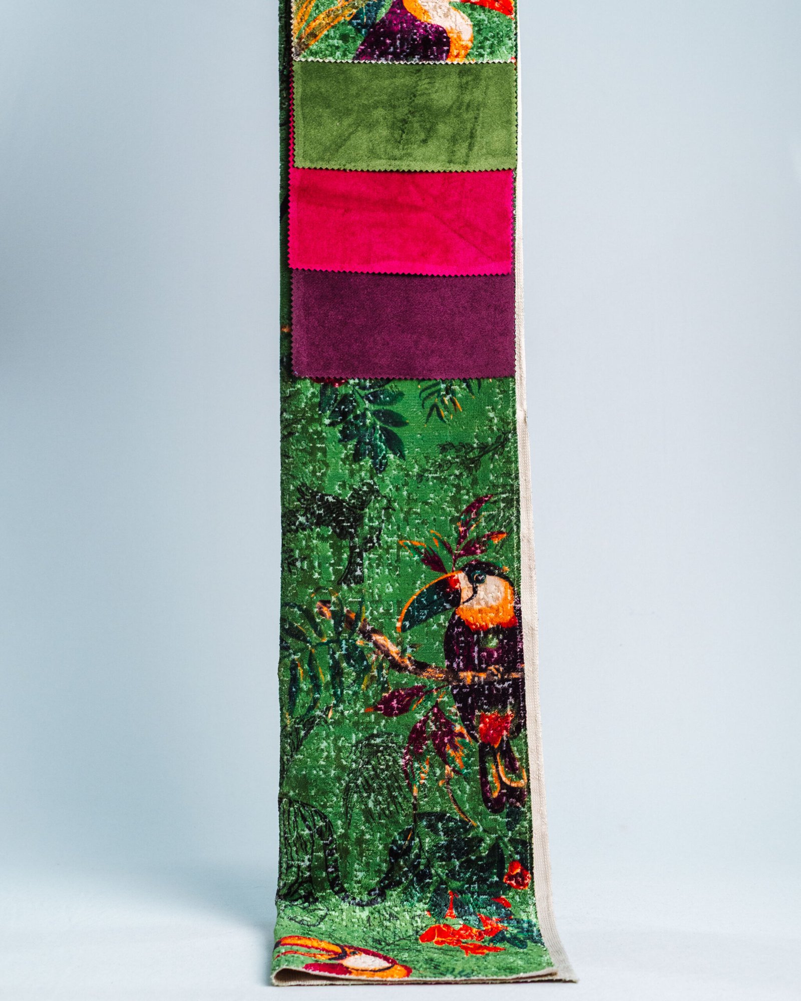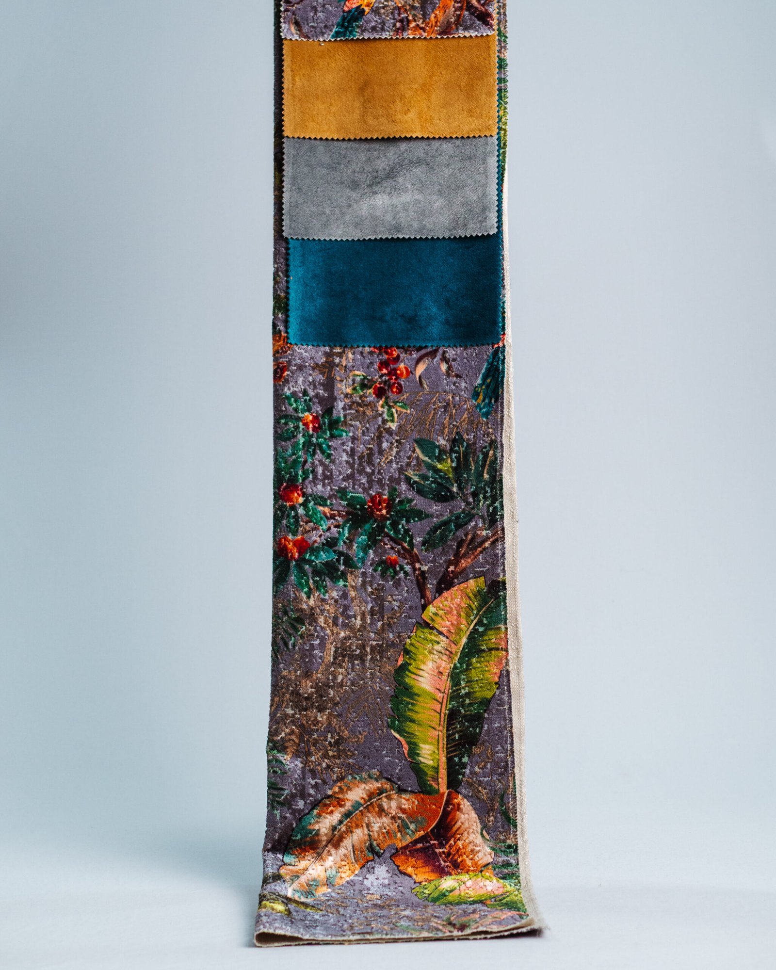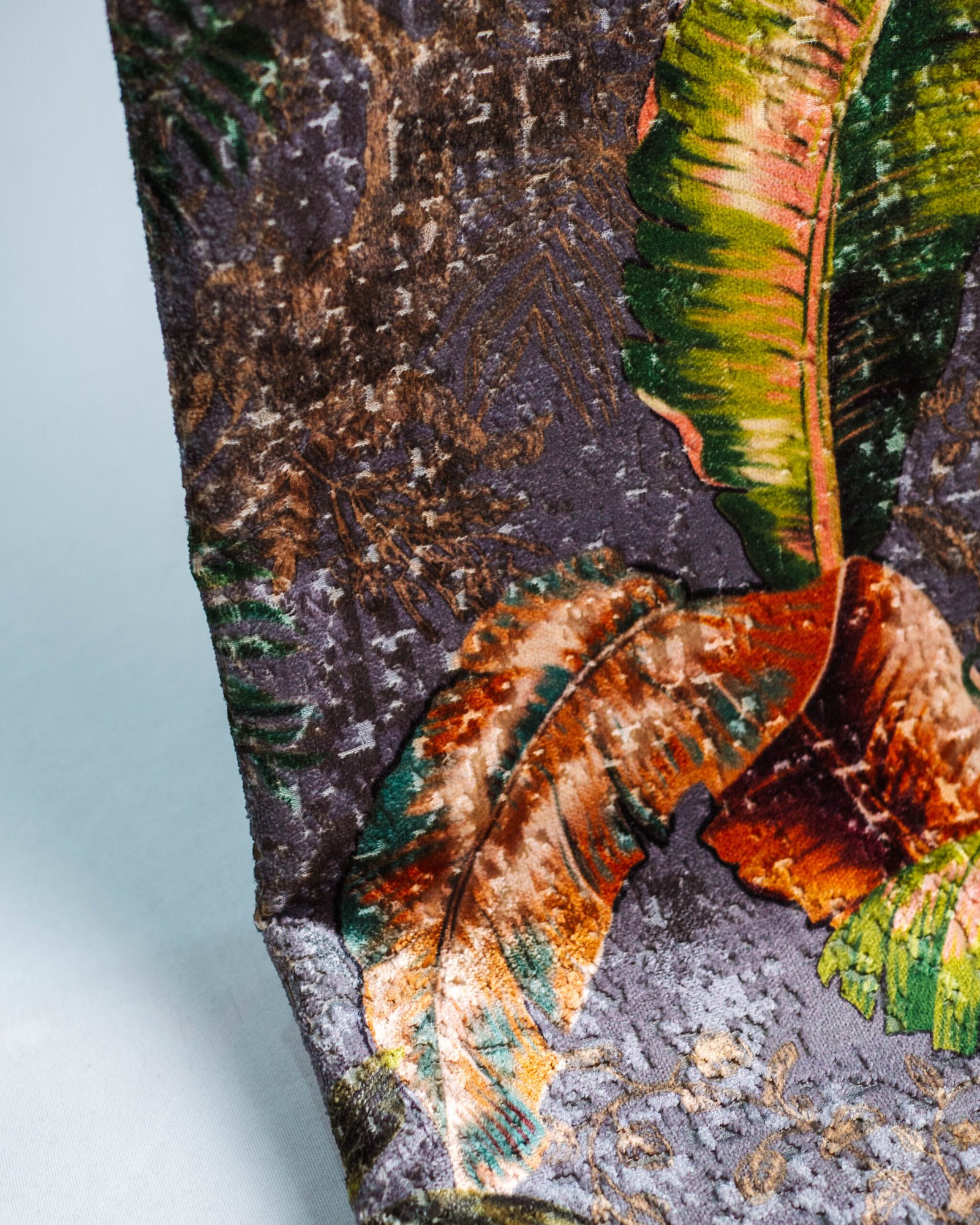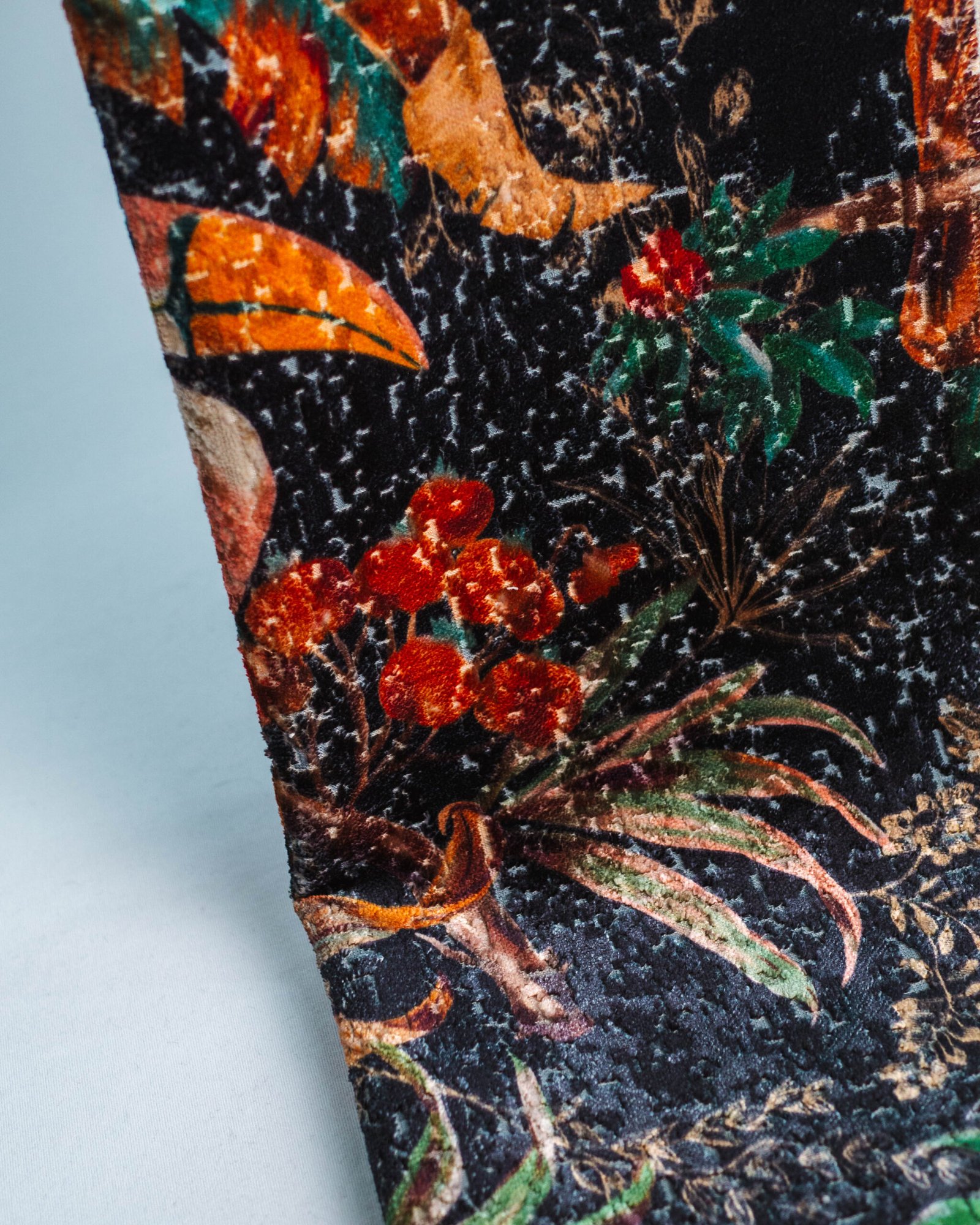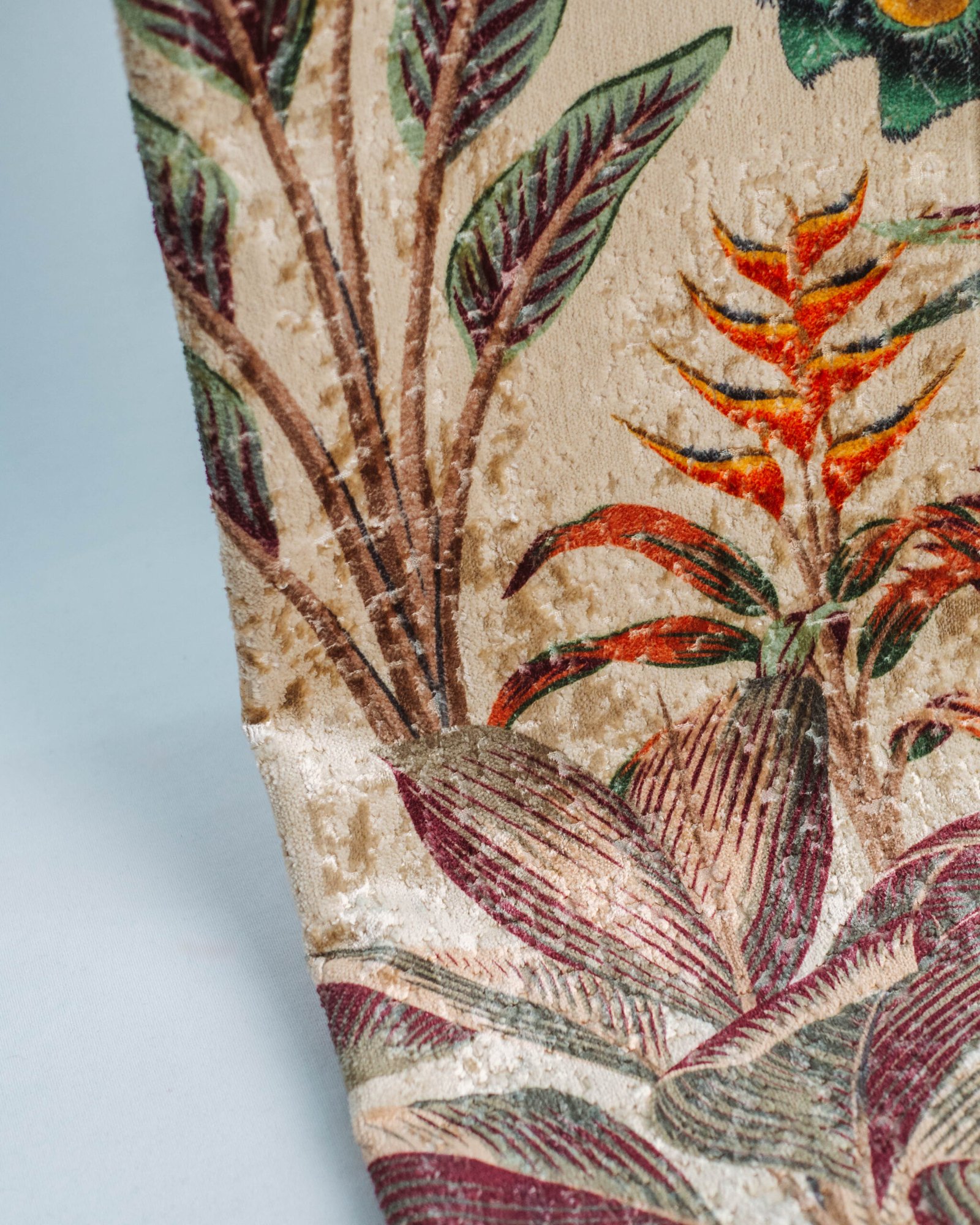 This couture-inspired curtain combines vibrant jewel tones with an opulent botanical motif, creating a bold yet elegant statement. Its velvety surface and rich color depth bring a gallery-level sophistication to any luxury interior.
