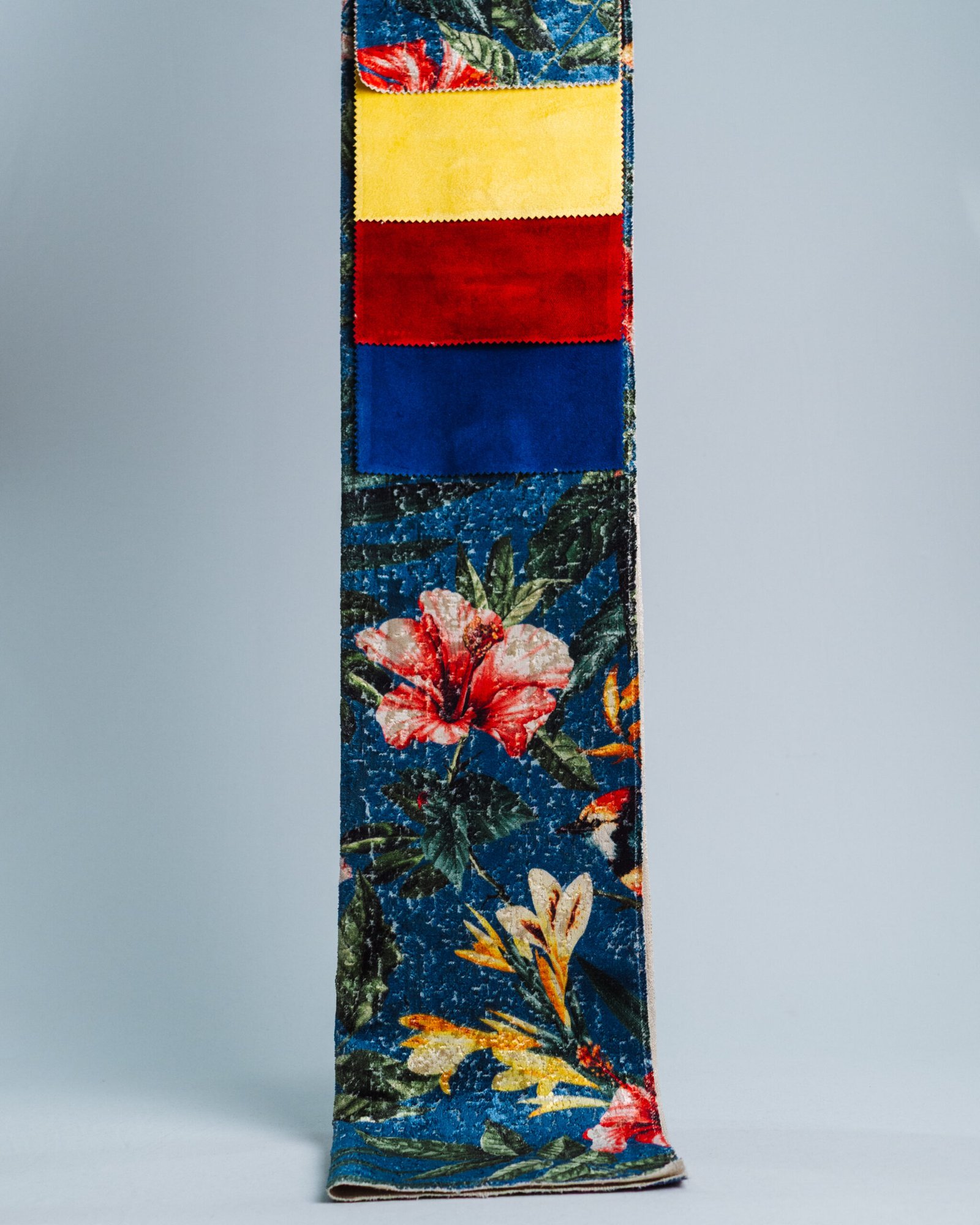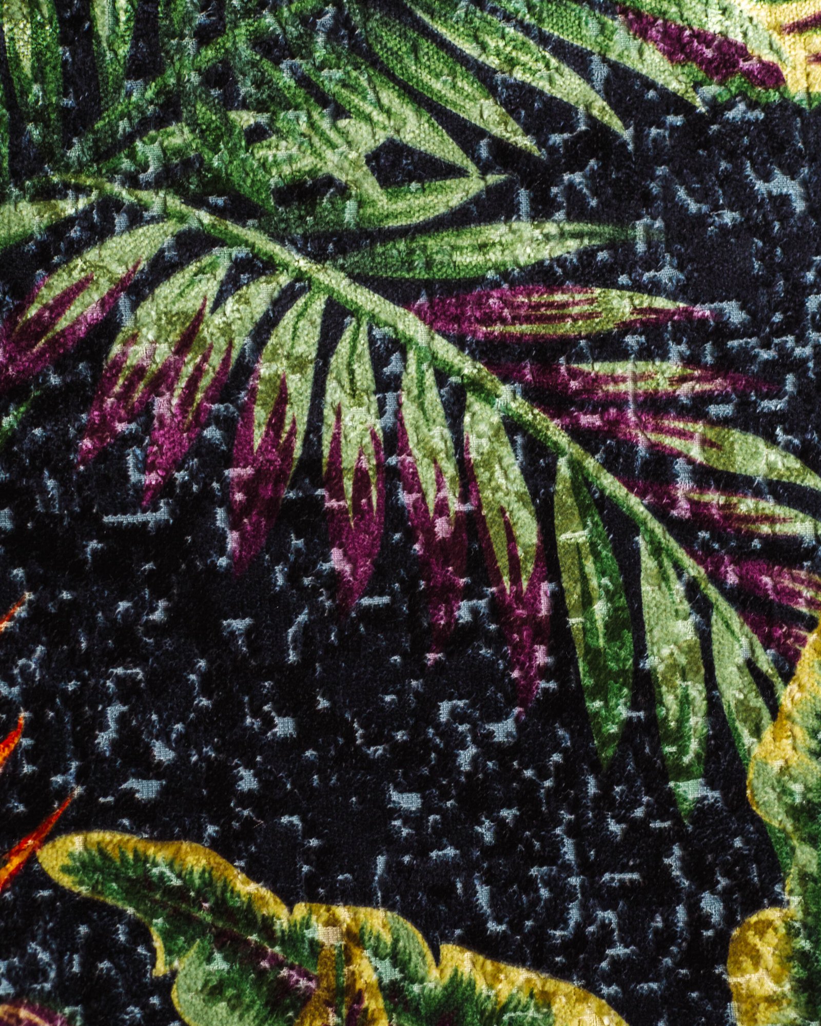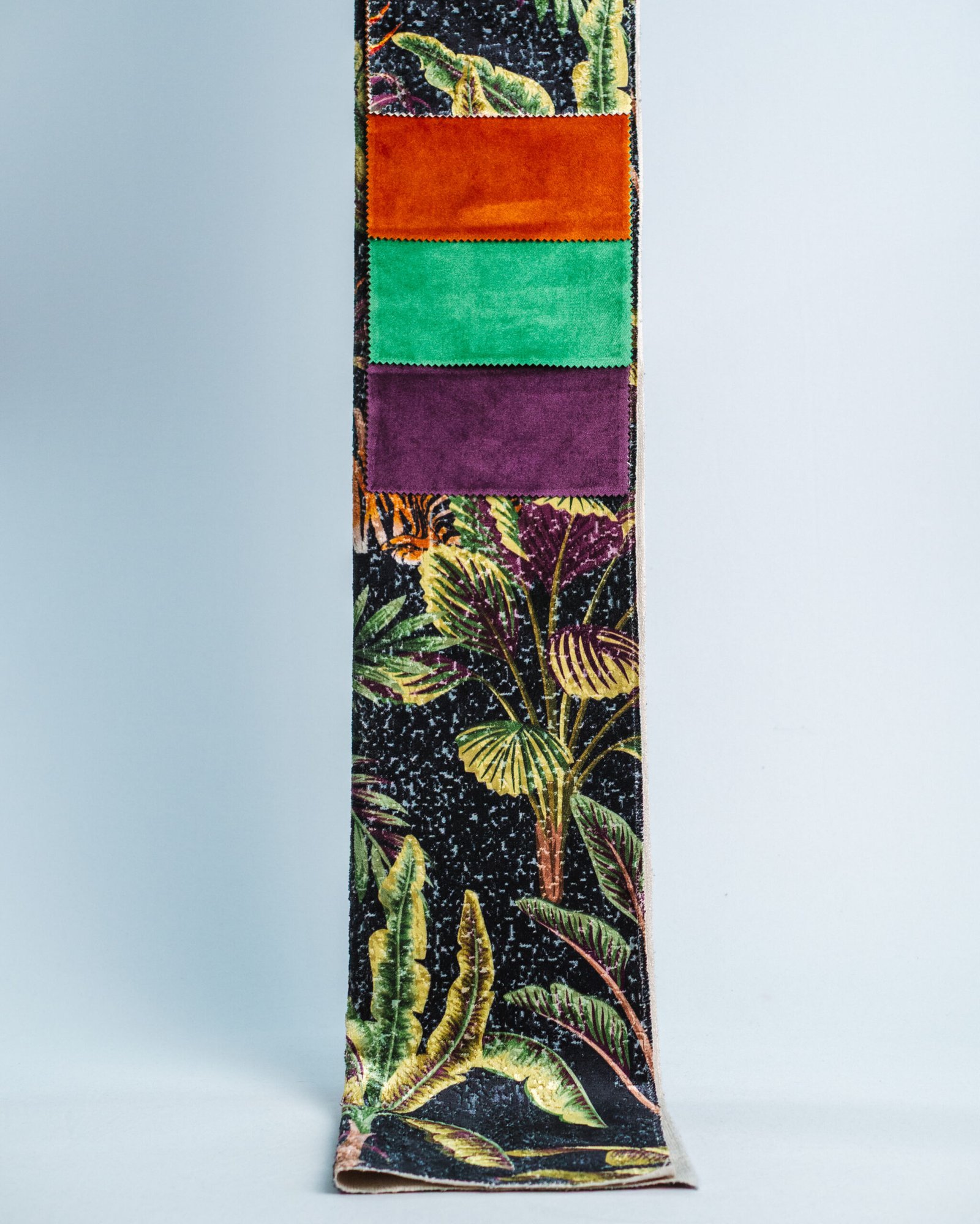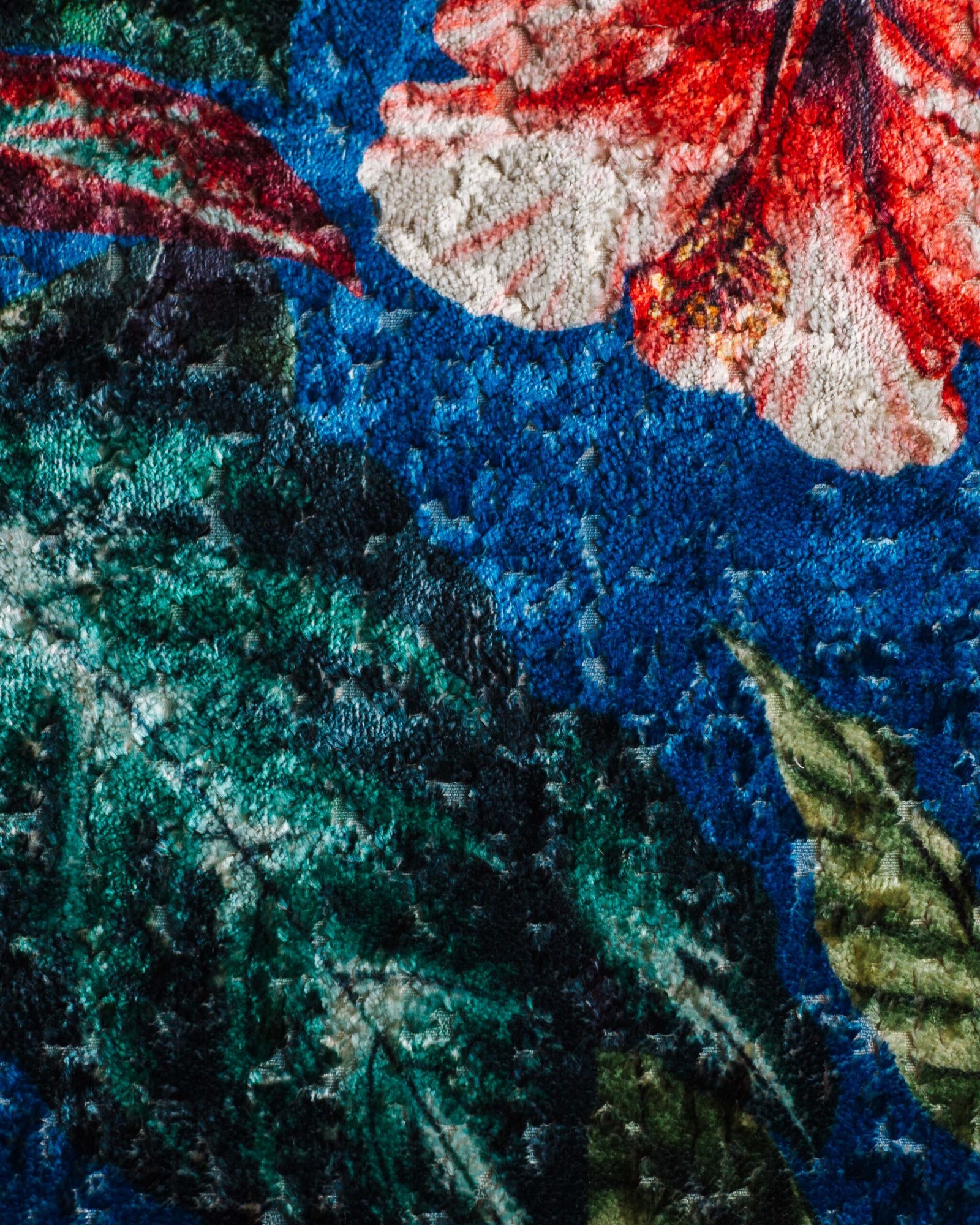 This couture-inspired curtain combines vibrant jewel tones with an opulent botanical motif, creating a bold yet elegant statement. Its velvety surface and rich color depth bring a gallery-level sophistication to any luxury interior.