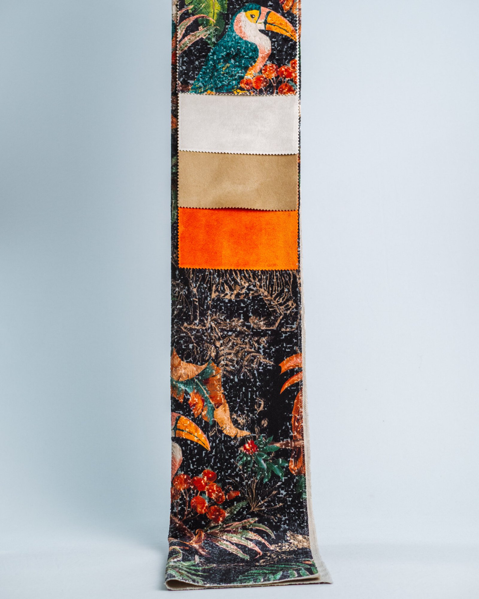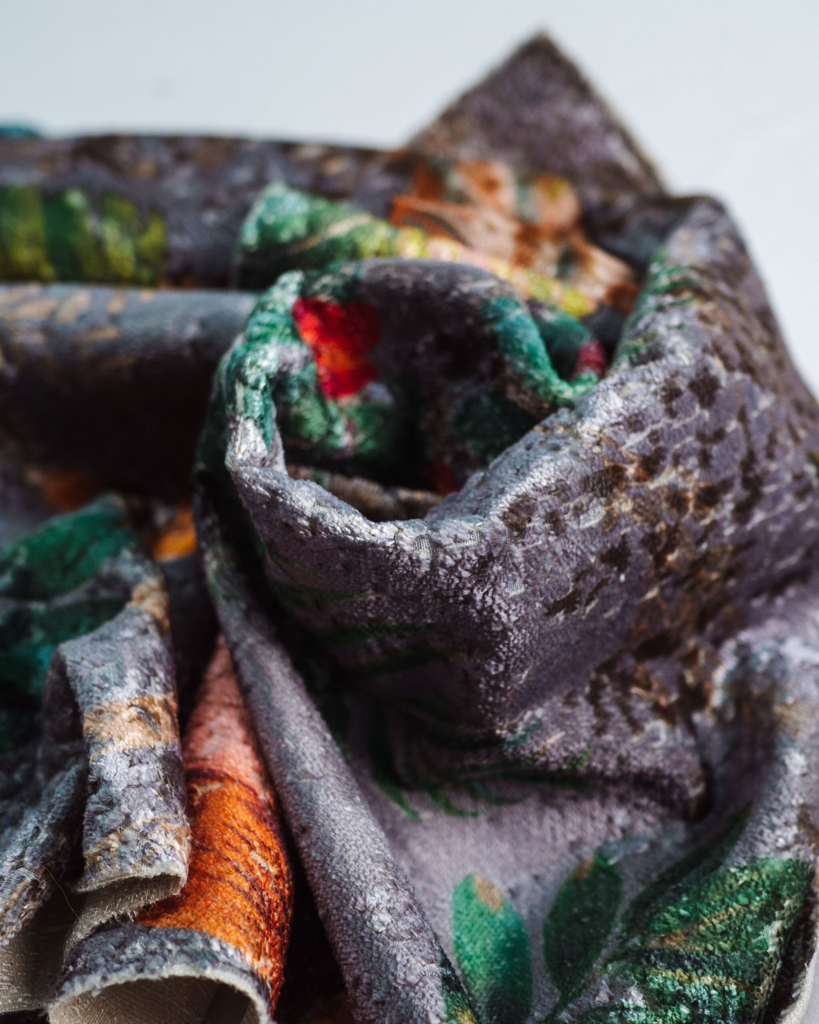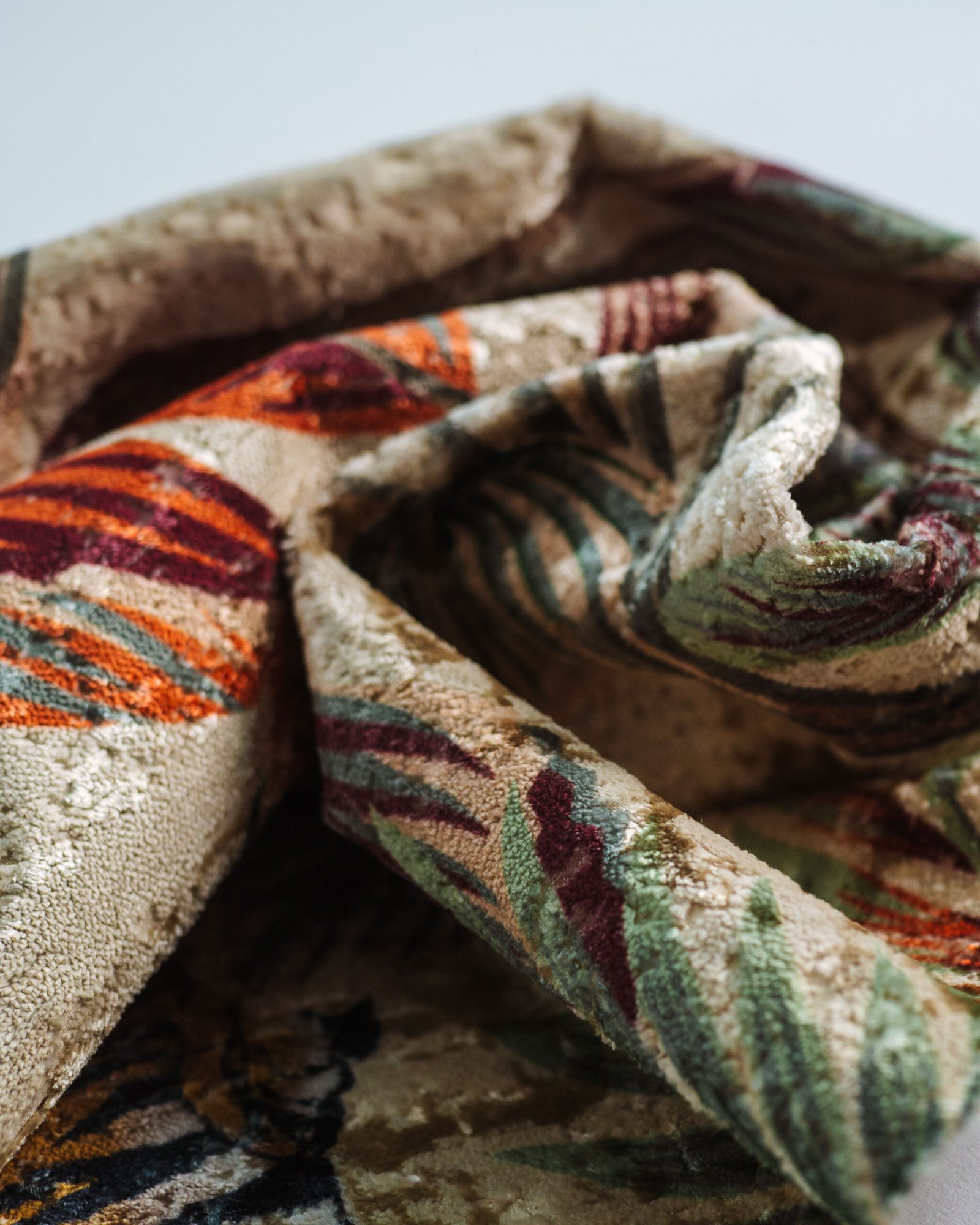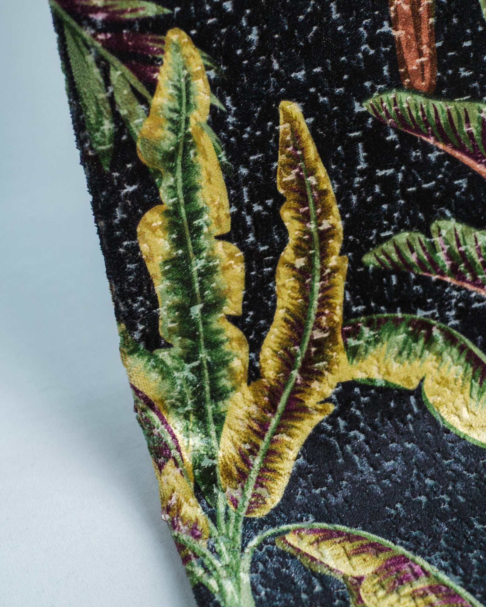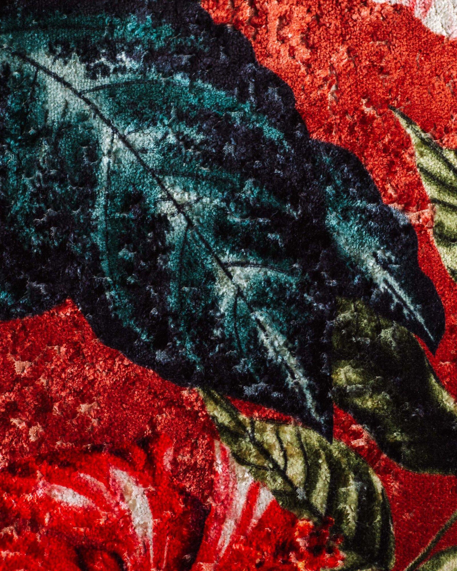 This couture-inspired curtain combines vibrant jewel tones with an opulent botanical motif, creating a bold yet elegant statement. Its velvety surface and rich color depth bring a gallery-level sophistication to any luxury interior.