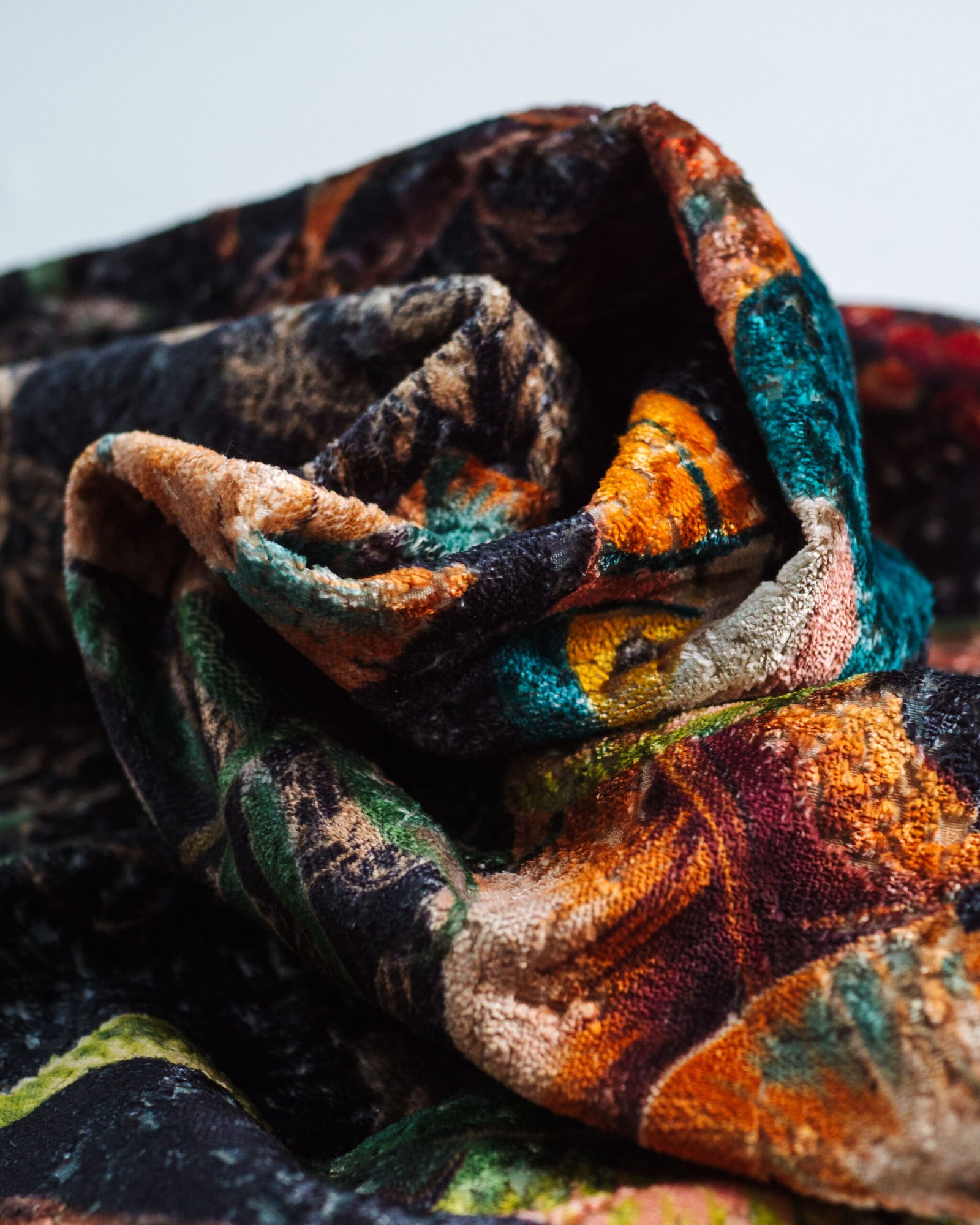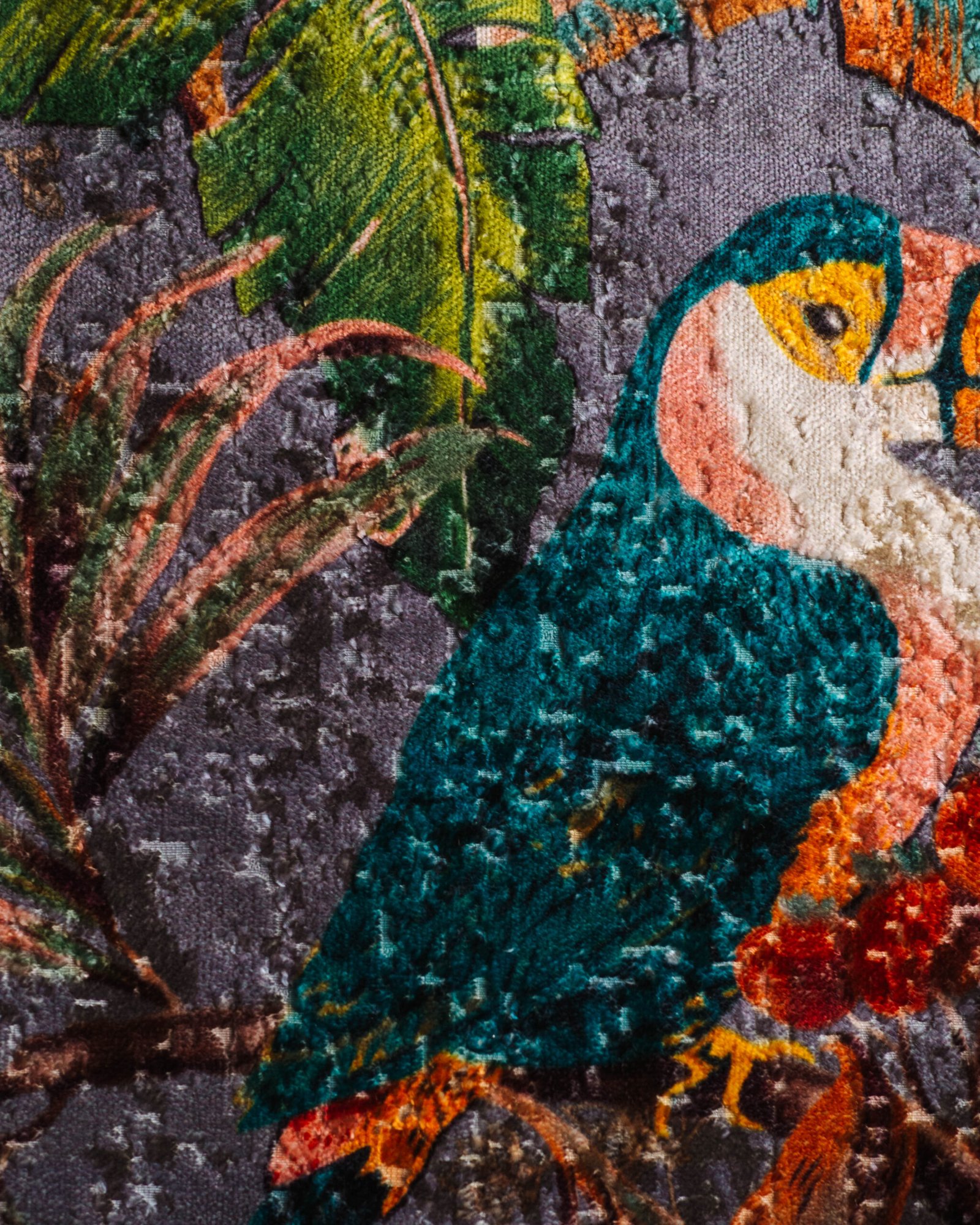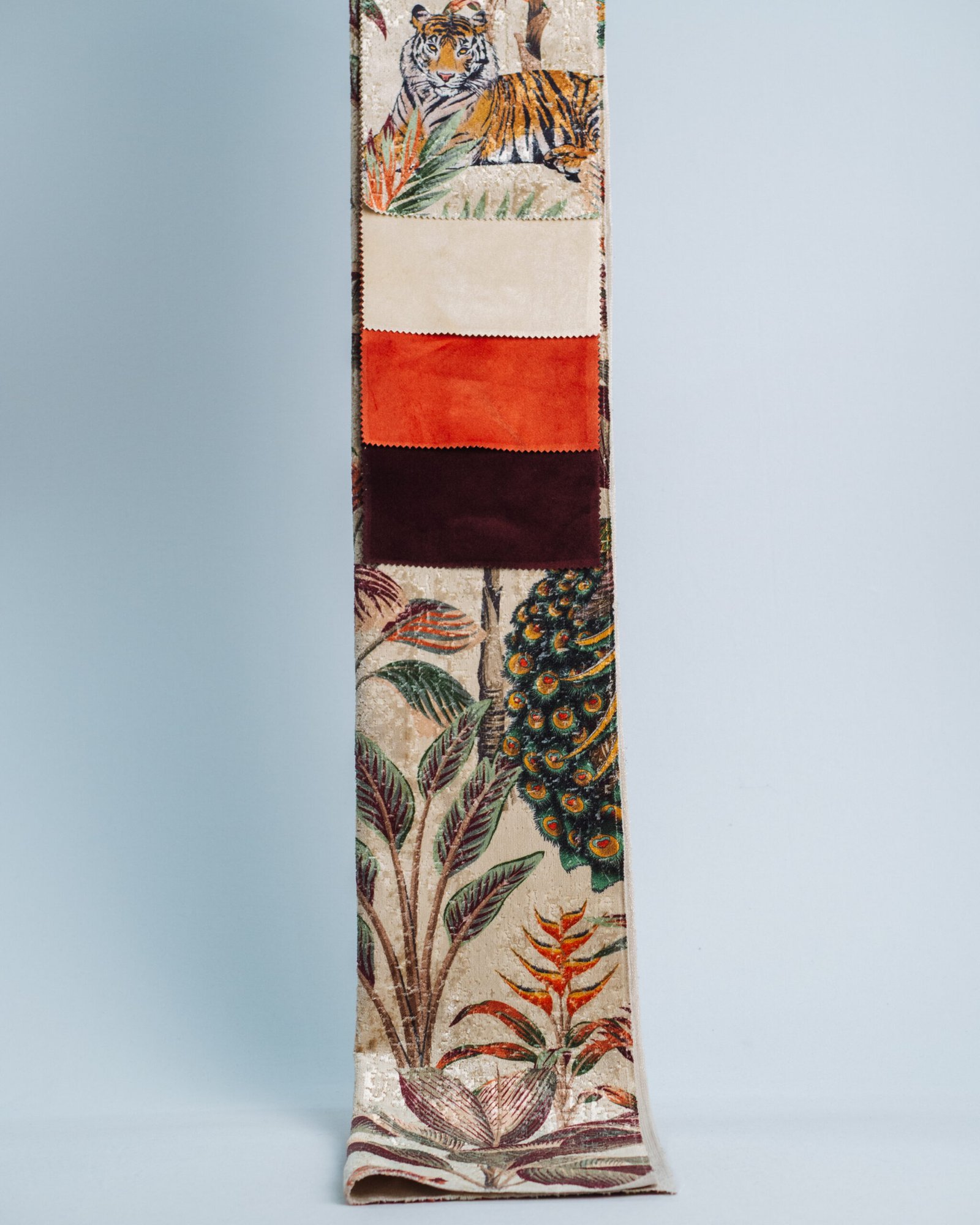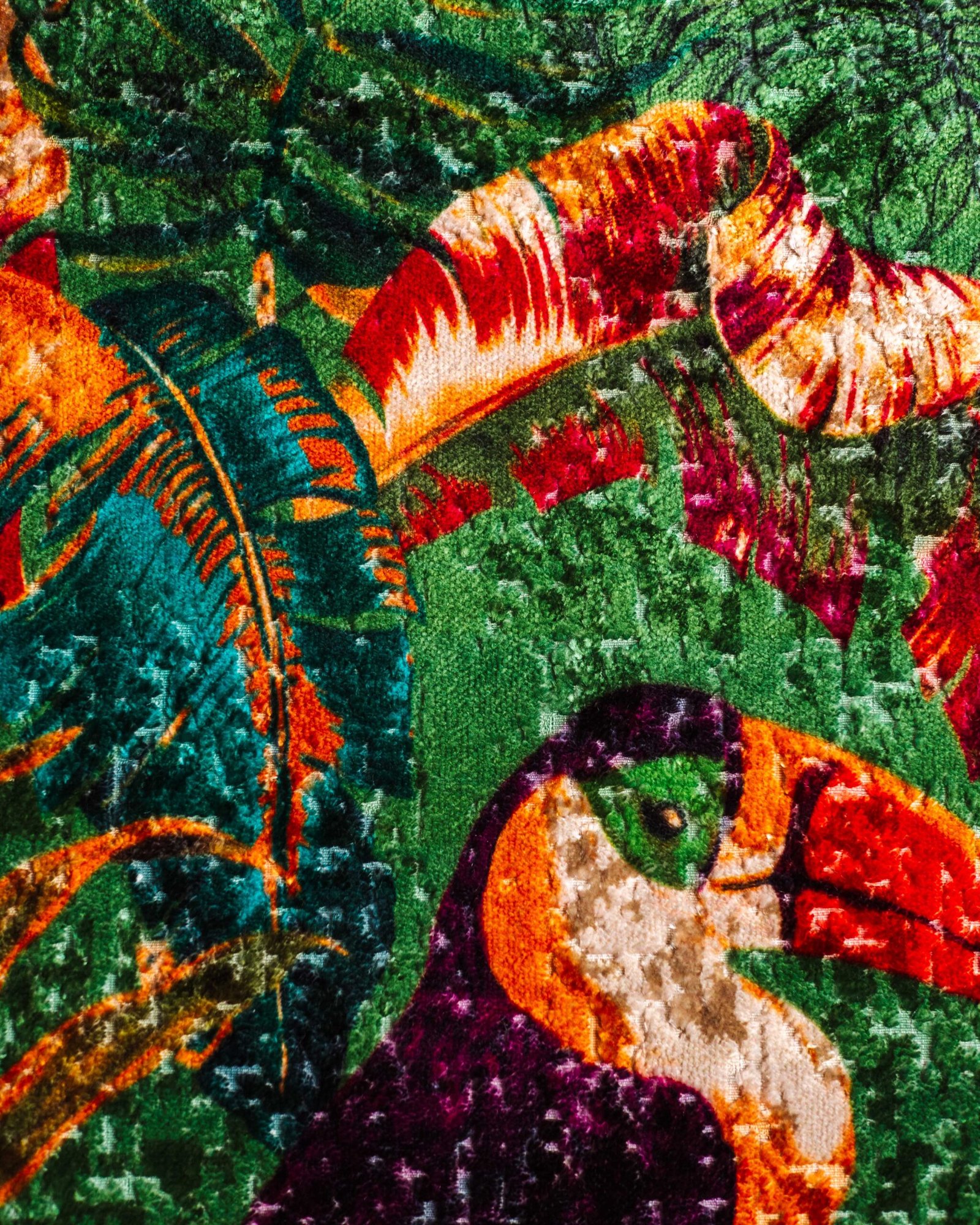 This couture-inspired curtain combines vibrant jewel tones with an opulent botanical motif, creating a bold yet elegant statement. Its velvety surface and rich color depth bring a gallery-level sophistication to any luxury interior.