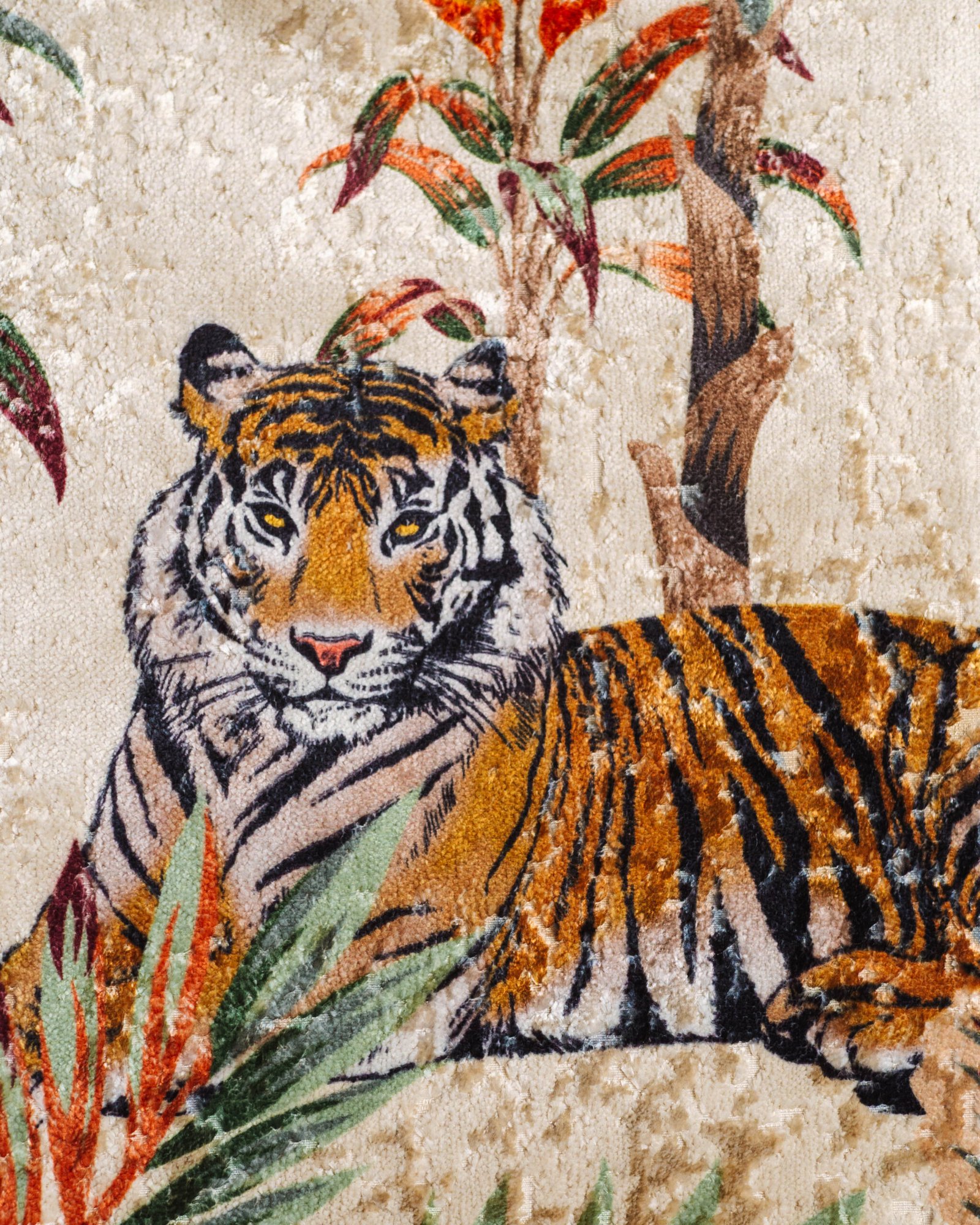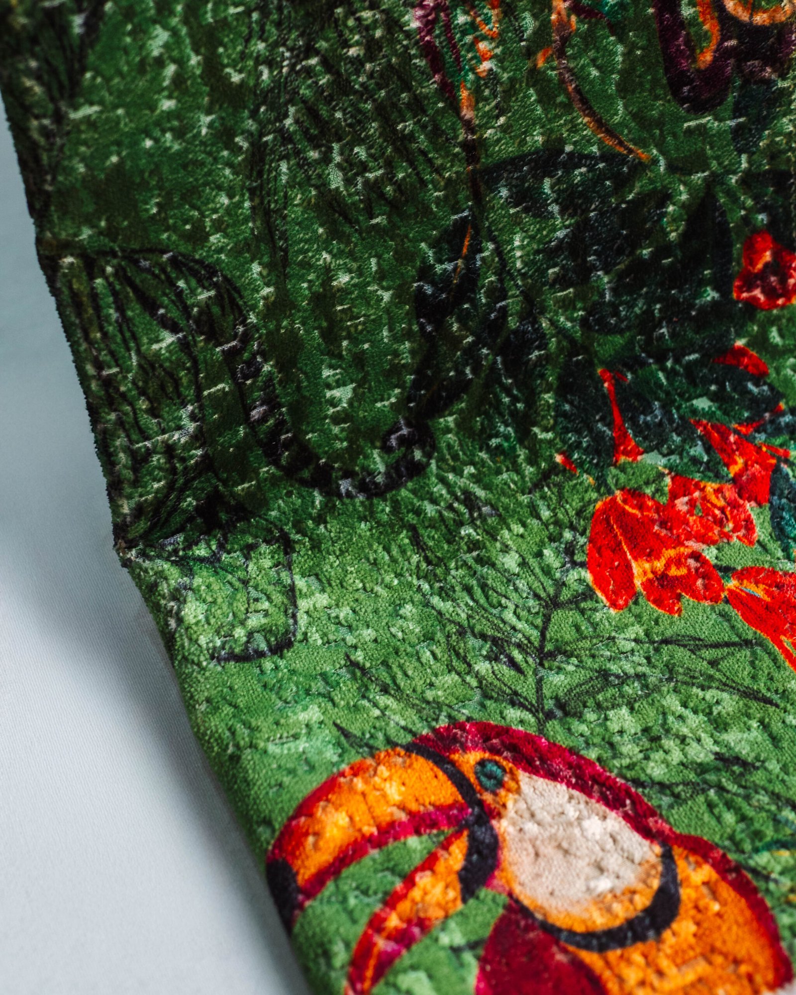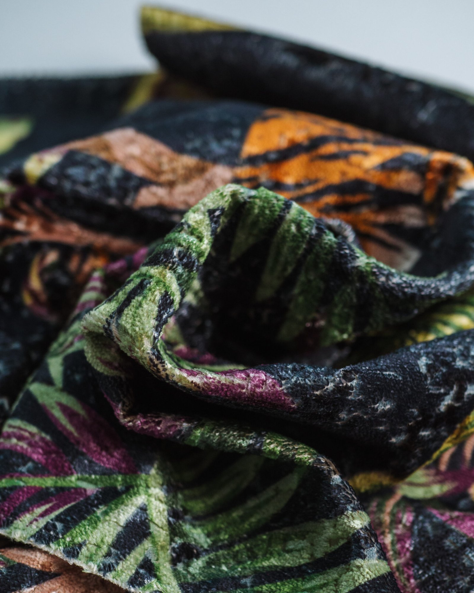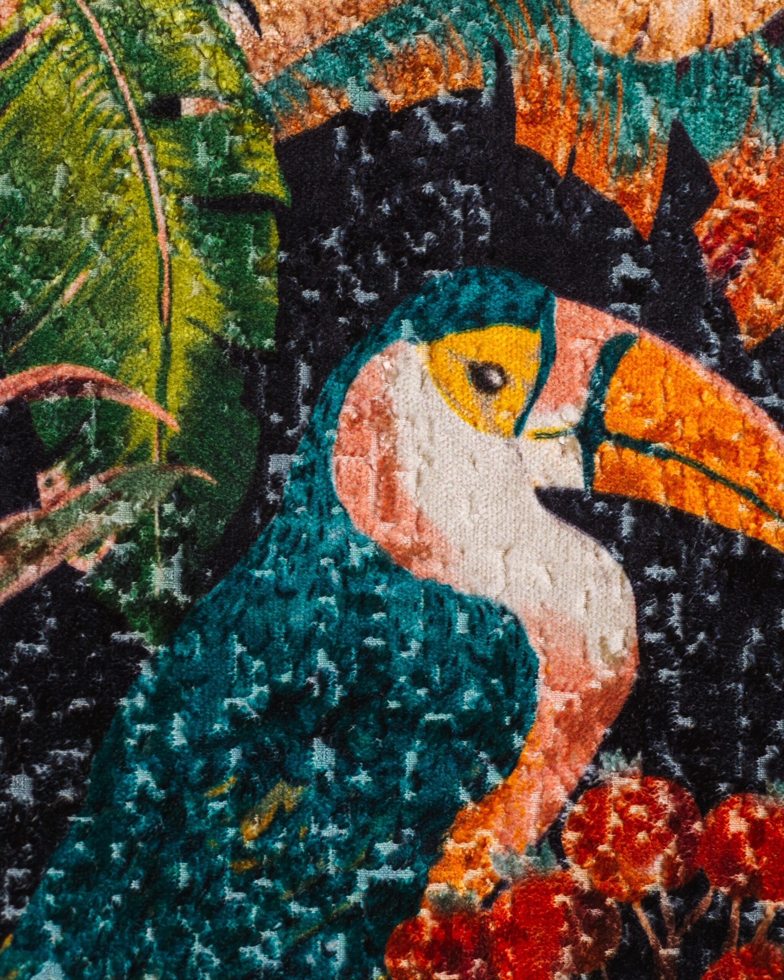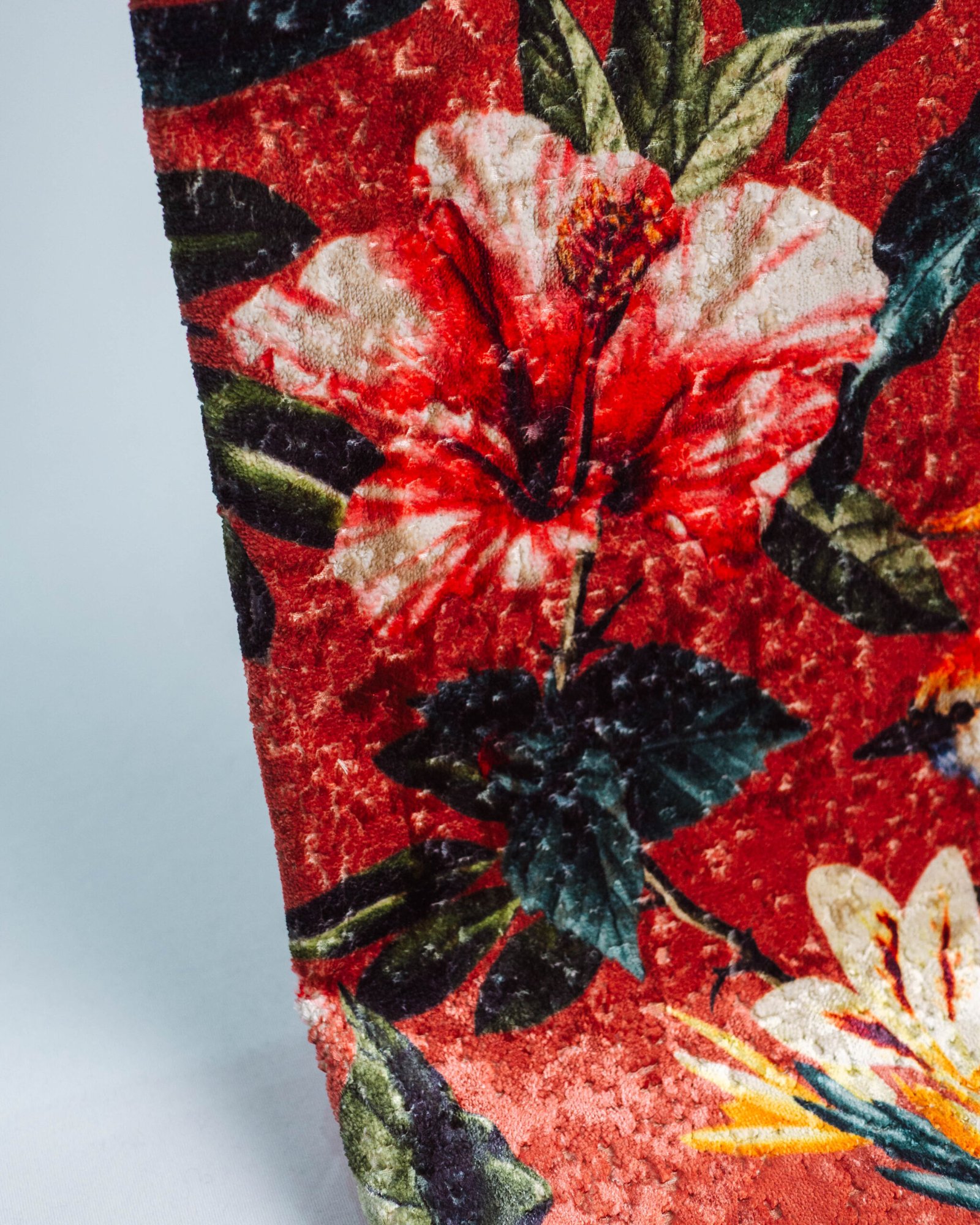 This couture-inspired curtain combines vibrant jewel tones with an opulent botanical motif, creating a bold yet elegant statement. Its velvety surface and rich color depth bring a gallery-level sophistication to any luxury interior.