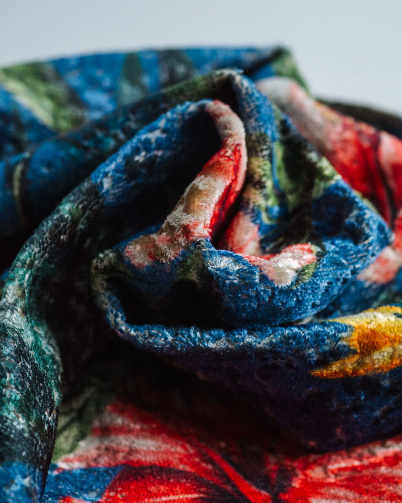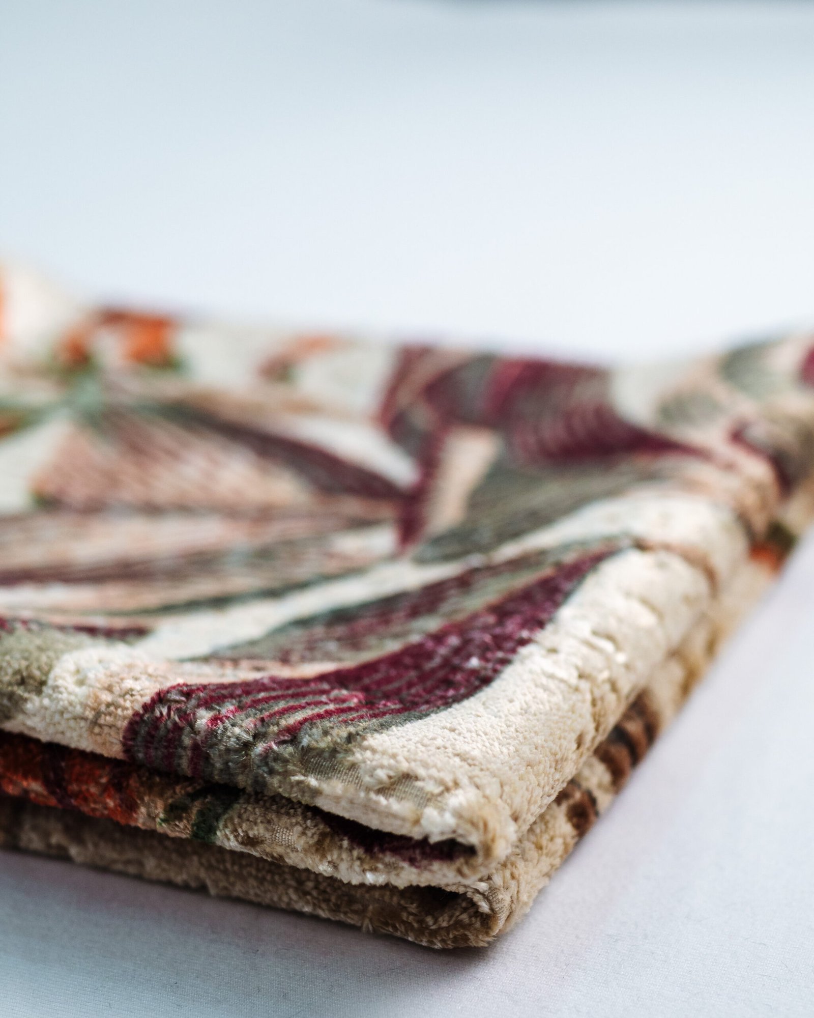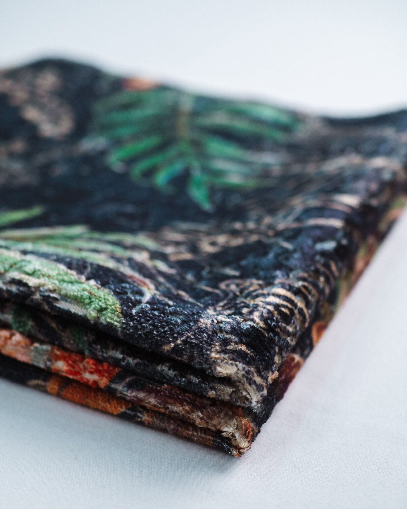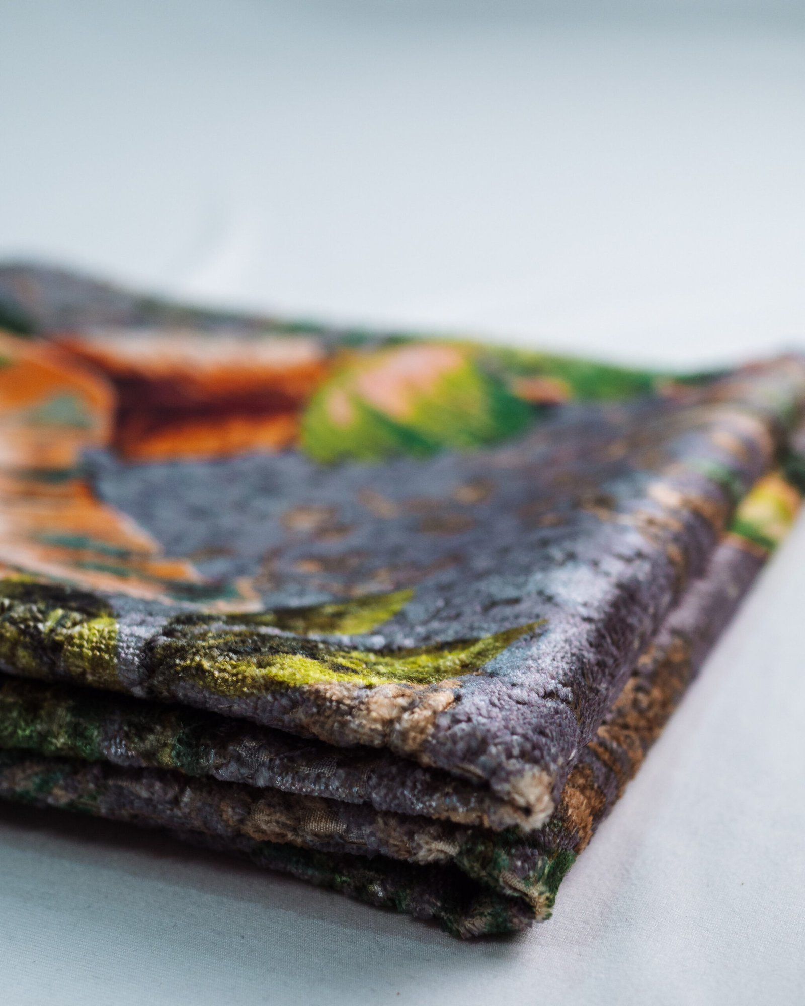 This couture-inspired curtain combines vibrant jewel tones with an opulent botanical motif, creating a bold yet elegant statement. Its velvety surface and rich color depth bring a gallery-level sophistication to any luxury interior.