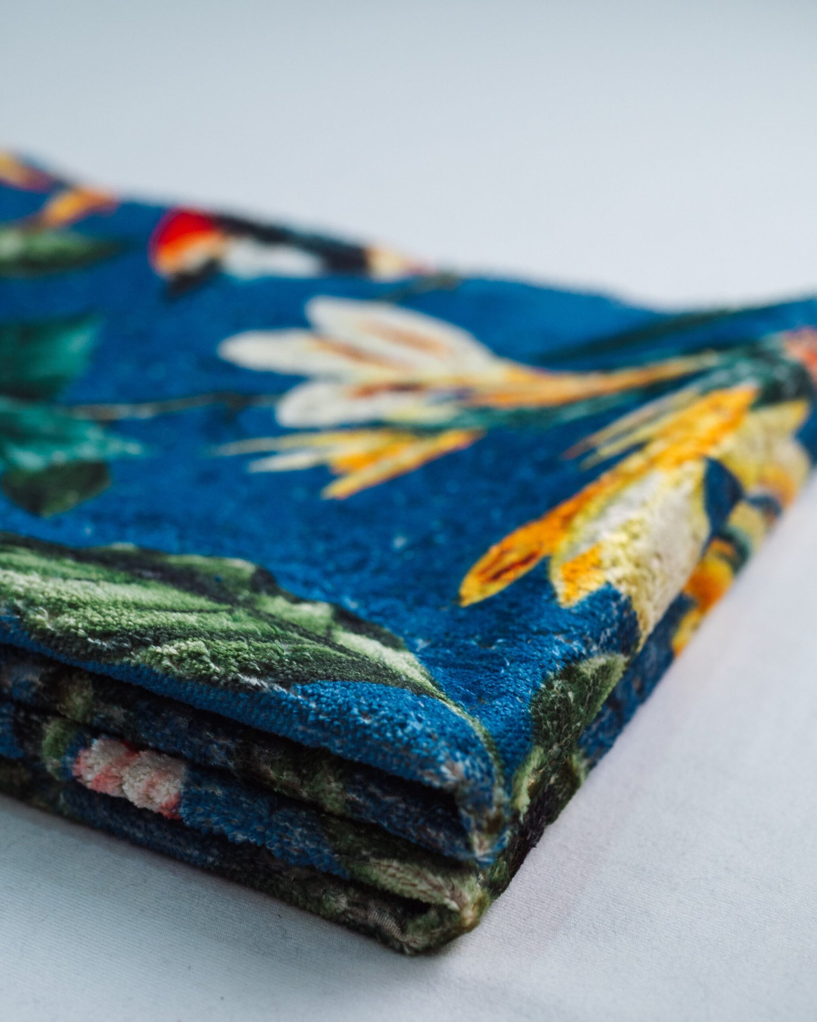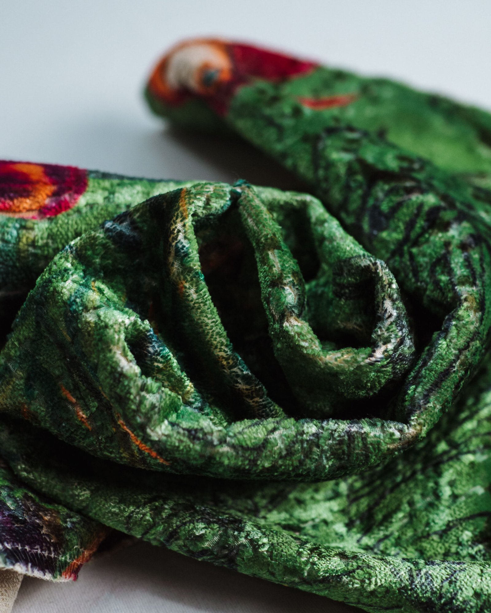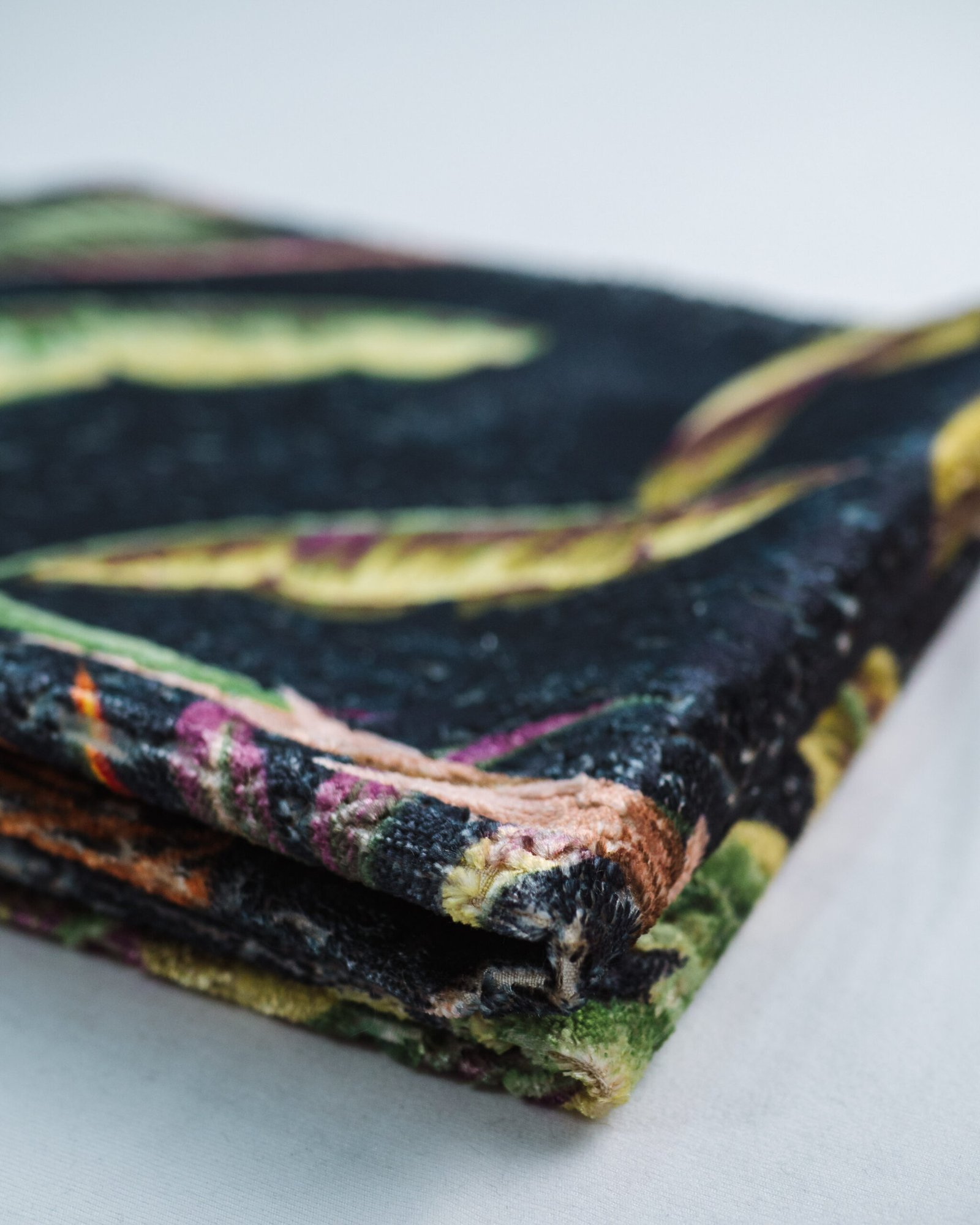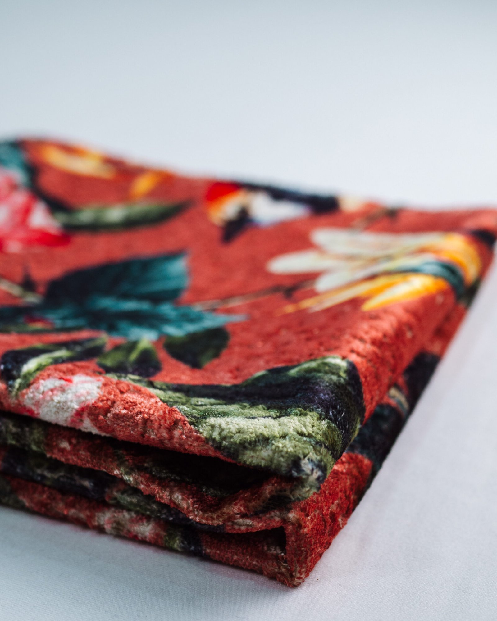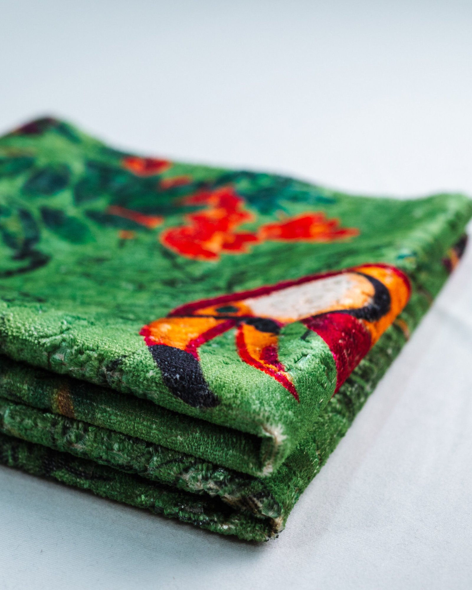 This couture-inspired curtain combines vibrant jewel tones with an opulent botanical motif, creating a bold yet elegant statement. Its velvety surface and rich color depth bring a gallery-level sophistication to any luxury interior.