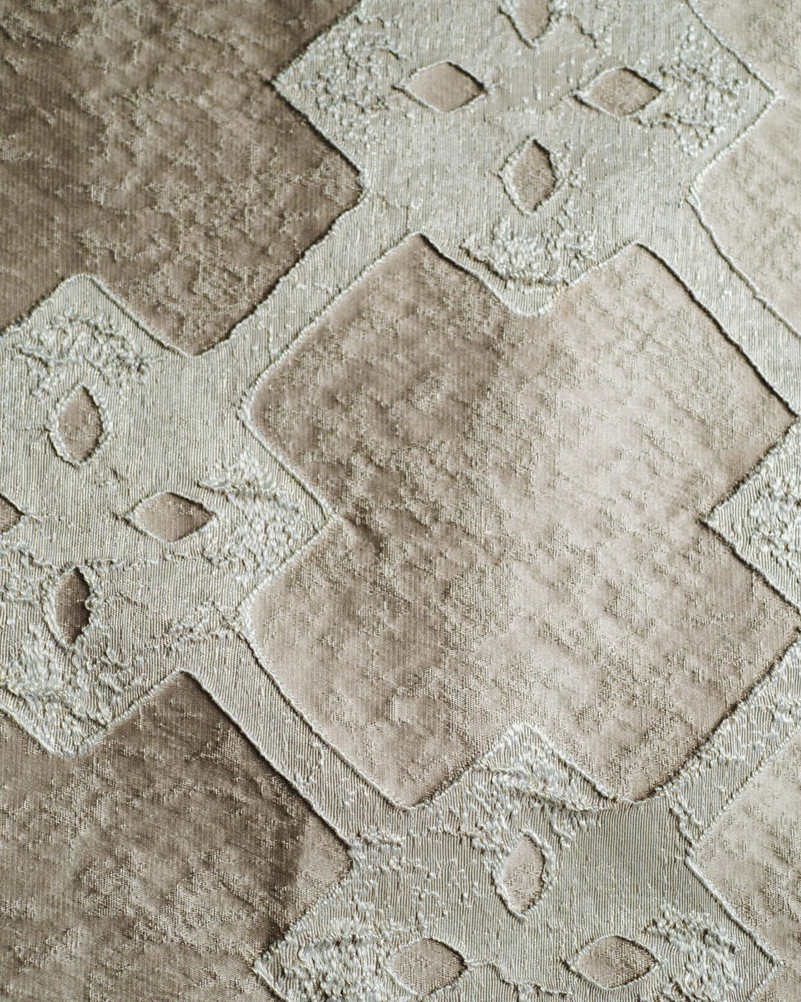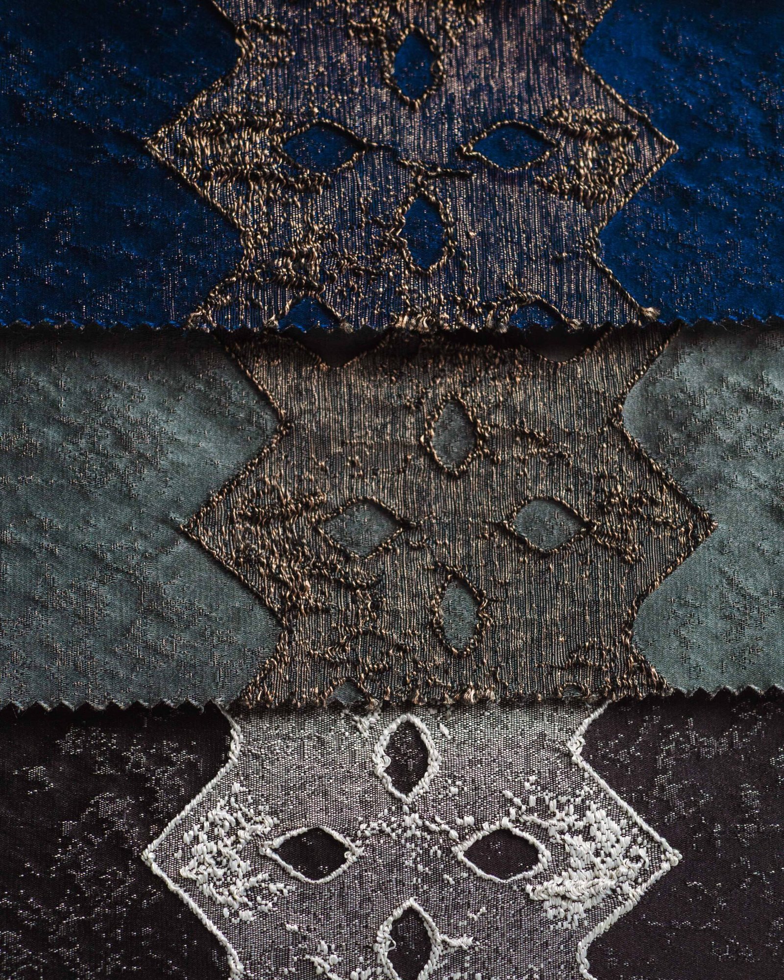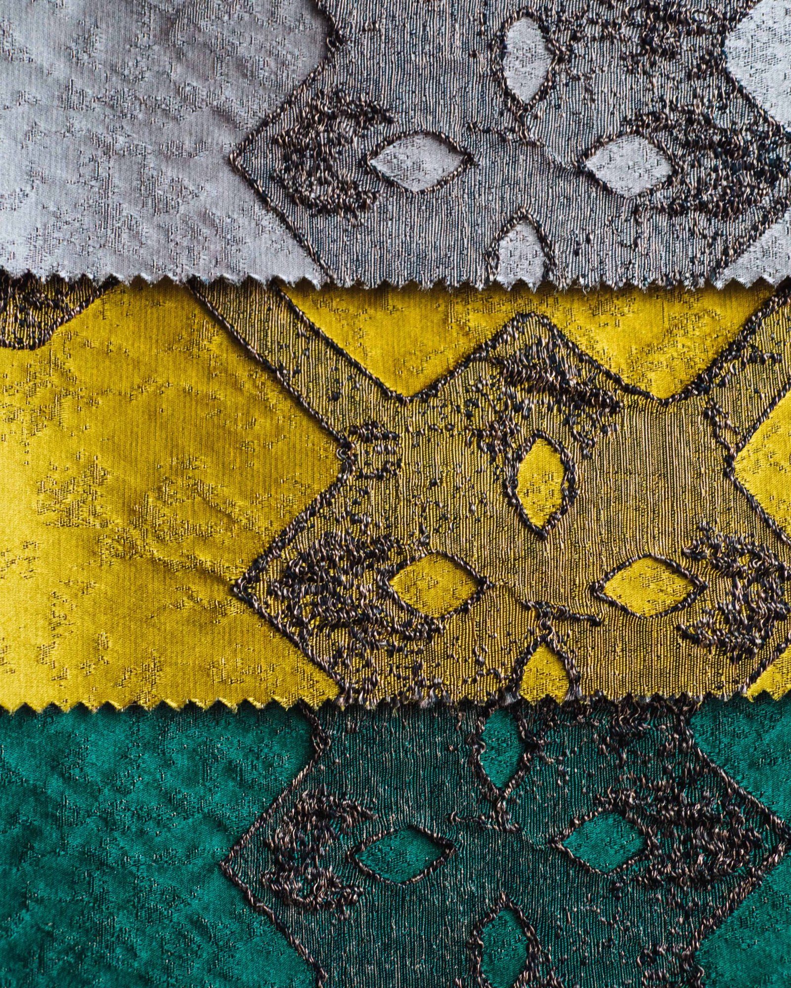 A refined textile sampler showcasing a repeating ornamental motif layered across rich, tactile bands. Soft neutrals are elevated by accents of mustard, emerald, and deep navy, creating a balanced, luxurious composition with subtle metallic depth.
