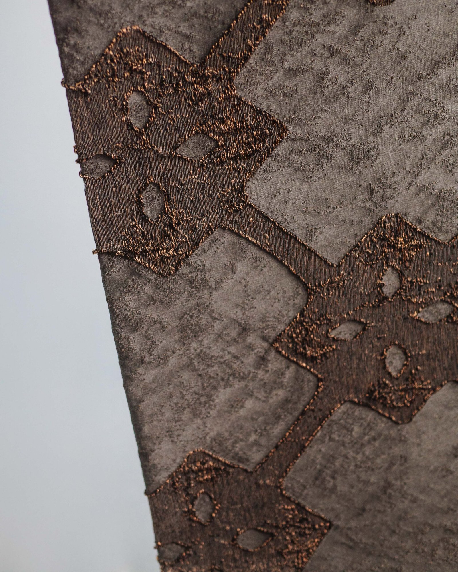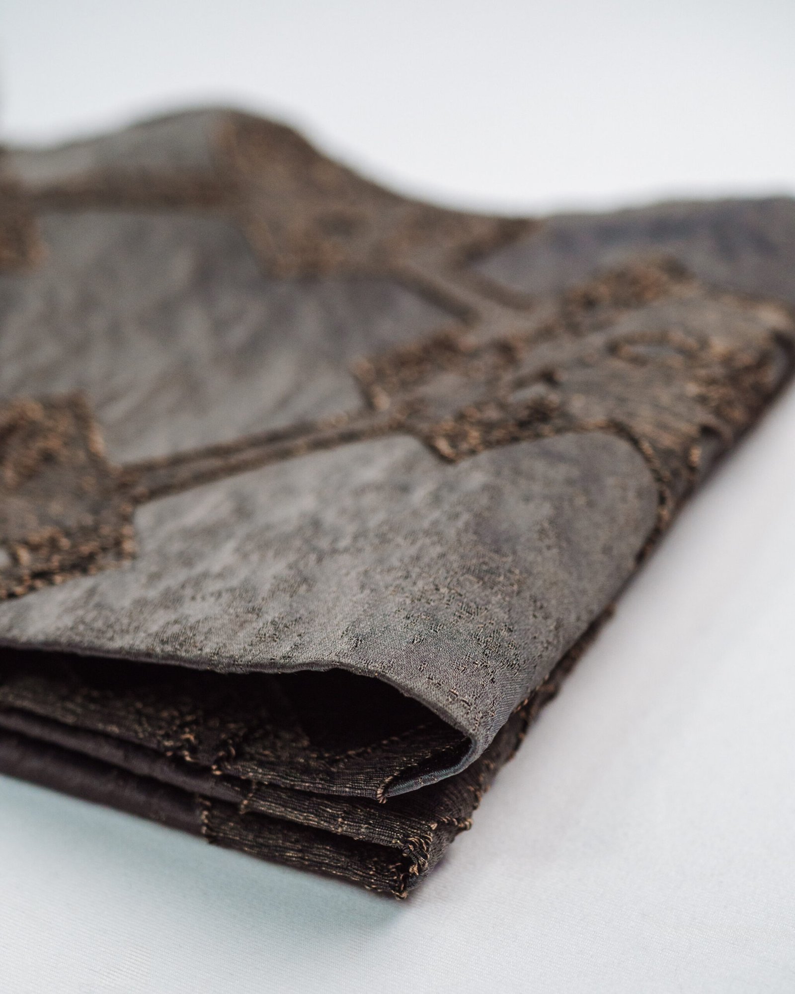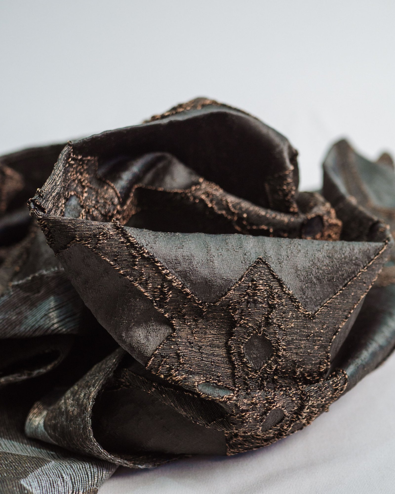 A refined textile sampler showcasing a repeating ornamental motif layered across rich, tactile bands. Soft neutrals are elevated by accents of mustard, emerald, and deep navy, creating a balanced, luxurious composition with subtle metallic depth.