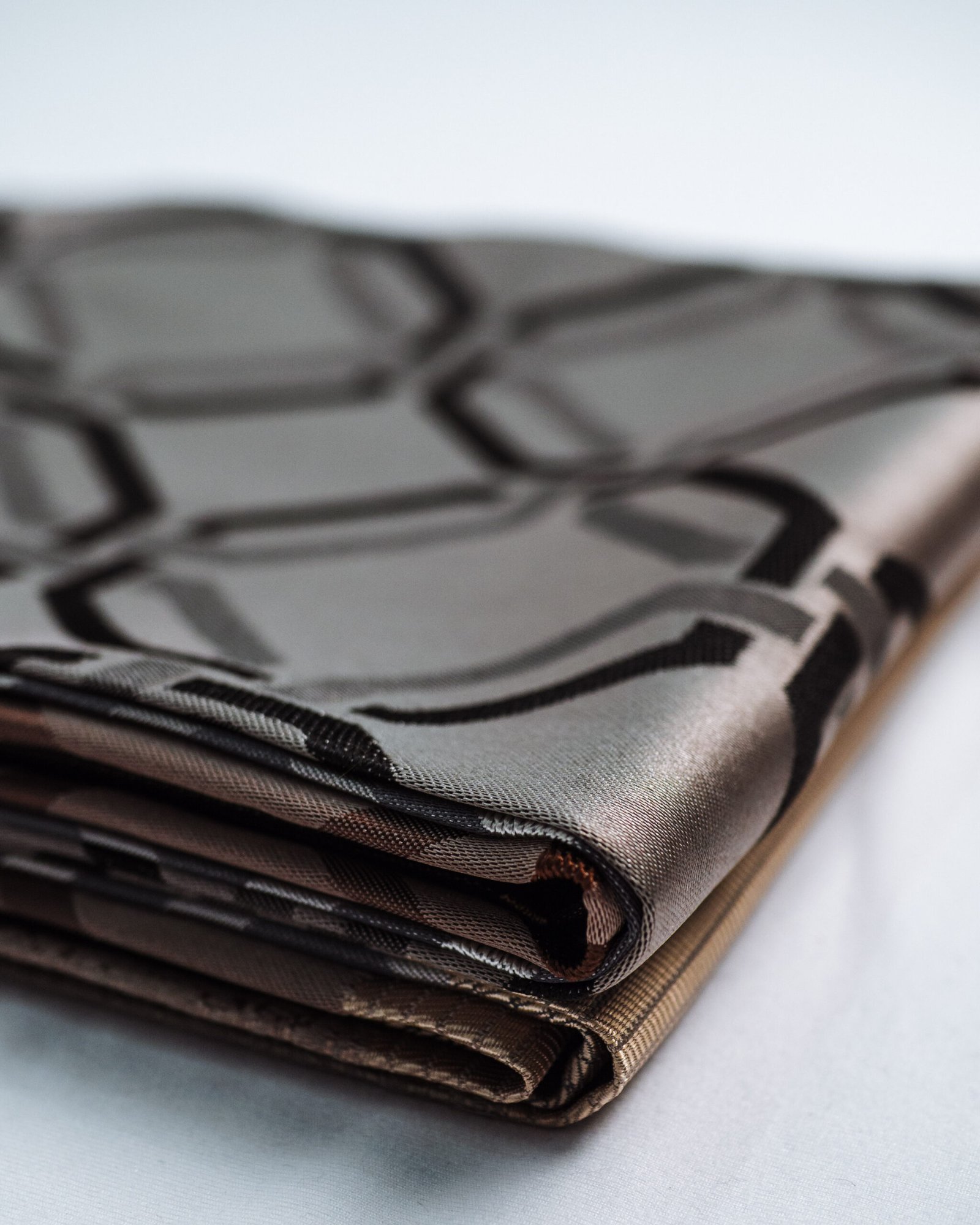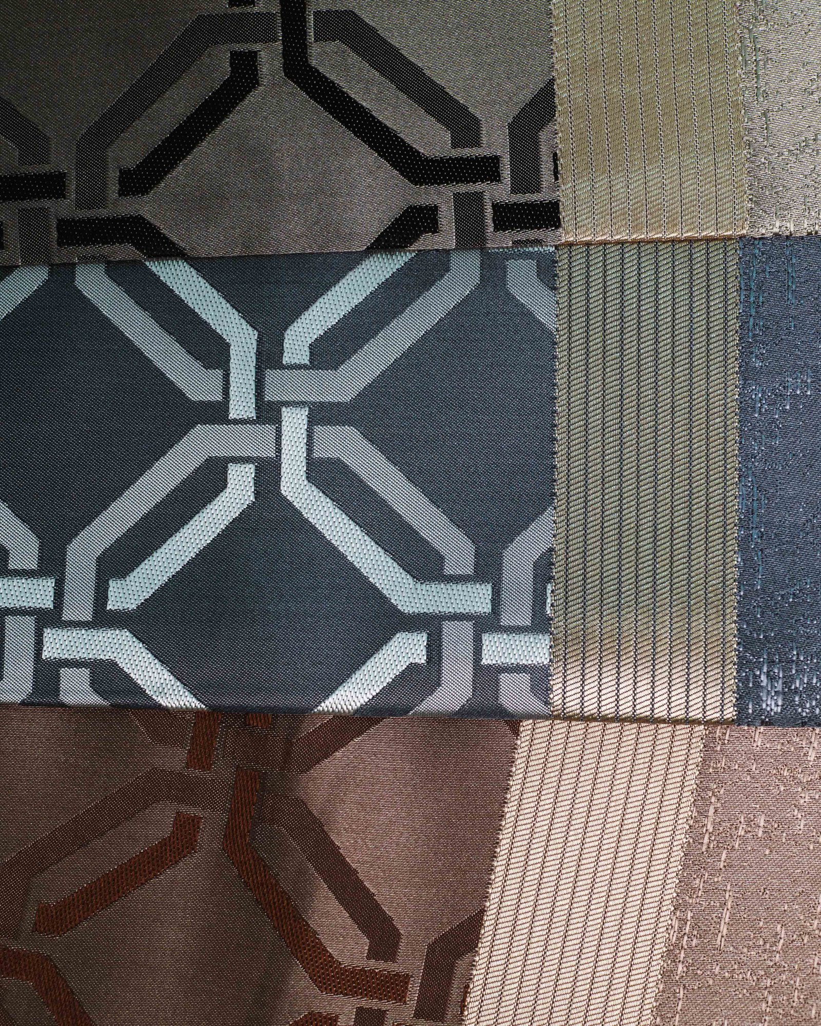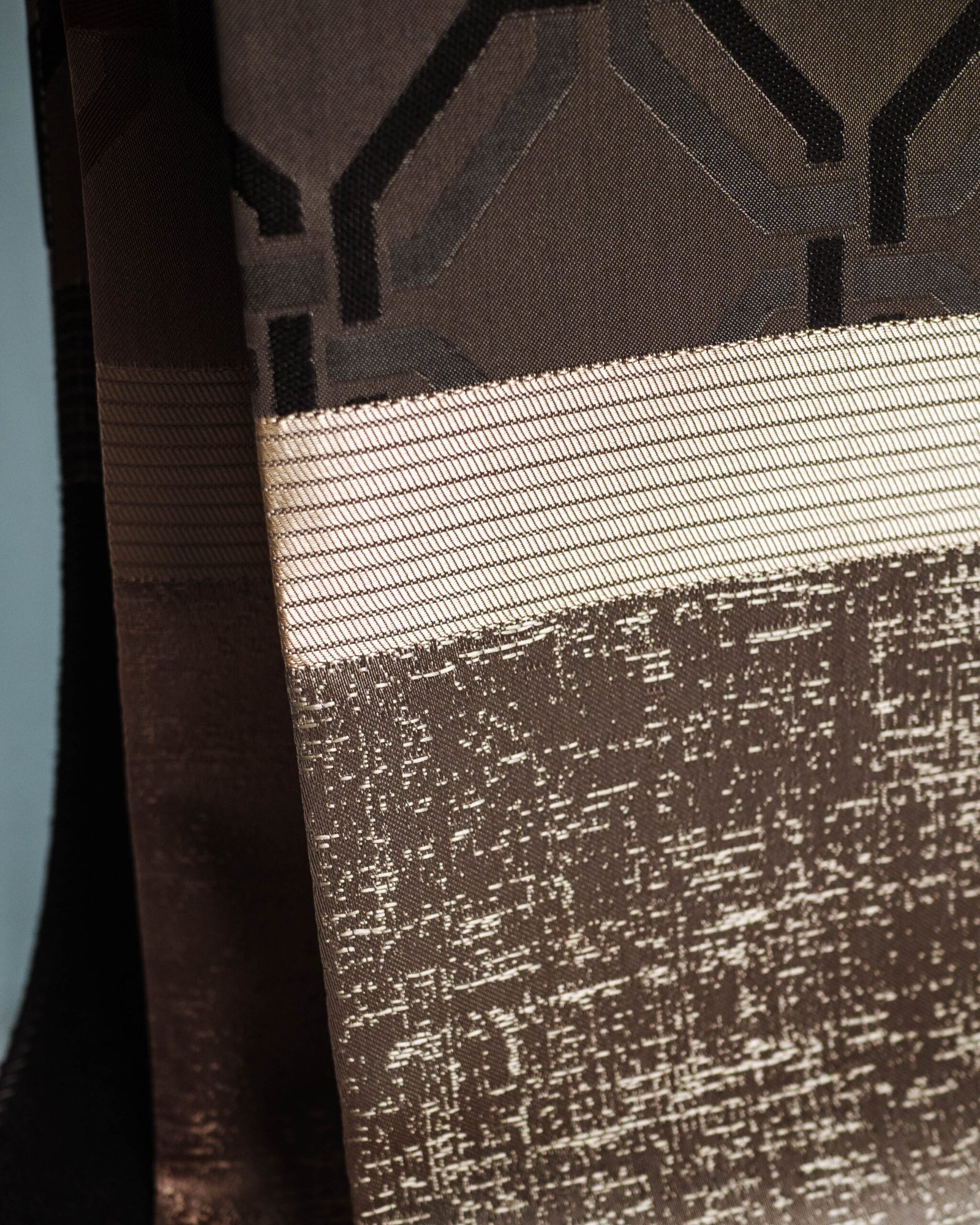 This curtain features a striking architectural lattice pattern woven in rich taupe and charcoal tones, layered over a soft, luminous base for a refined, dimensional effect. The subtle metallic sheen at the lower panel adds a touch of modern luxury, making it an elegant statement for contemporary and upscale interiors.